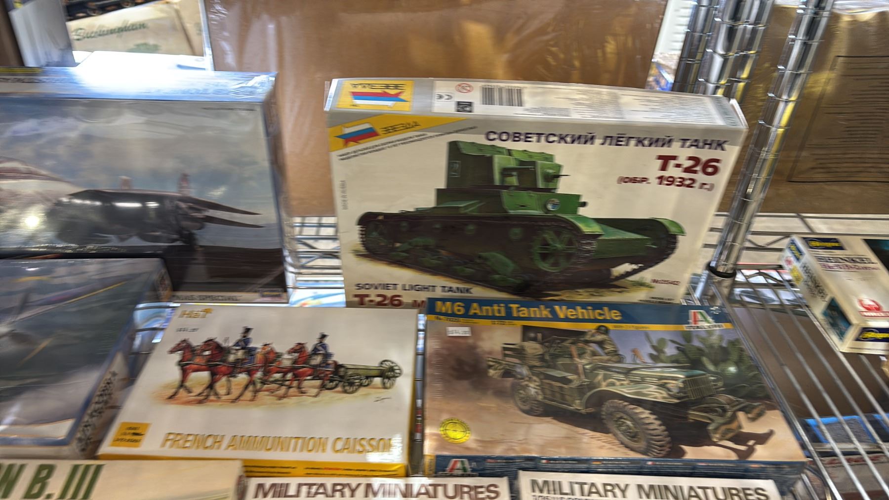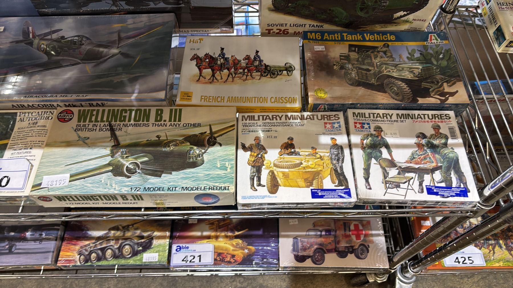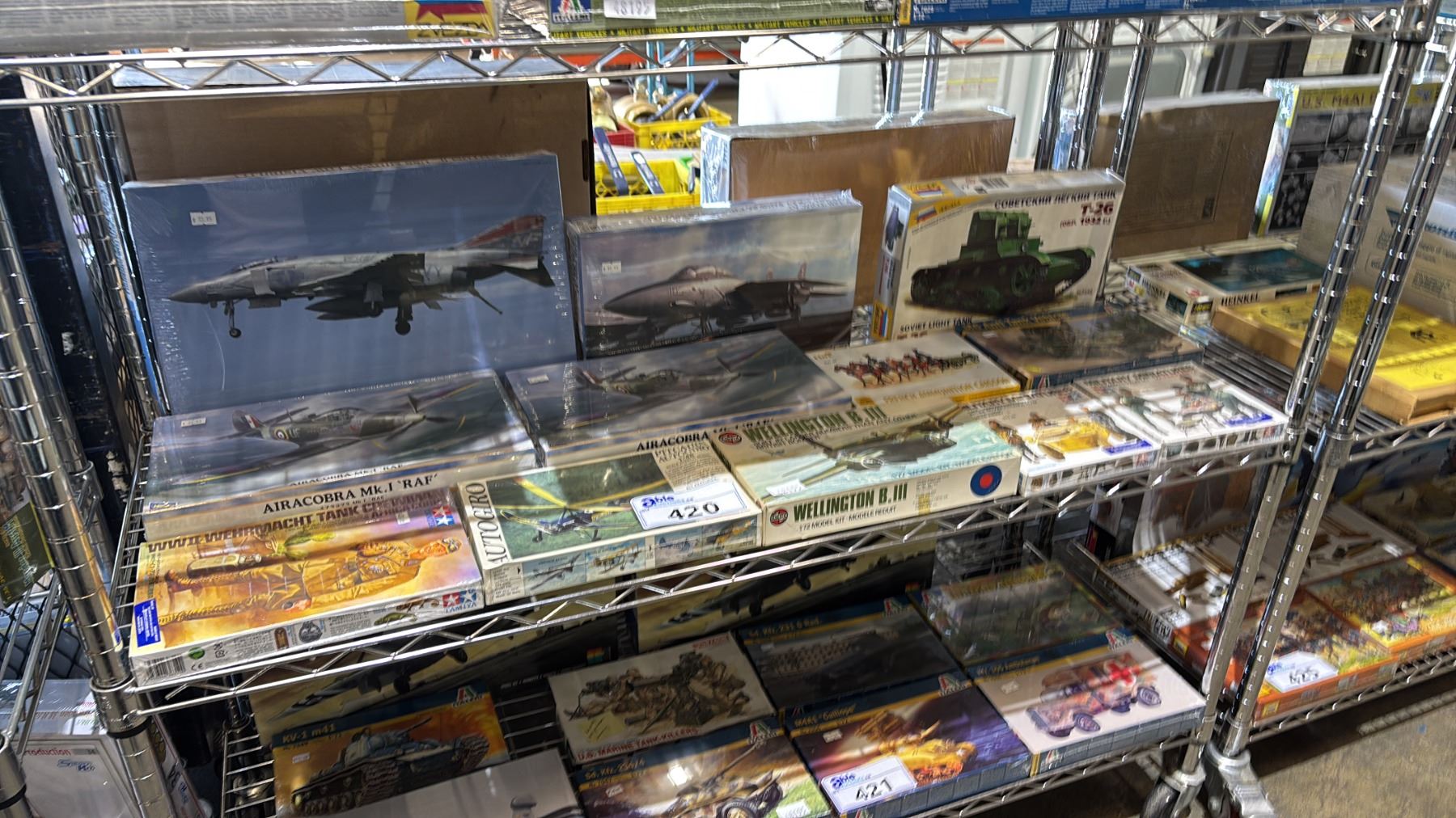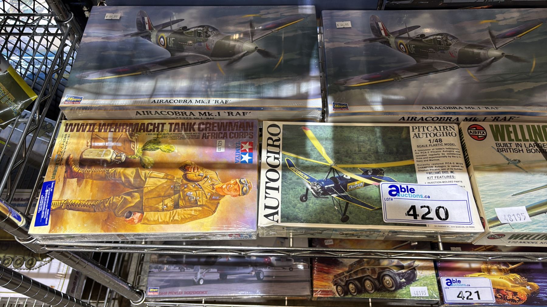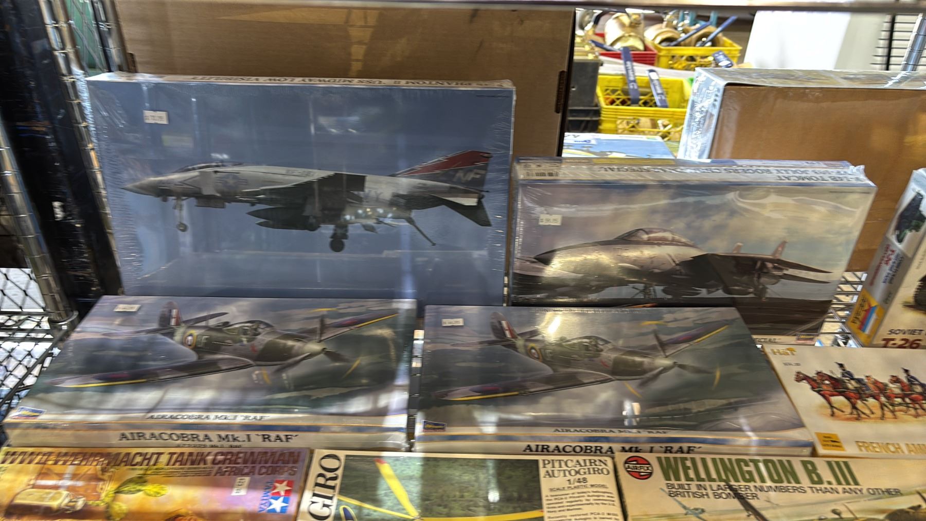SHELF OF ASSORTED MODEL KITS: AIRPLANES, ANTI TANK VEHICLE, TANK, MILITARY MINIATURES & MORE