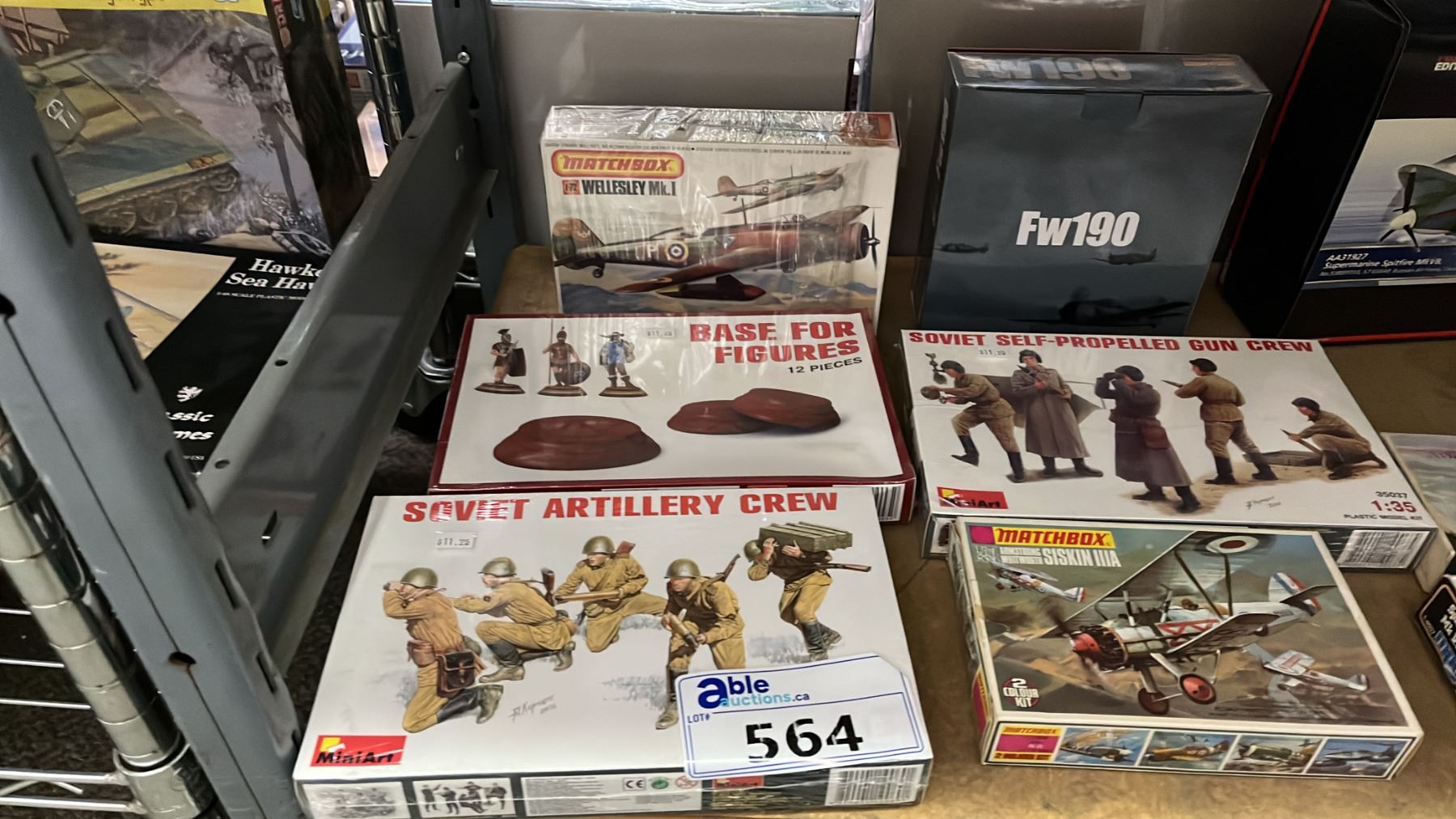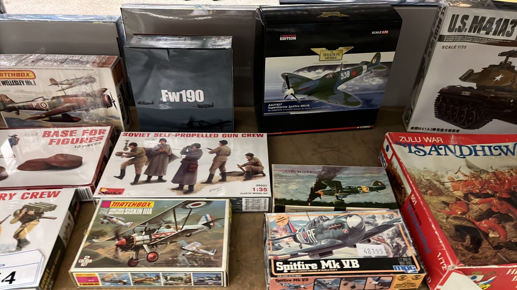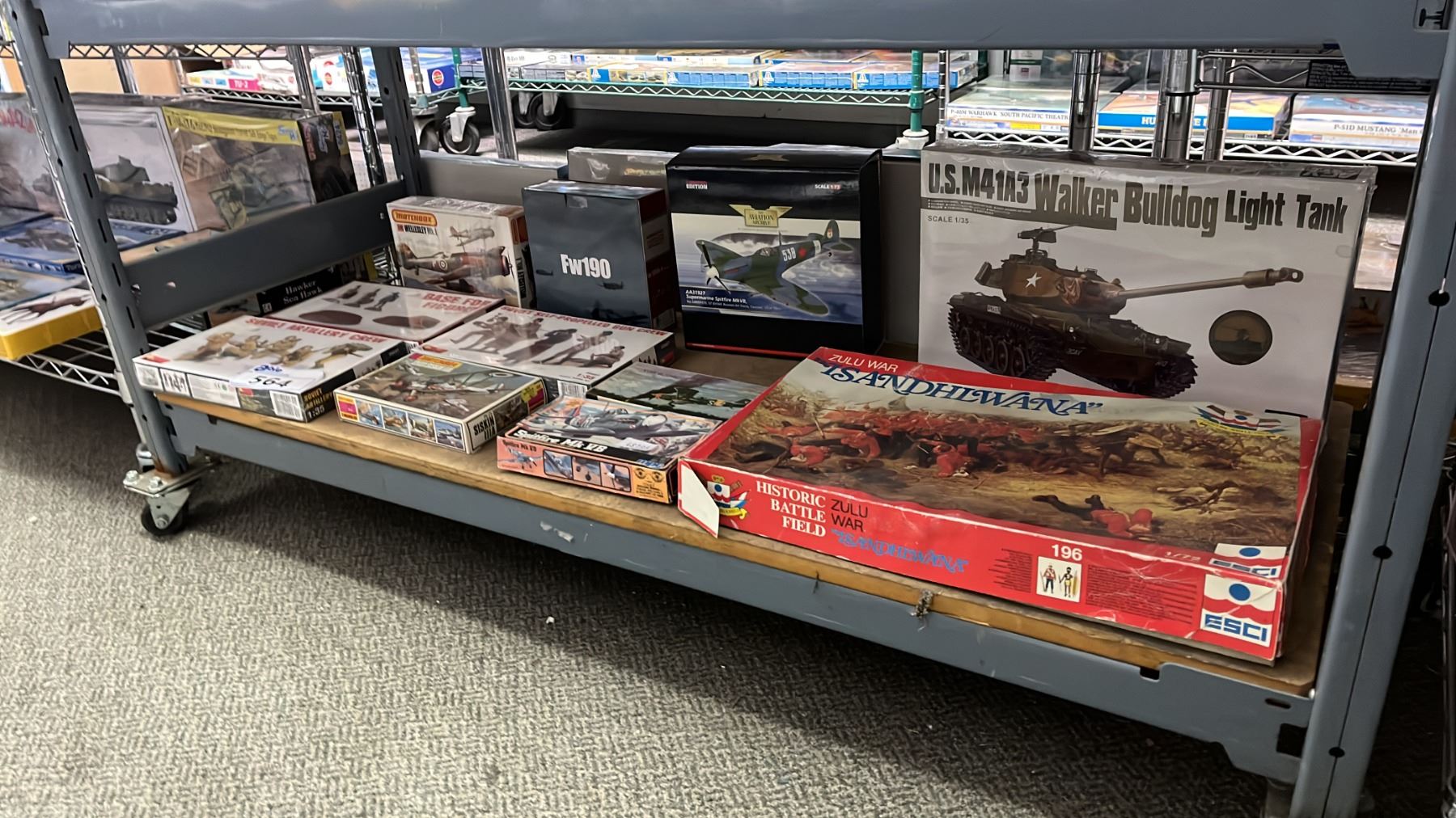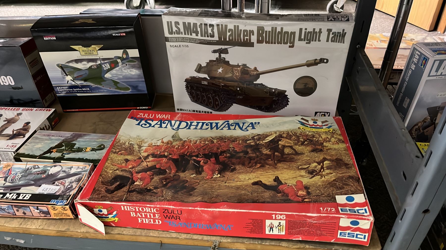 SHELF OF ASSORTED MODEL KITS: AIRPLANES, TANK & ASSORTED FIGURE KITS