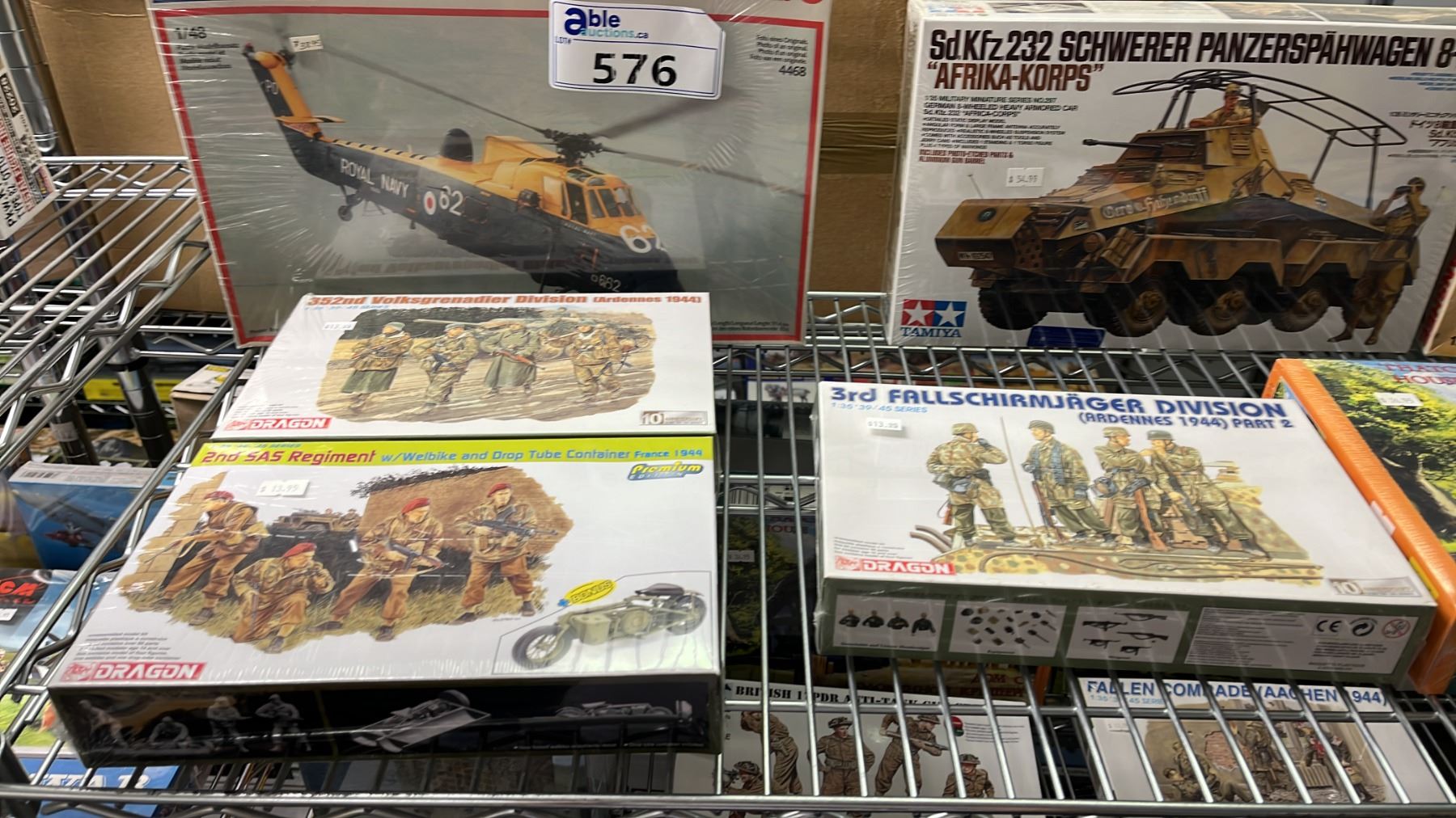 SHELF OF ASSORTED MODEL KITS: BUILDINGS & ASSORTED MILITARY FIGURE SETS