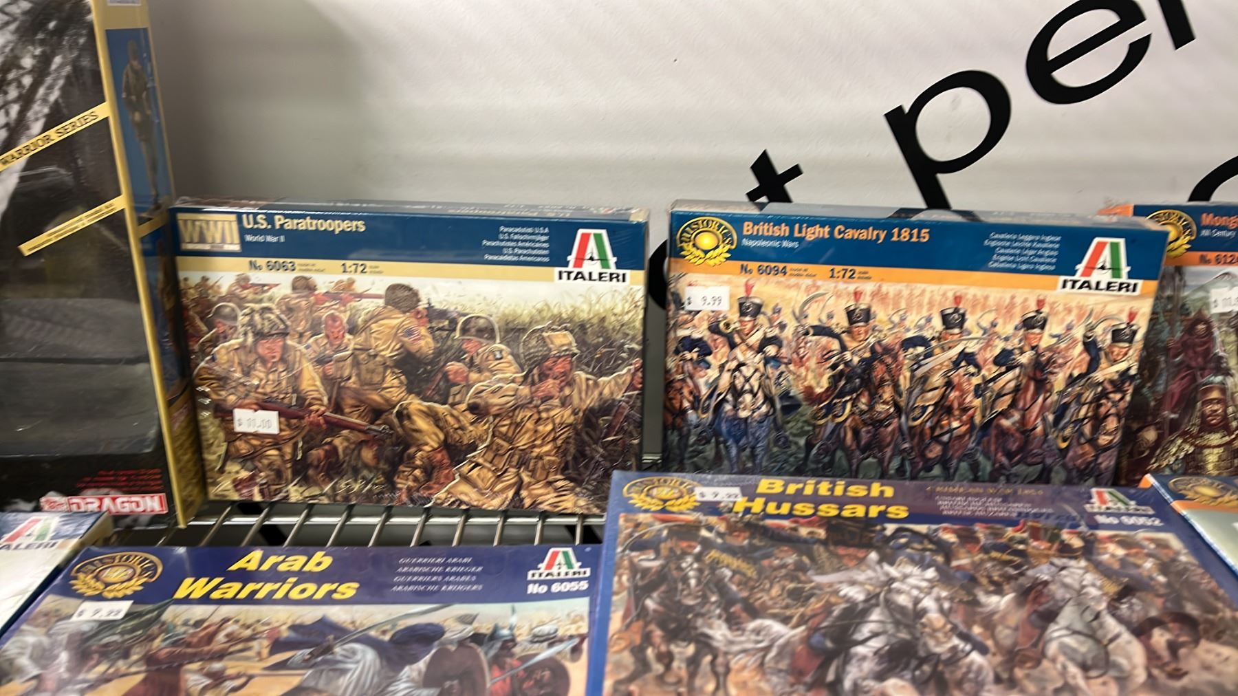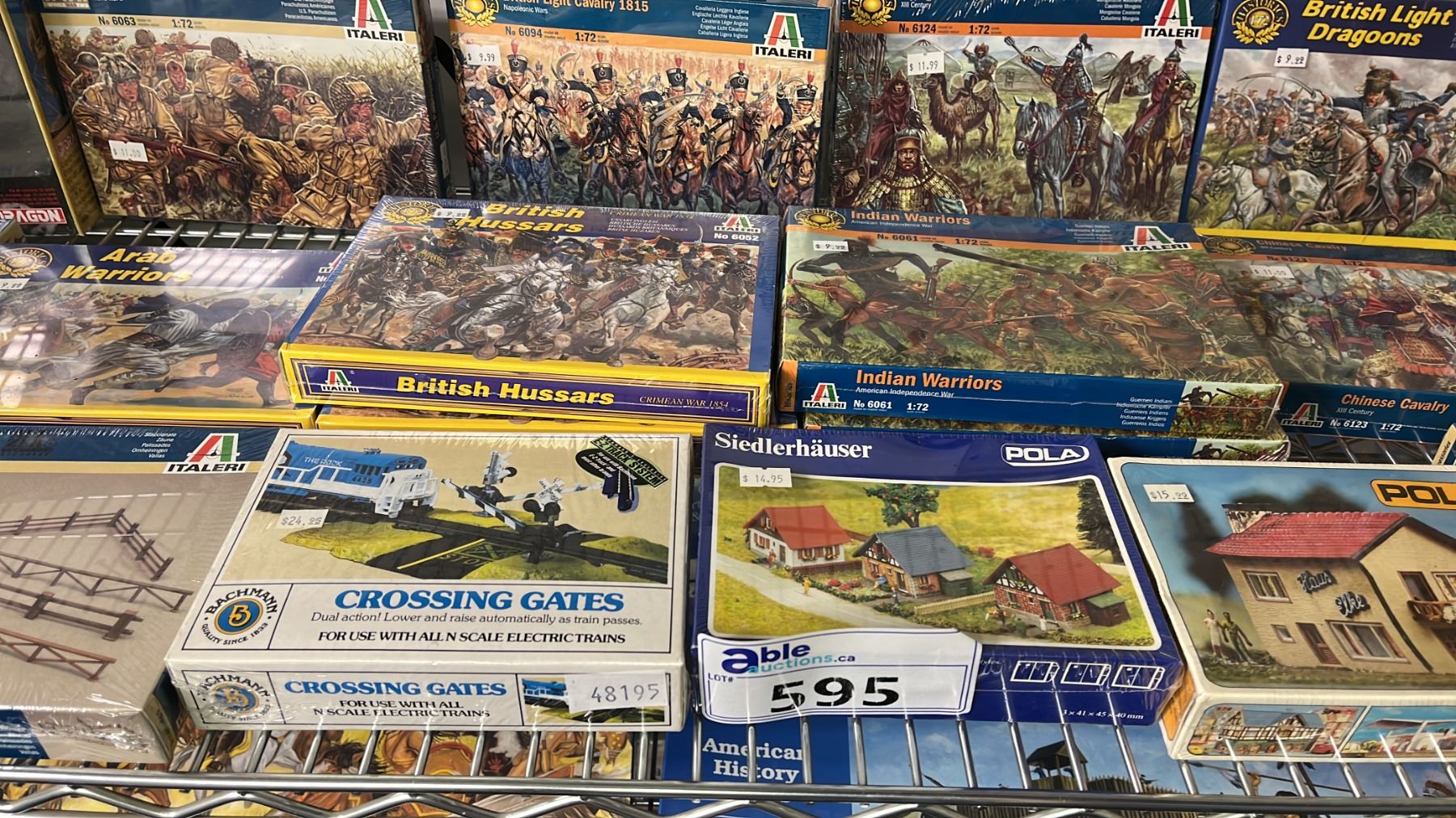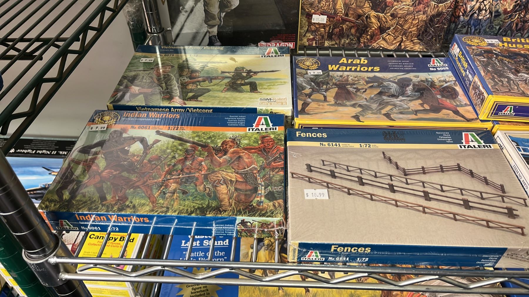 SHELF OF ASSORTED MODEL KITS: BUILDINGS, CROSSING GATES, FENCES & ASSORTED MILITARY FIGURES