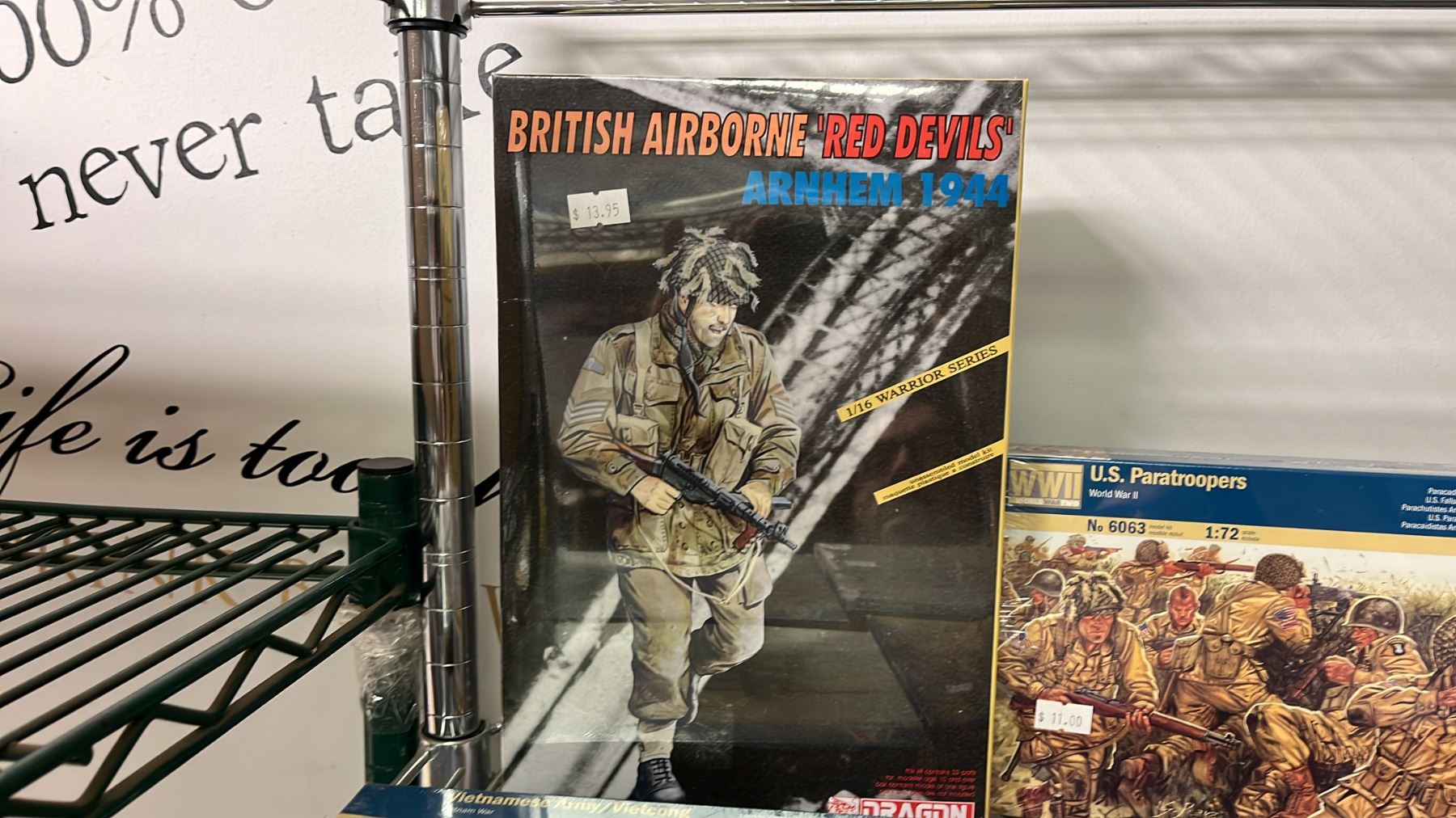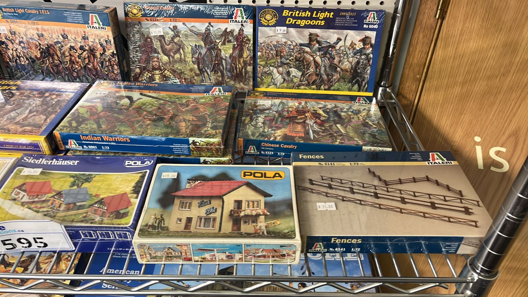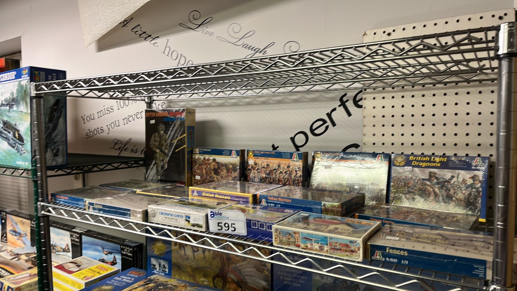 SHELF OF ASSORTED MODEL KITS: BUILDINGS, CROSSING GATES, FENCES & ASSORTED MILITARY FIGURES