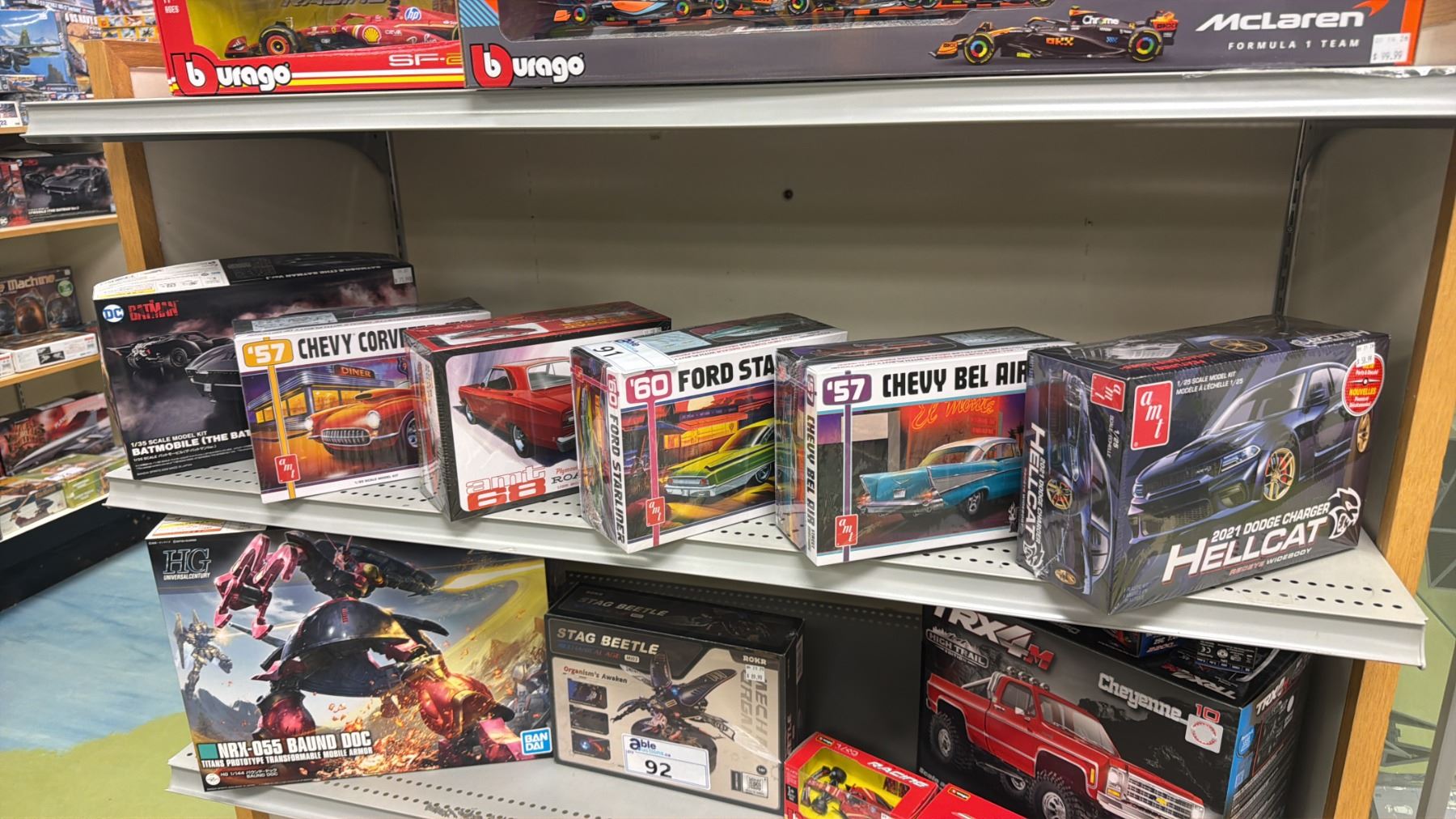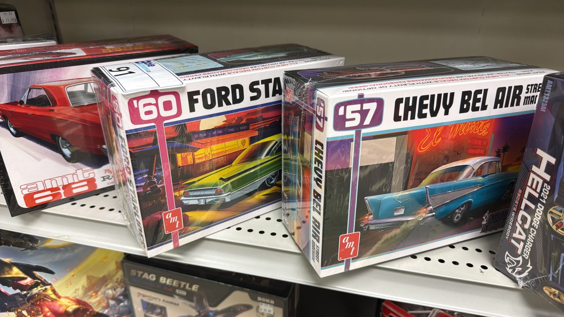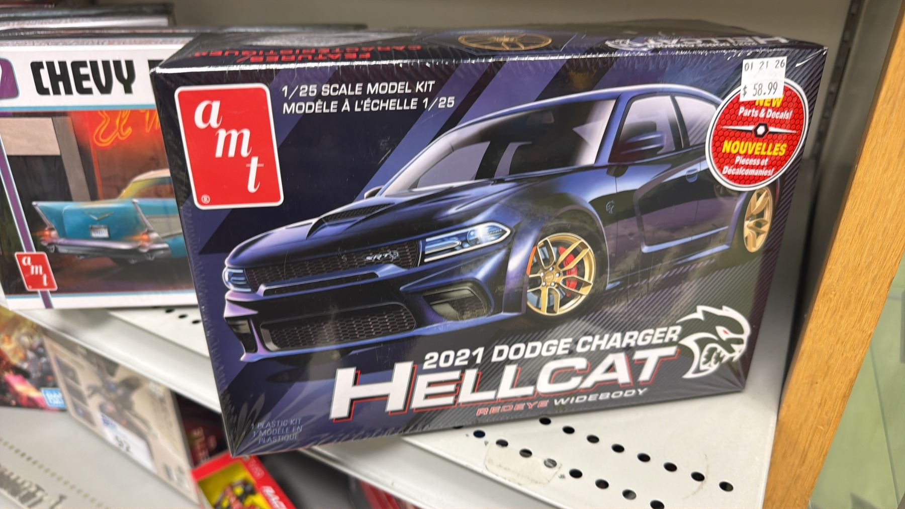 SHELF OF ASSORTED MODEL KITS INCLUDING; 2021 DODGE CHALLENGER HELLCAT, 1957 CHEVY BEL AIR, 1960 FORD