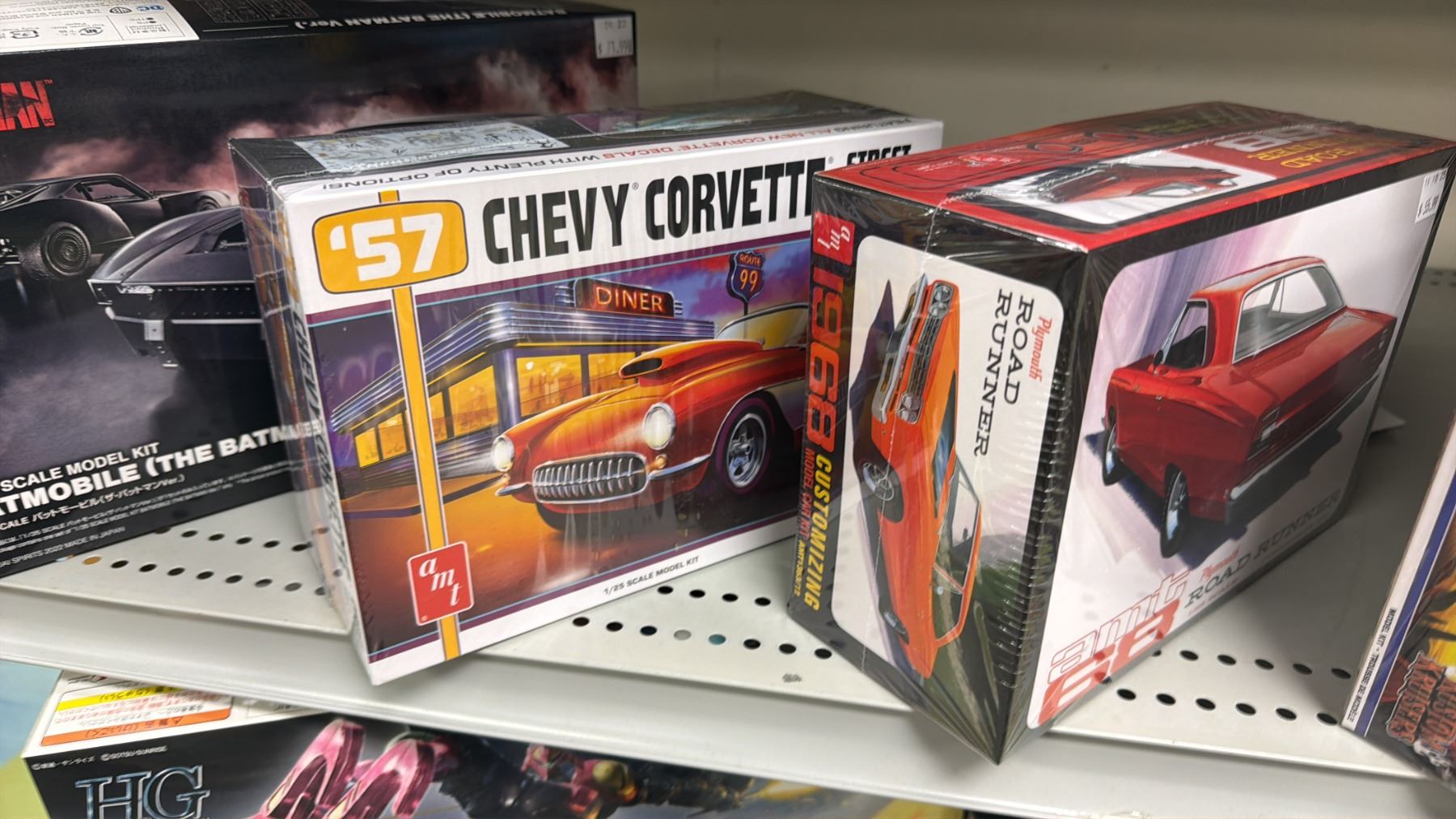 SHELF OF ASSORTED MODEL KITS INCLUDING; 2021 DODGE CHALLENGER HELLCAT, 1957 CHEVY BEL AIR, 1960 FORD STARLINER & MORE