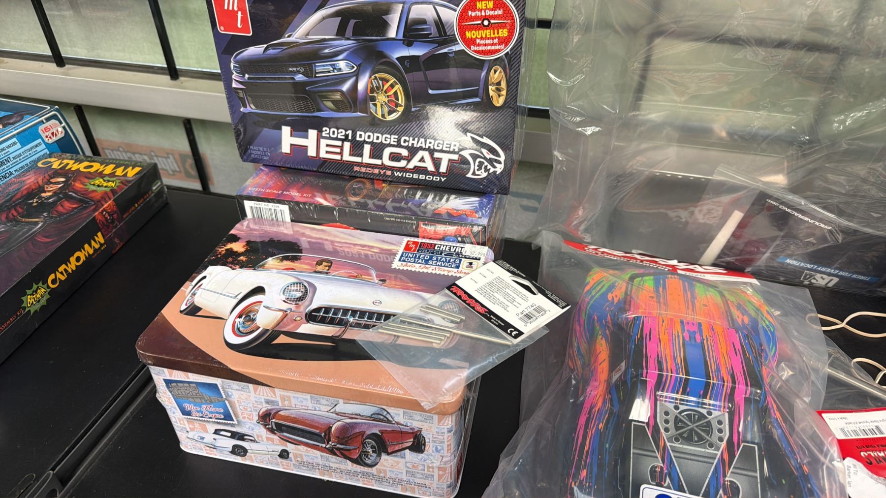 SHELF OF ASSORTED MODEL KITS INCLUDING; 2021 DODGE CHARGER HELLCAT, F-350 SUPER DUTY PLATINUM, 1967 FORD MUSTANG & MORE