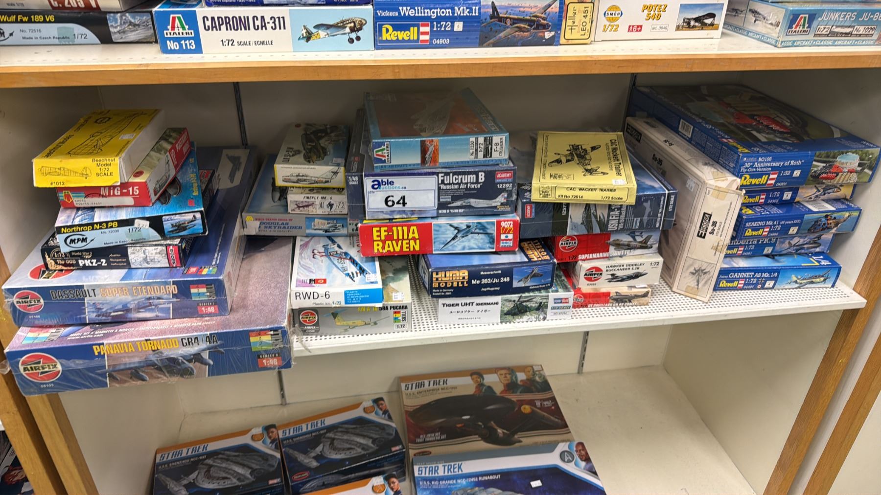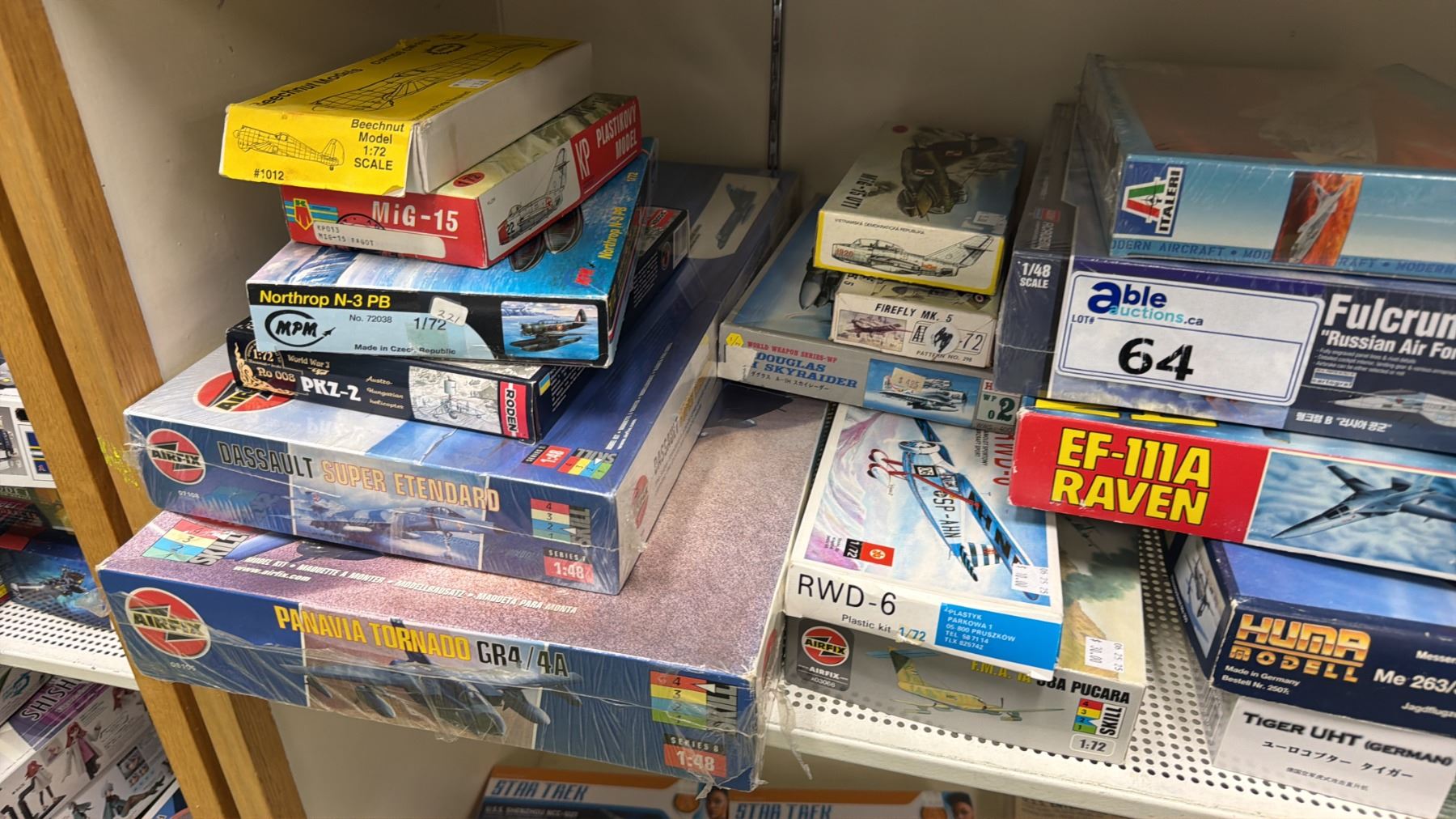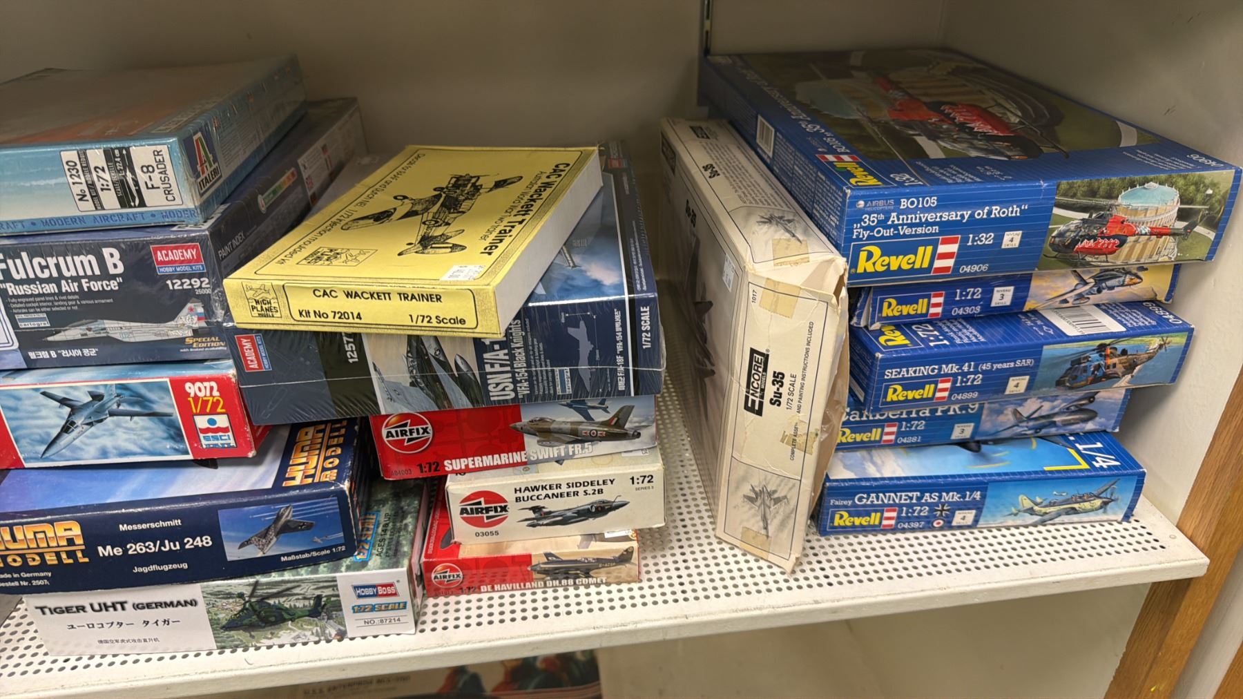 SHELF OF ASSORTED MODEL KITS INCLUDING; EF-111A RAVEN, PANAVIA TORNADO GR4, FULCRUM B RUSSIAN AIR FORCE & MORE
