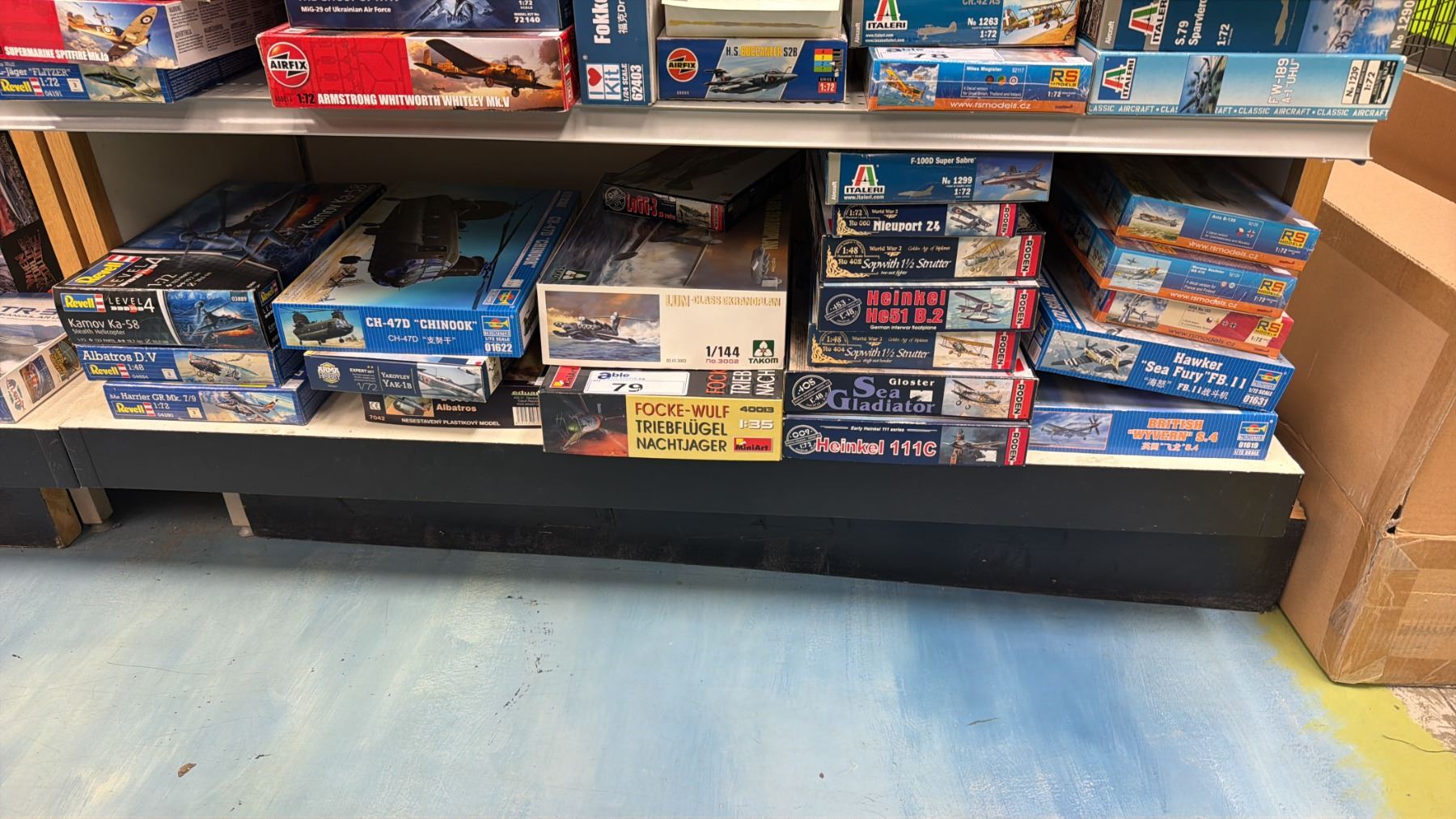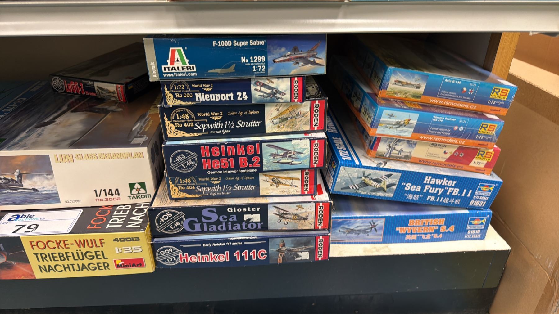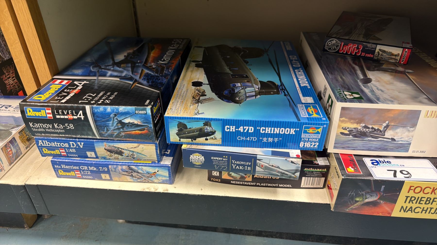 SHELF OF ASSORTED MODEL KITS INCLUDING; HAWKER "SEA FURY" PB.11, HEINKEL 111C, CH-47D CHINOOK & MORE