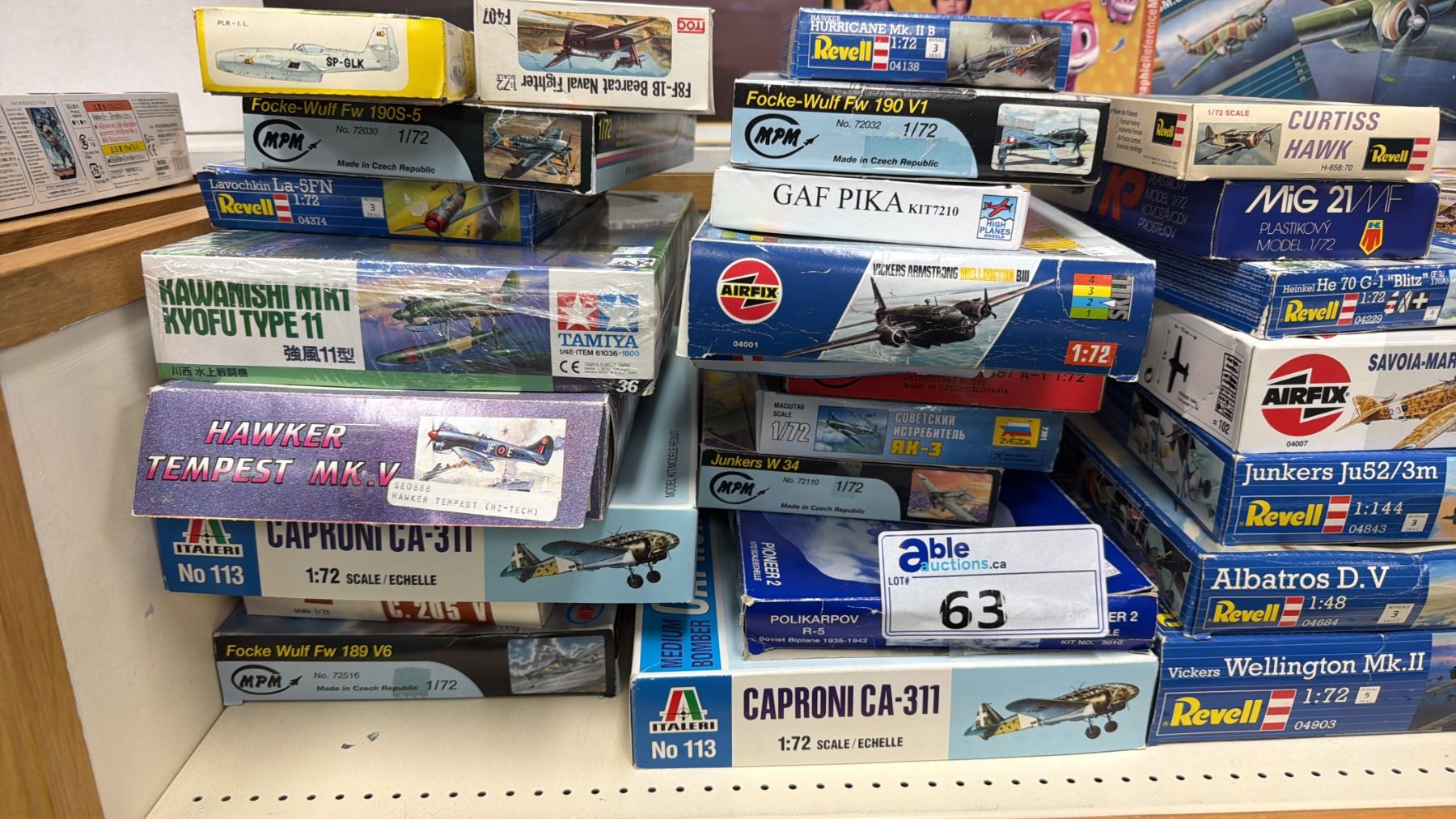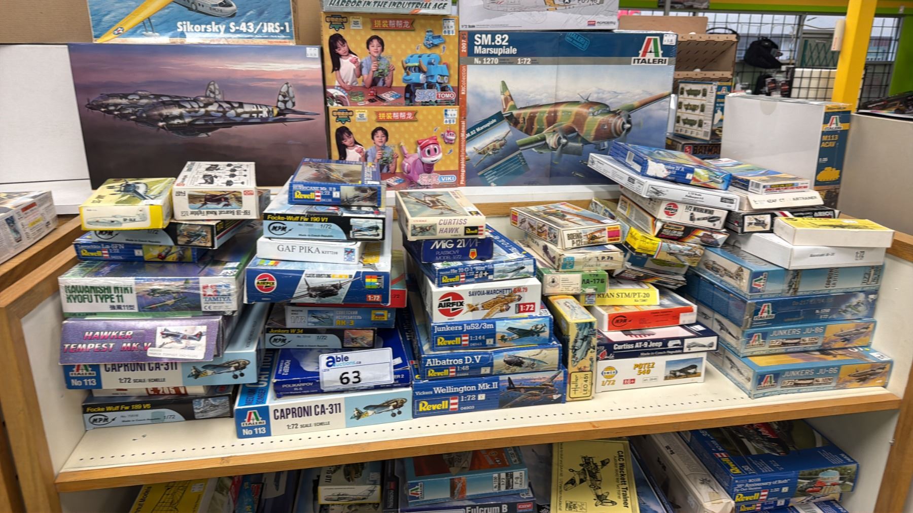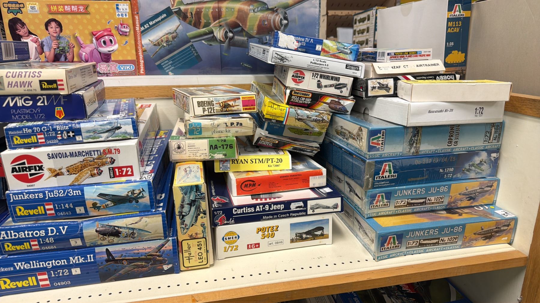 SHELF OF ASSORTED MODEL KITS INCLUDING; SM.82 MARSUPIALE, CURTISS HAWK, ABLATROS D.V. & MORE