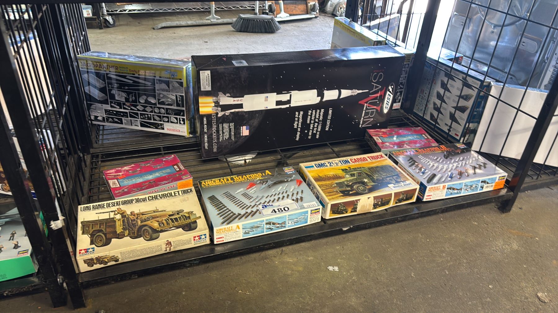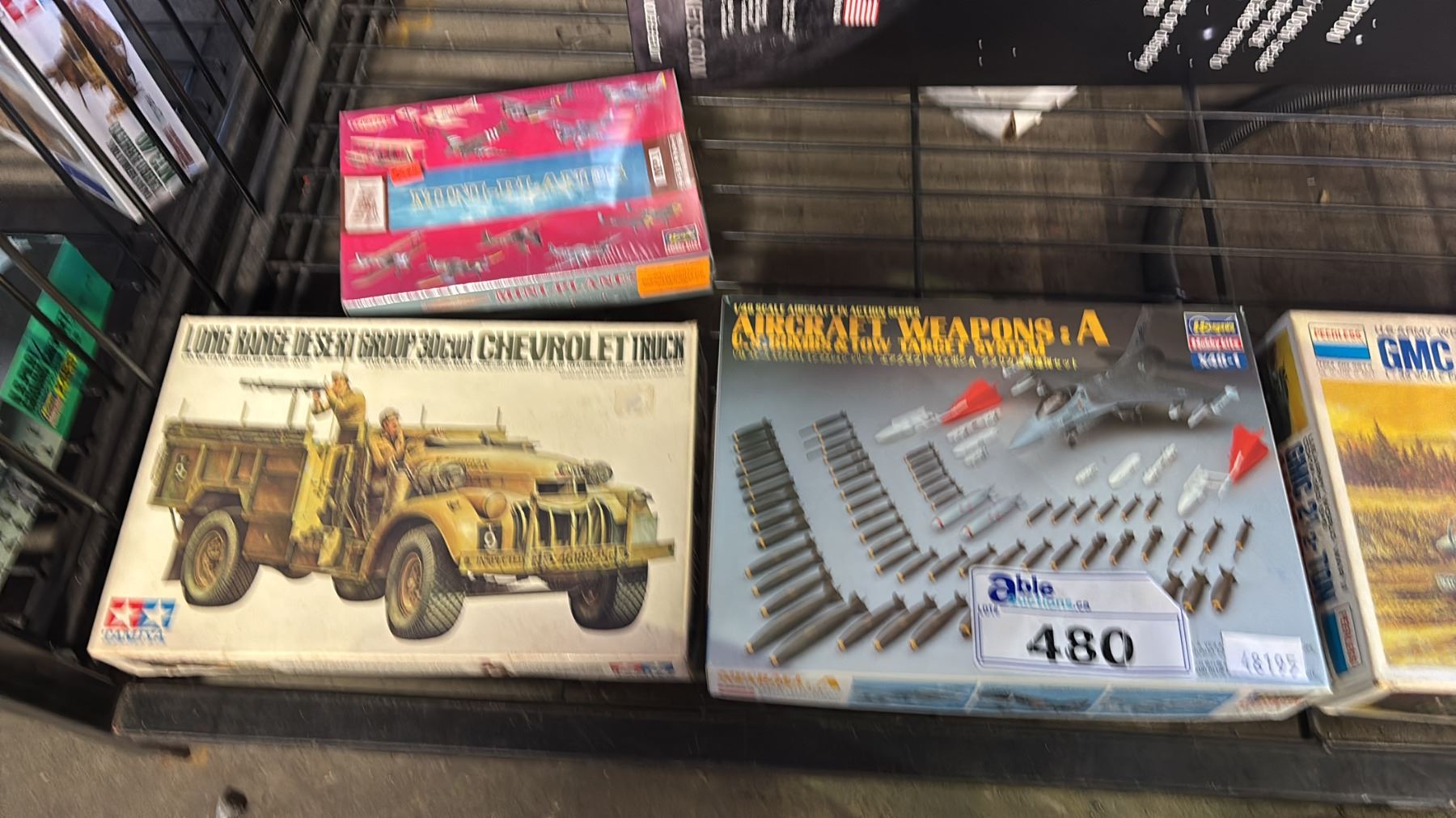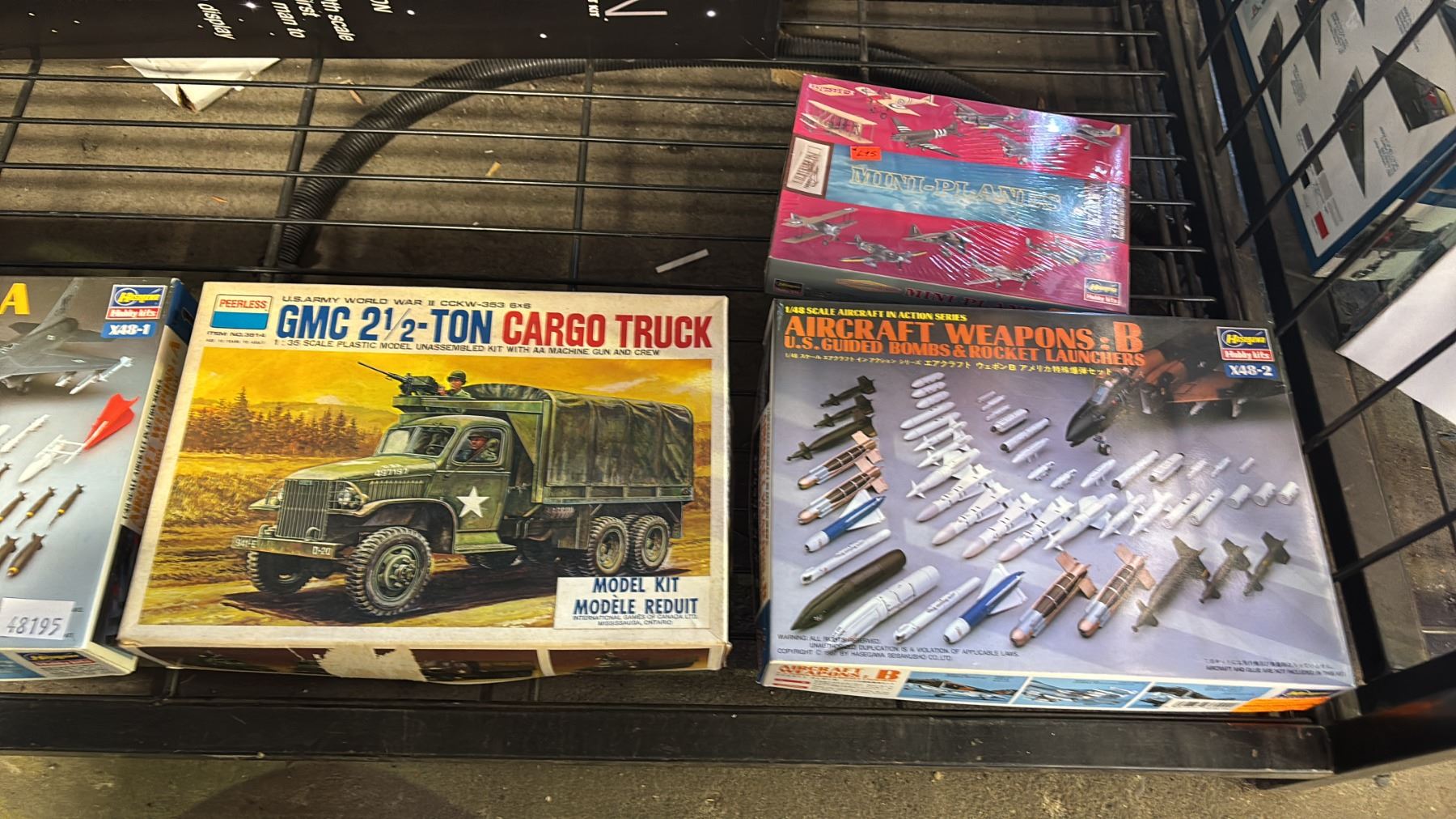 SHELF OF ASSORTED MODEL KITS: MILITARY VEHICLES, AIRCRAFT WEAPONS, AIRPLANES & ROCKET