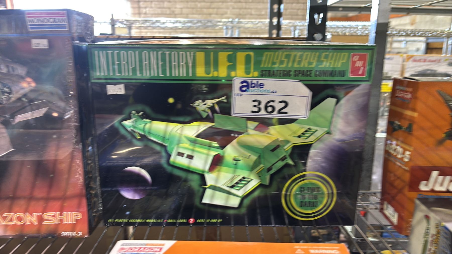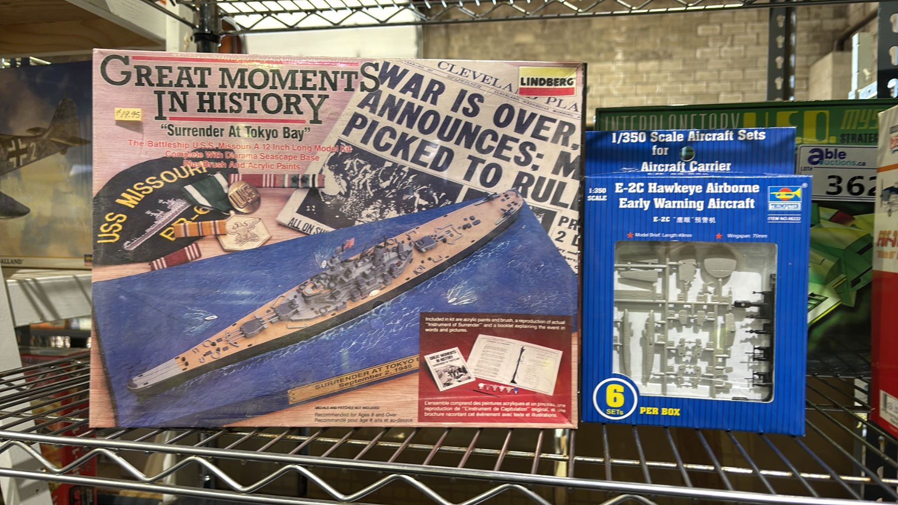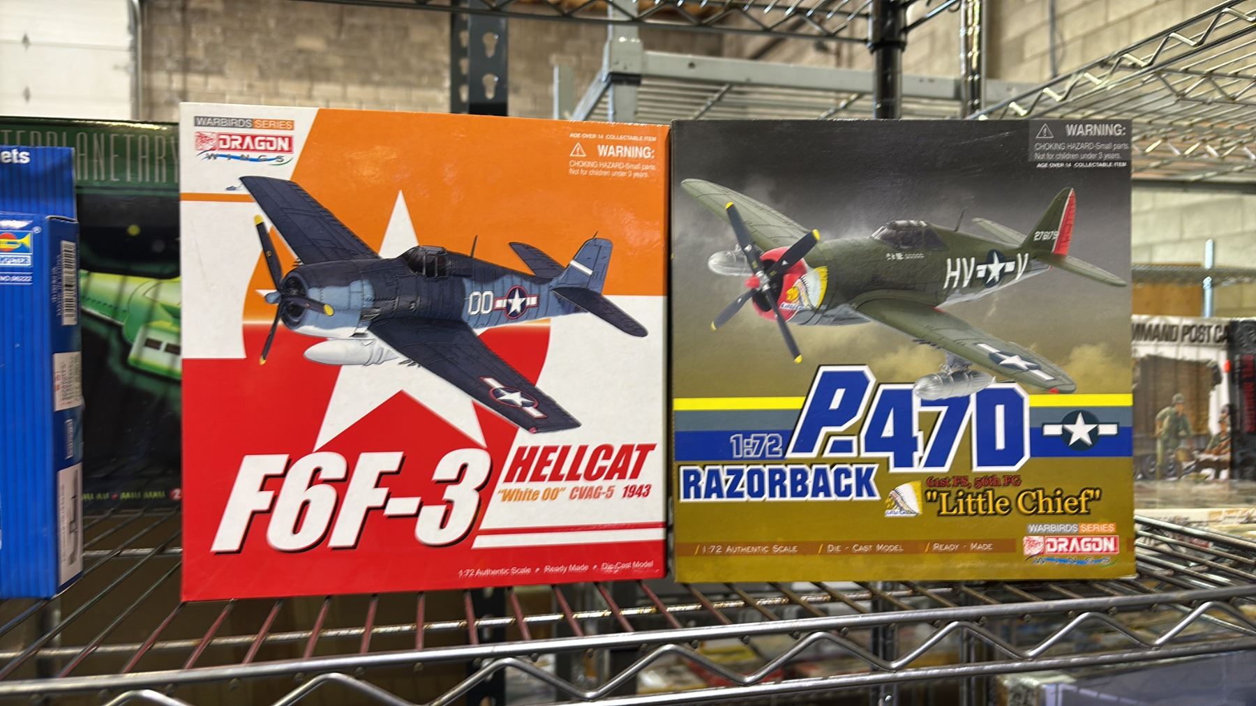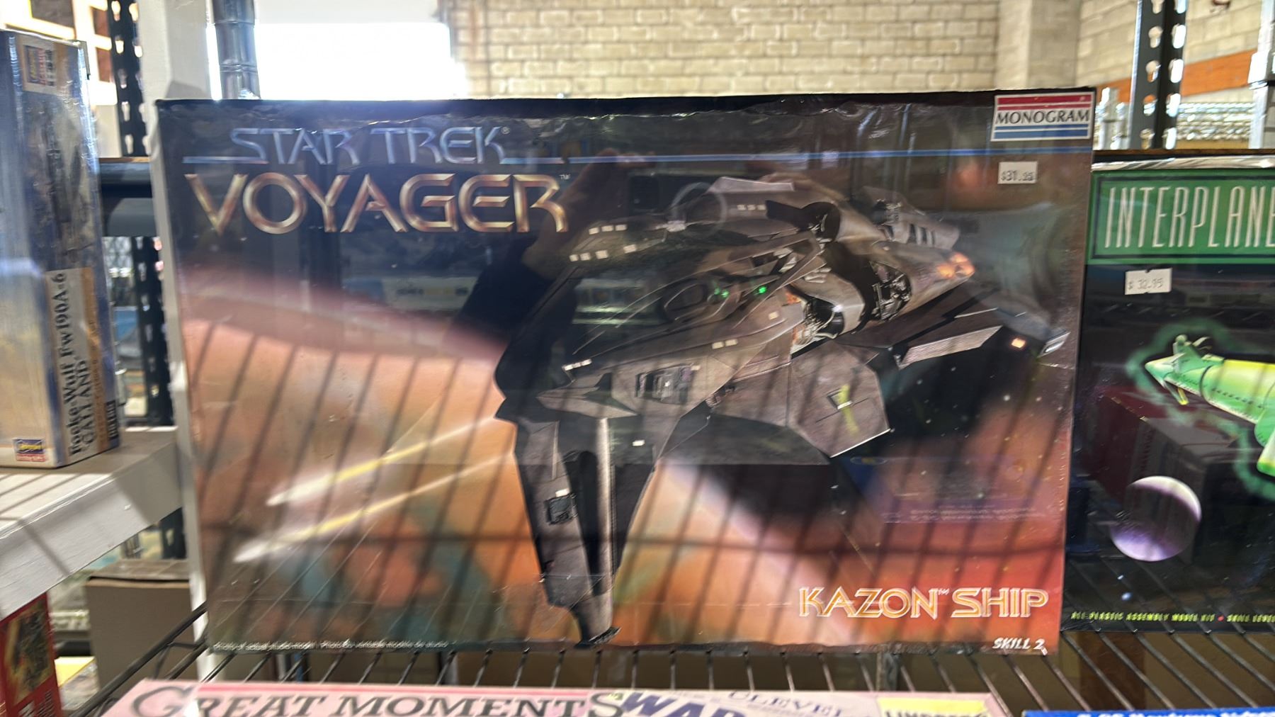 SHELF OF ASSORTED MODEL KITS: STAR TREK VOYAGER KAZON SHIP, F6F-3 HELLCAT, P-47 RAZORBACK & MORE
