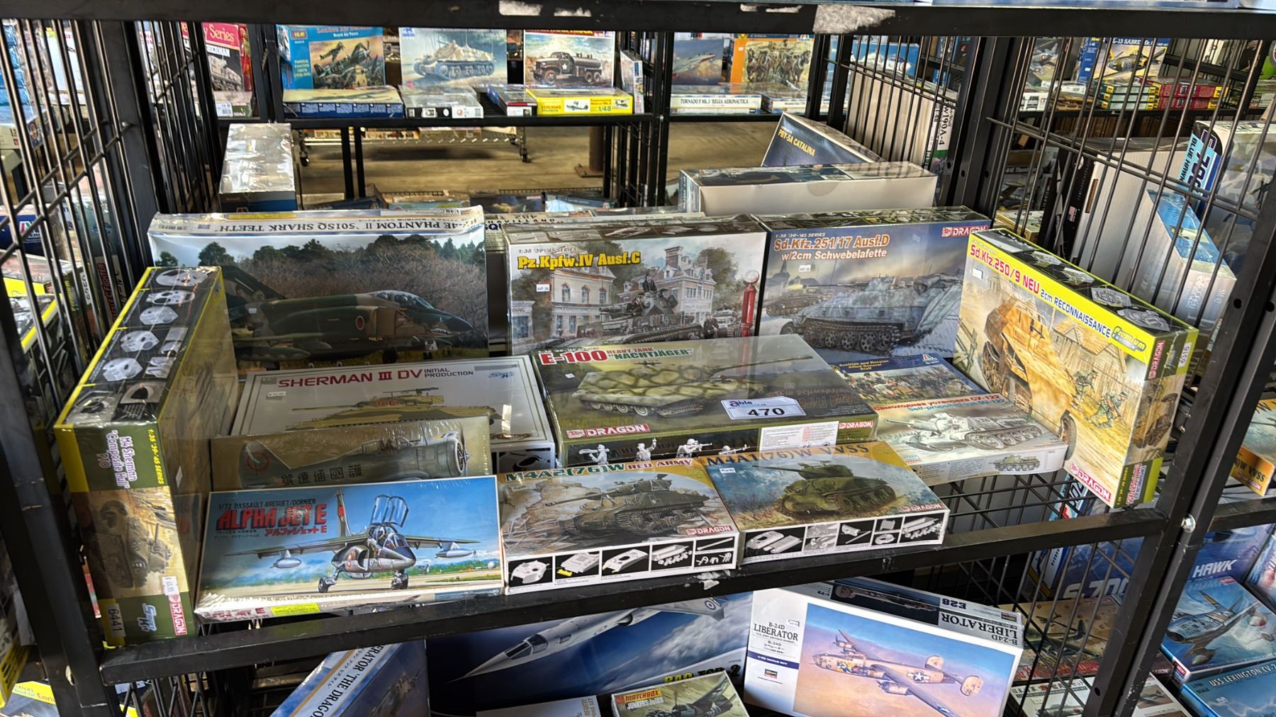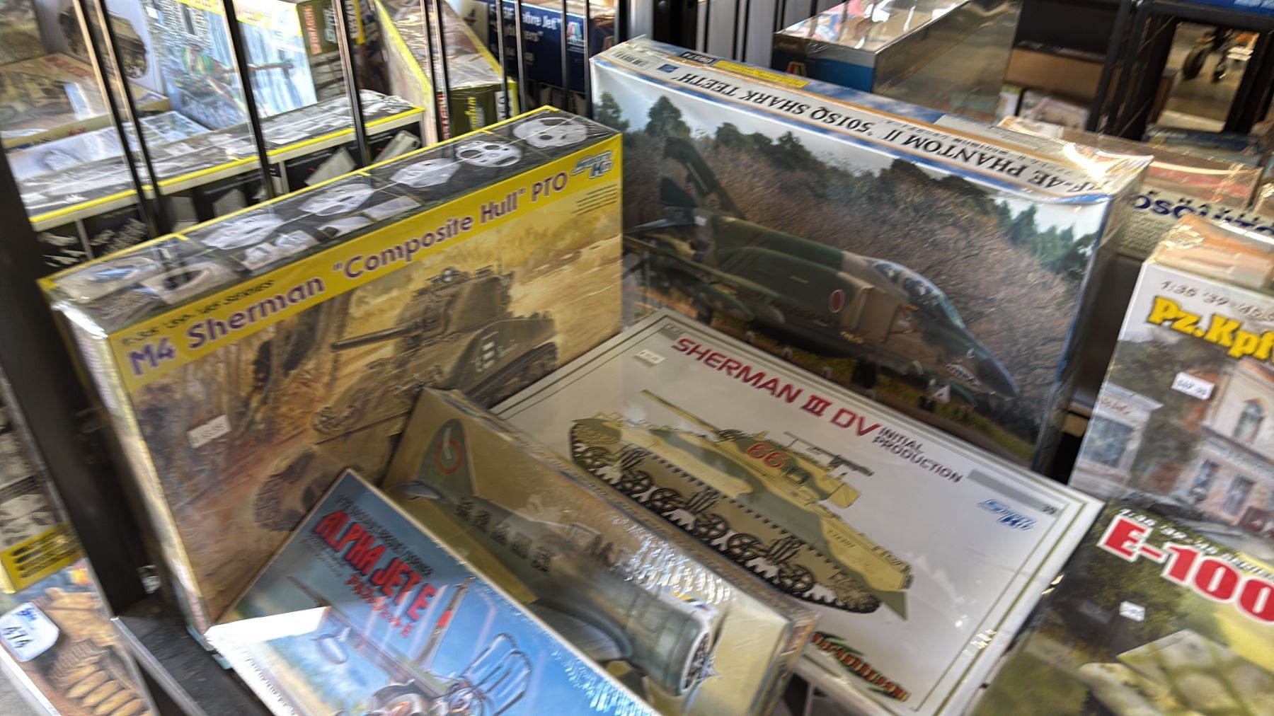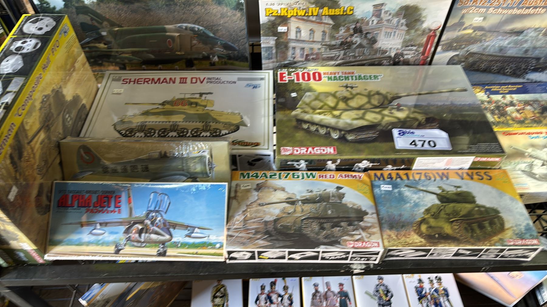 SHELF OF ASSORTED MODEL KITS, TANKS, AIRPLANES & FIGURES