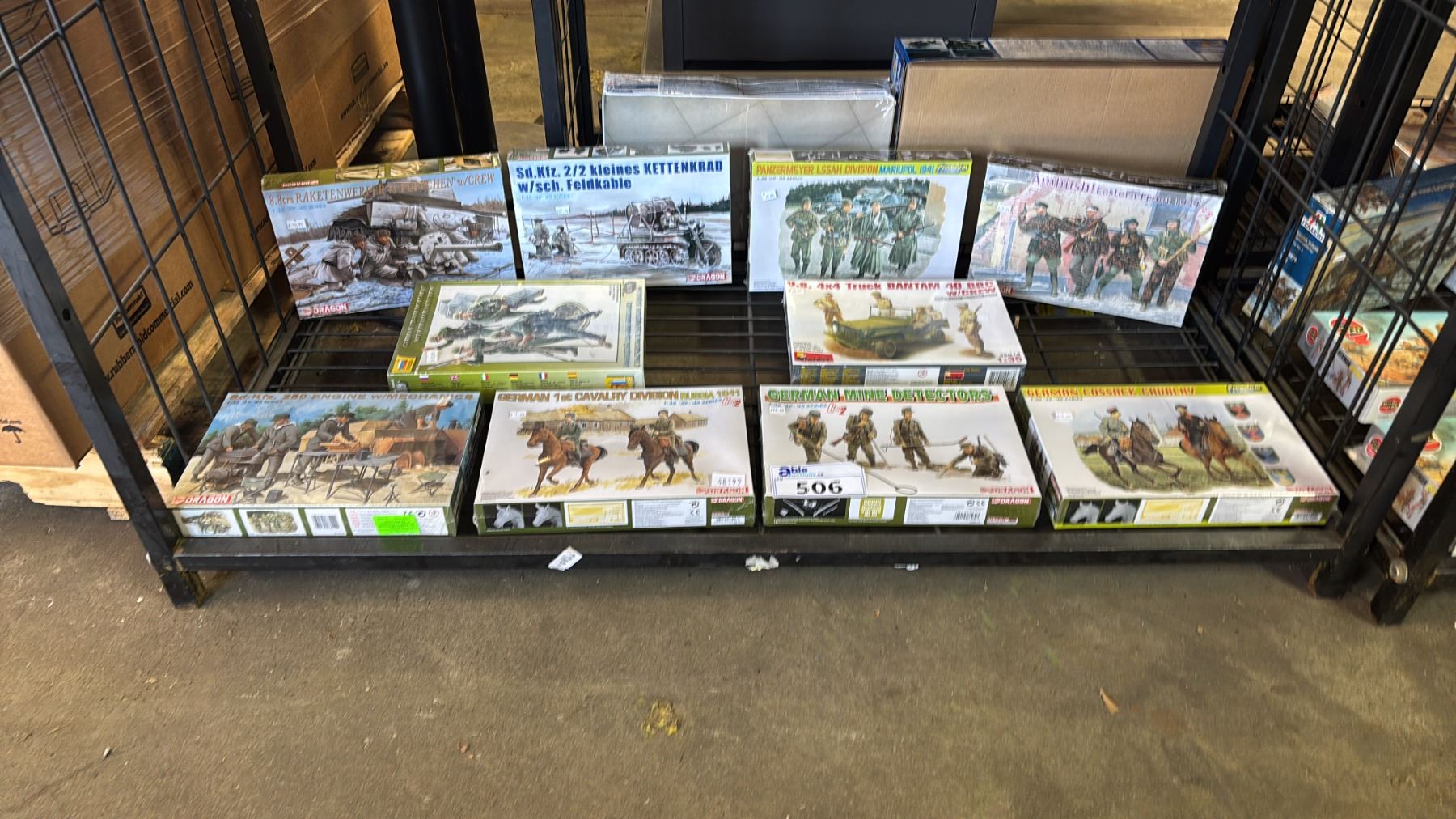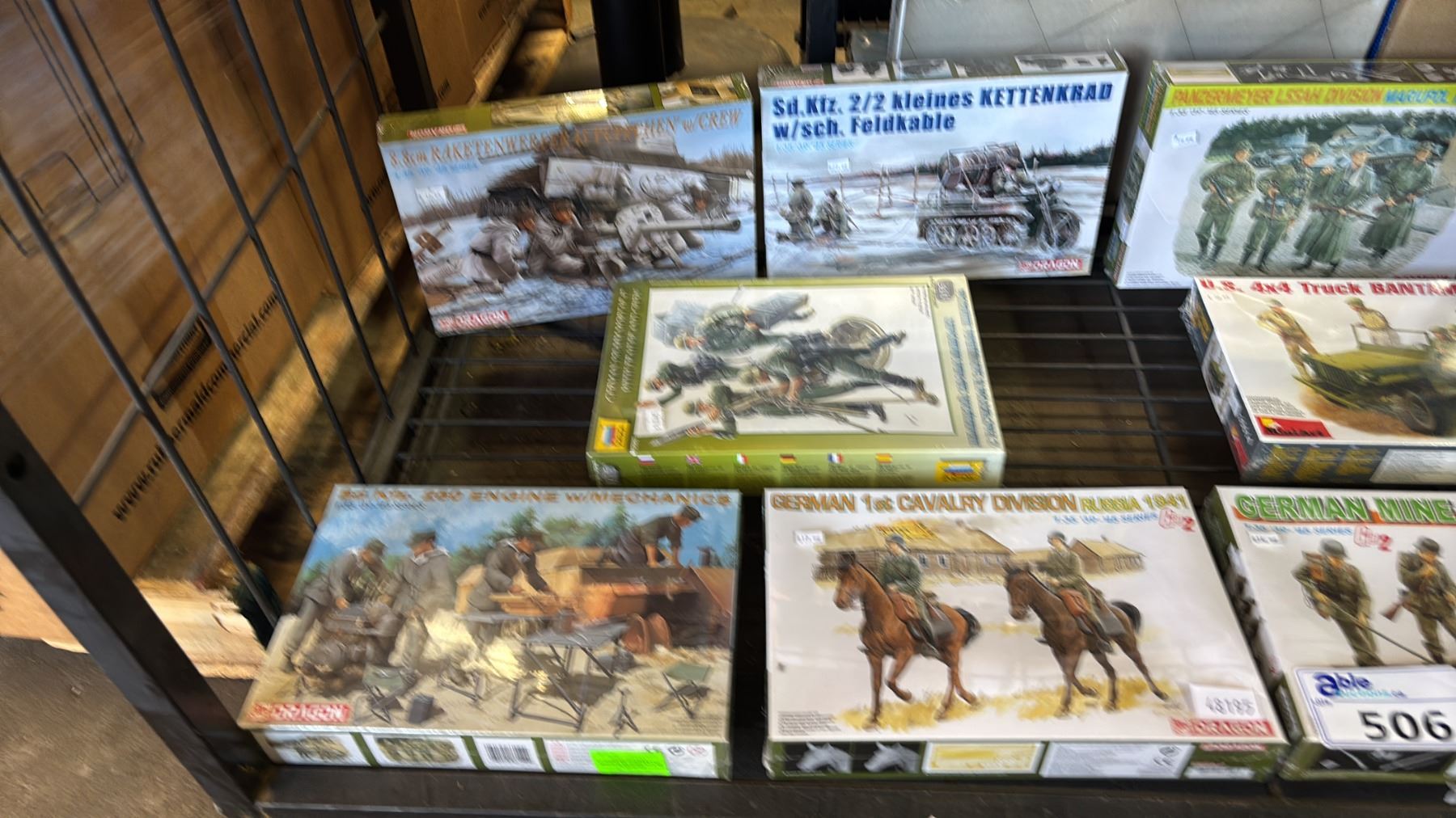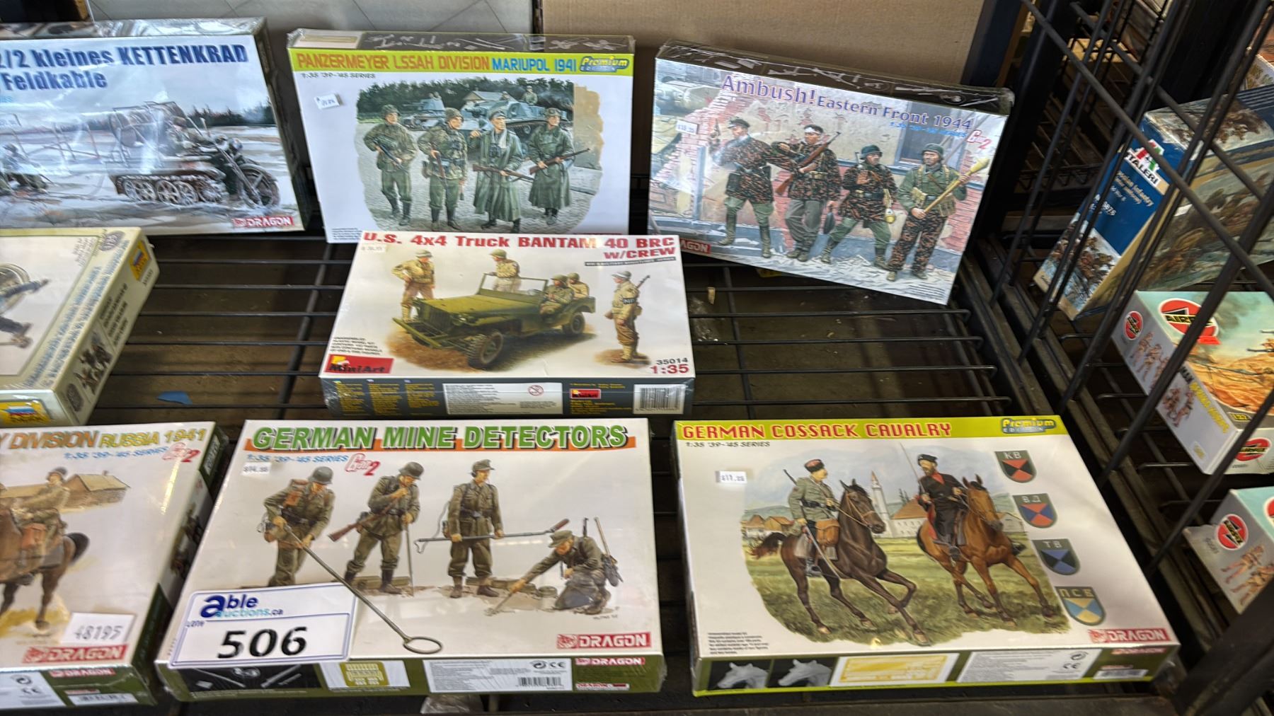 SHELF OF ASSORTED MODEL KITS: TANKS, GERMAN MINE DETECTORS, GERMAN COSSACK CAVALRY & MORE