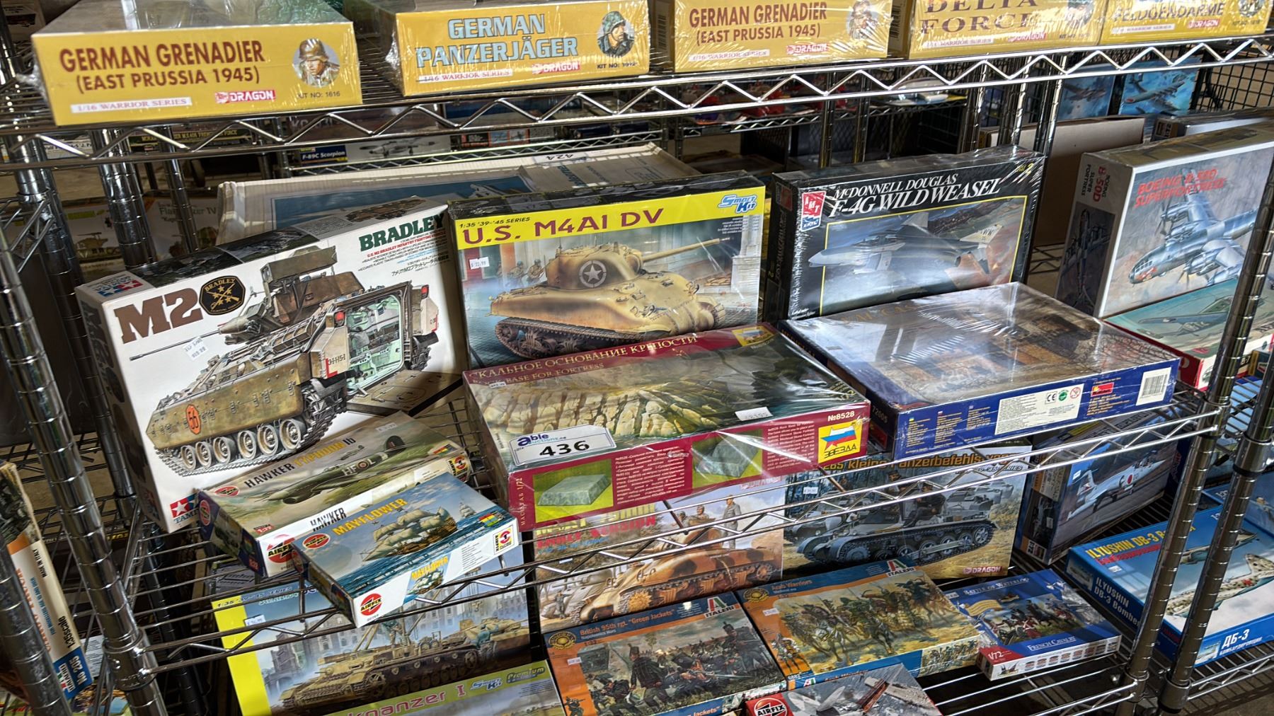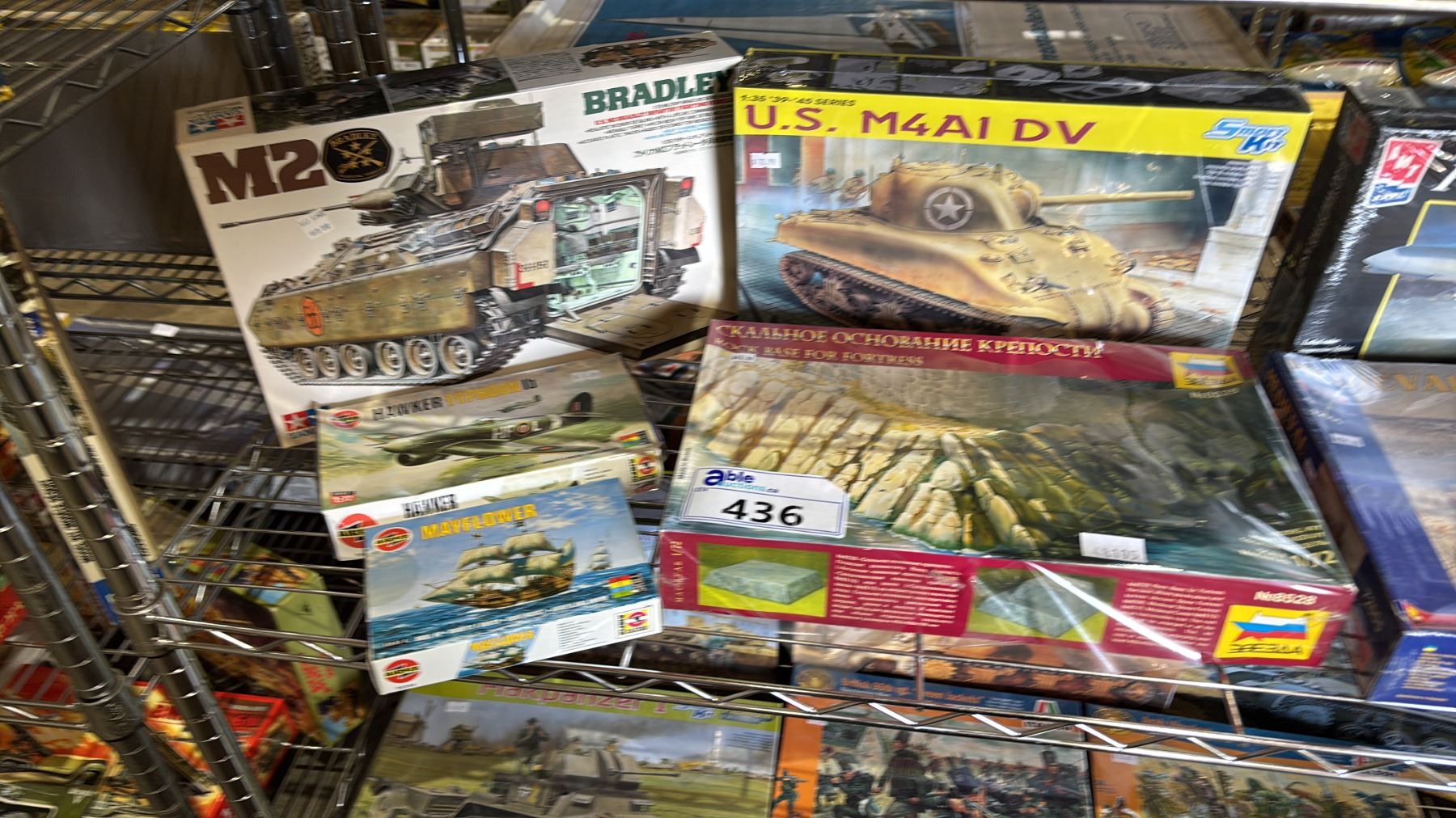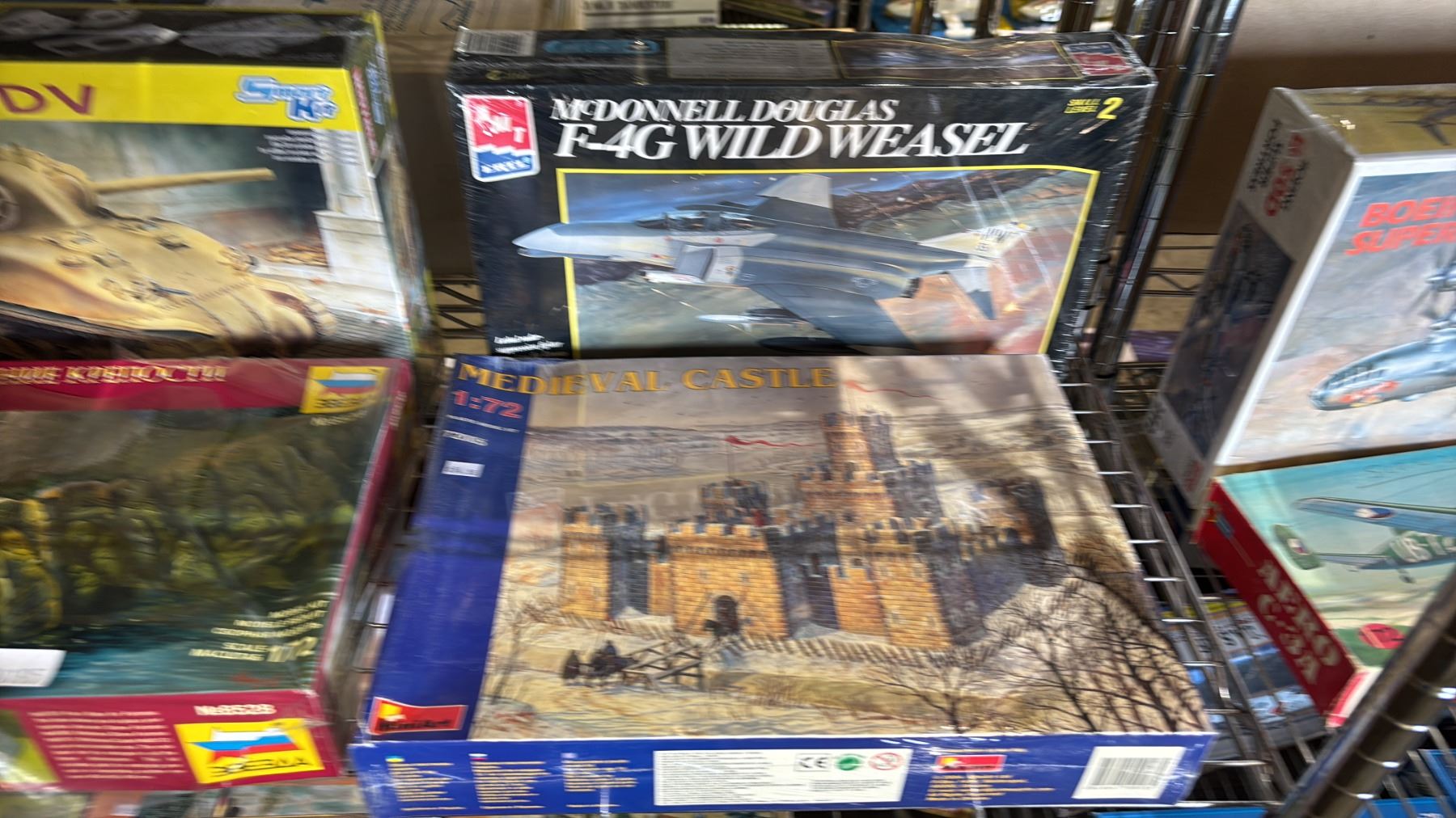 SHELF OF ASSORTED MODEL KITS: TANKS, ROCK BASE FOR FORTRESS, AIRPLANES & MORE