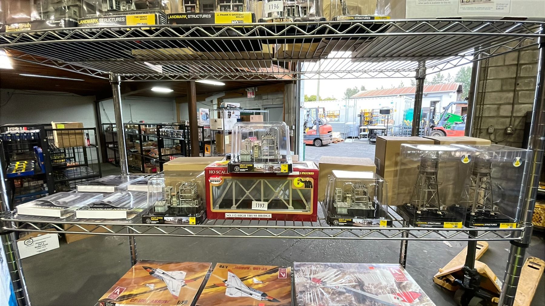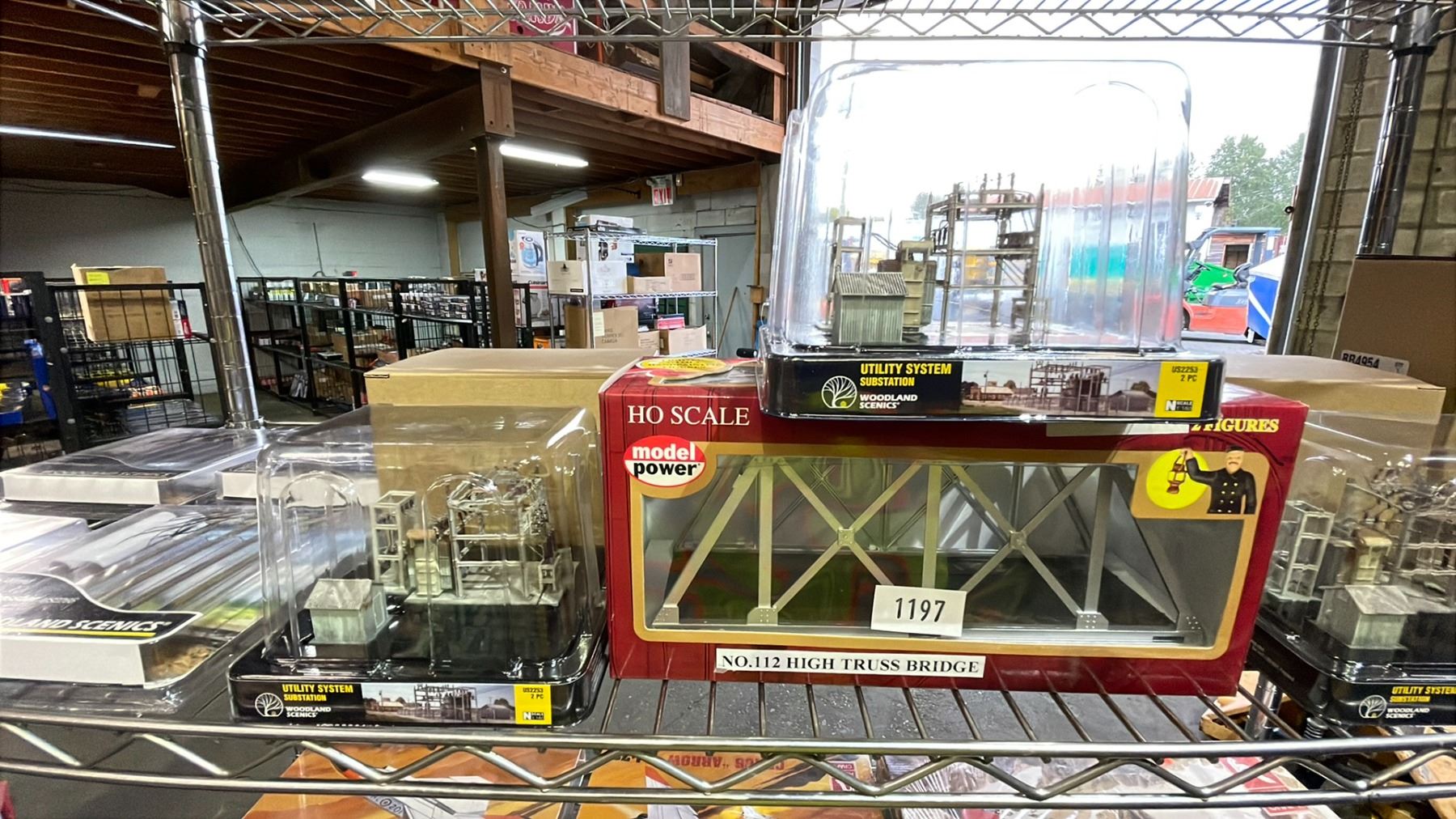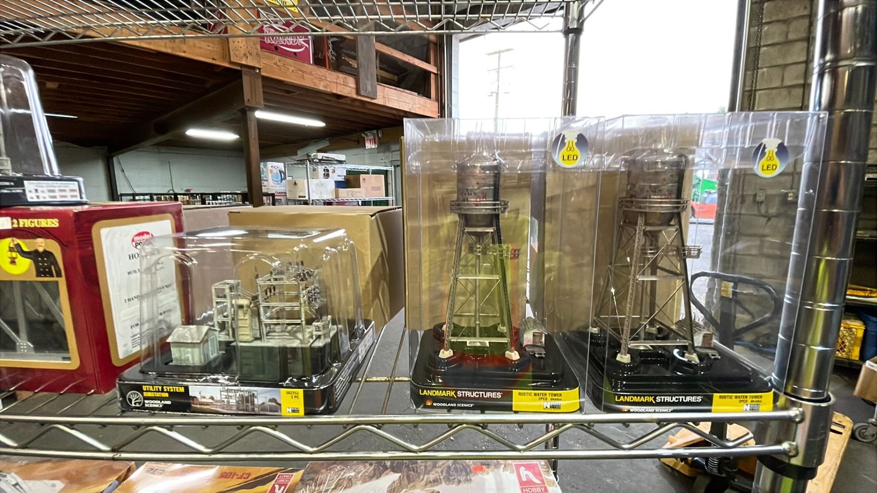 SHELF OF ASSORTED MODEL TRAIN STRUCTURES