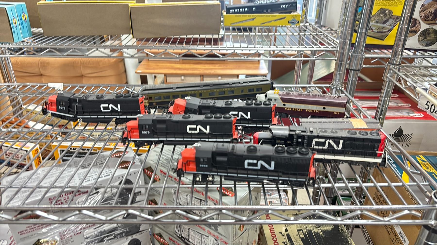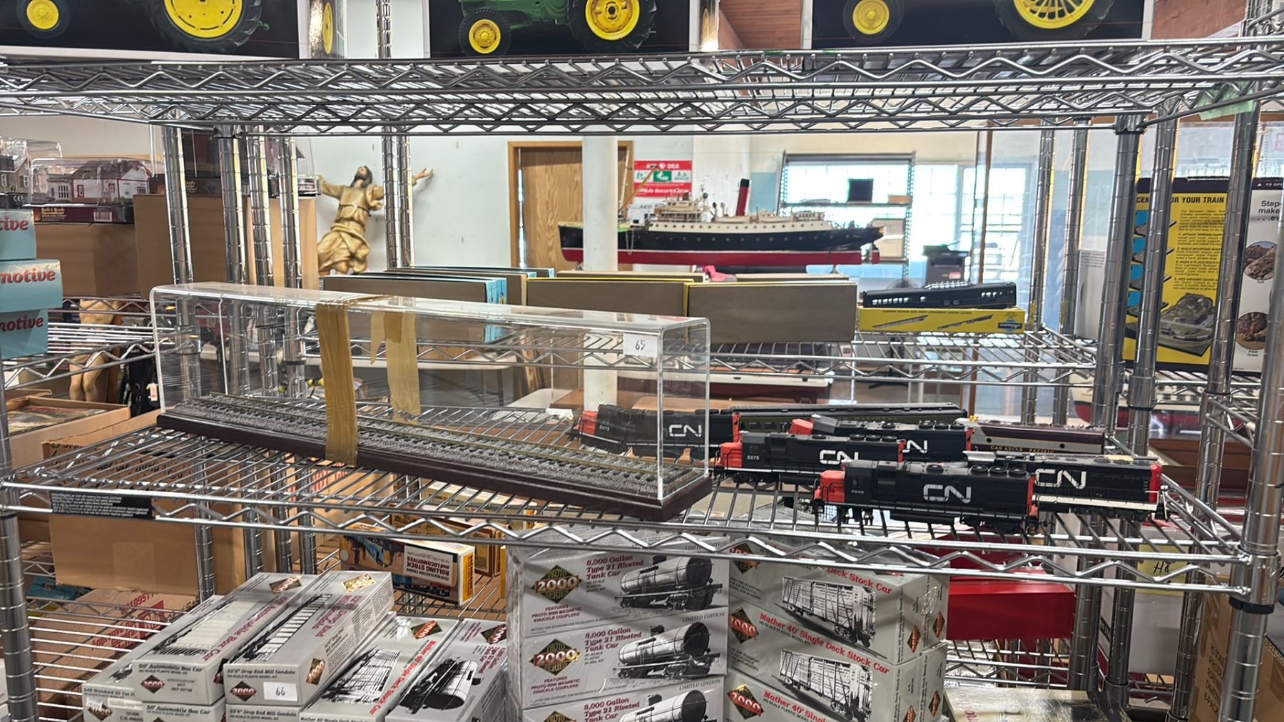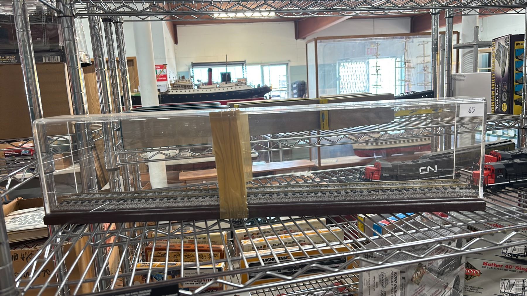 SHELF OF ASSORTED MODEL TRAINS & MODEL RAILWAY IN DISPLAY CASE