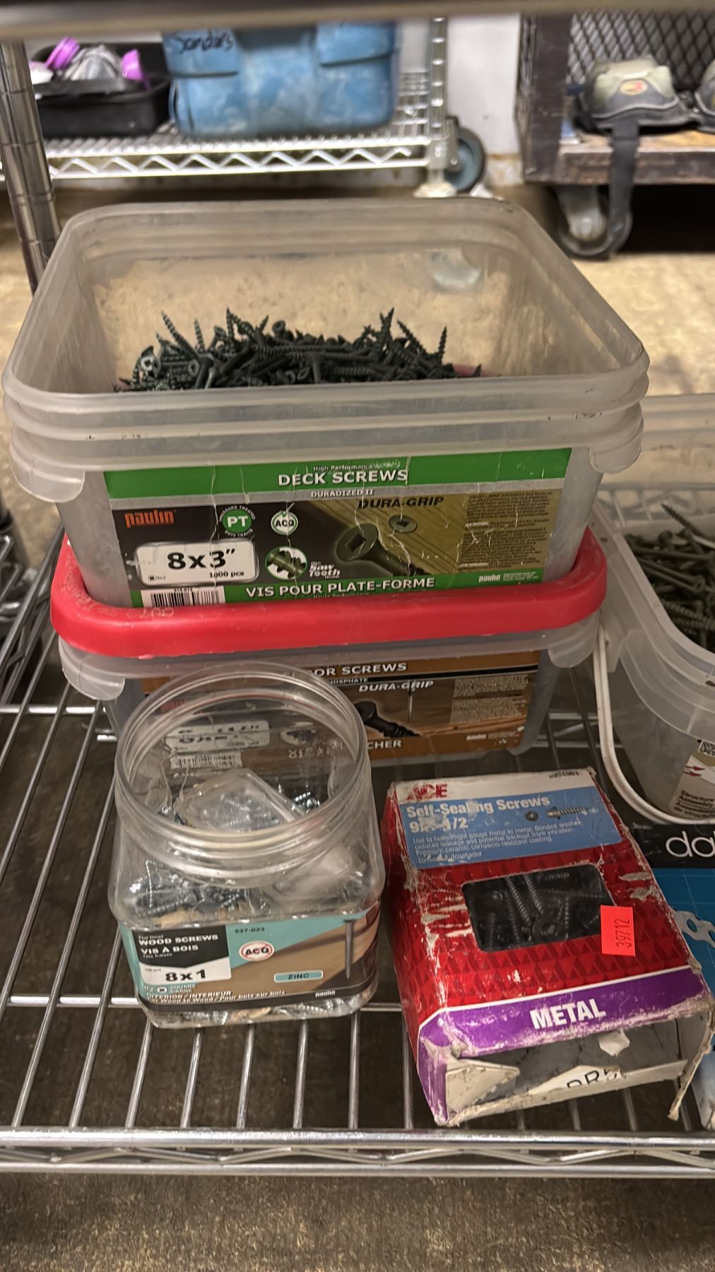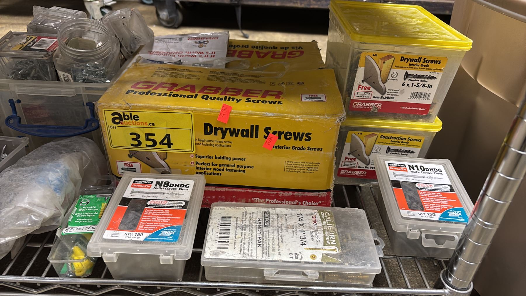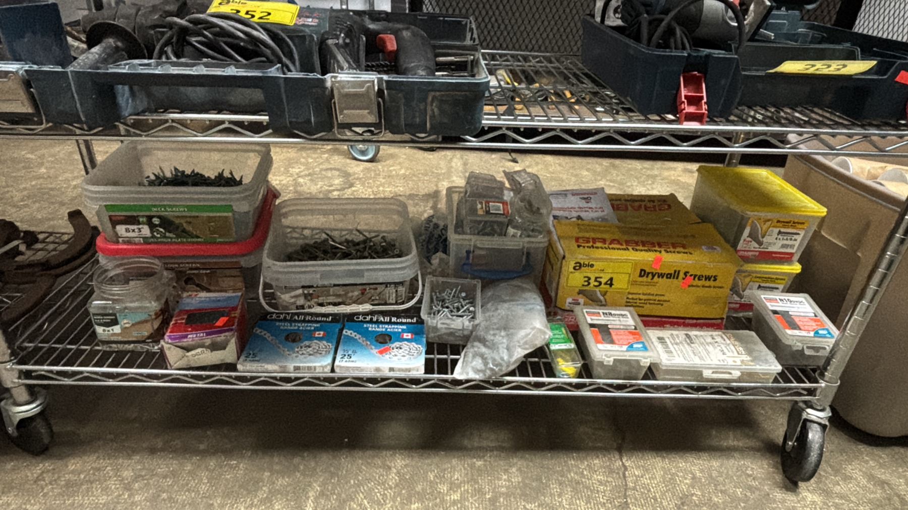 SHELF OF ASSORTED NAILS, SCREWS, STEEL STRAPPING, DRYWALL SCREWS & MORE