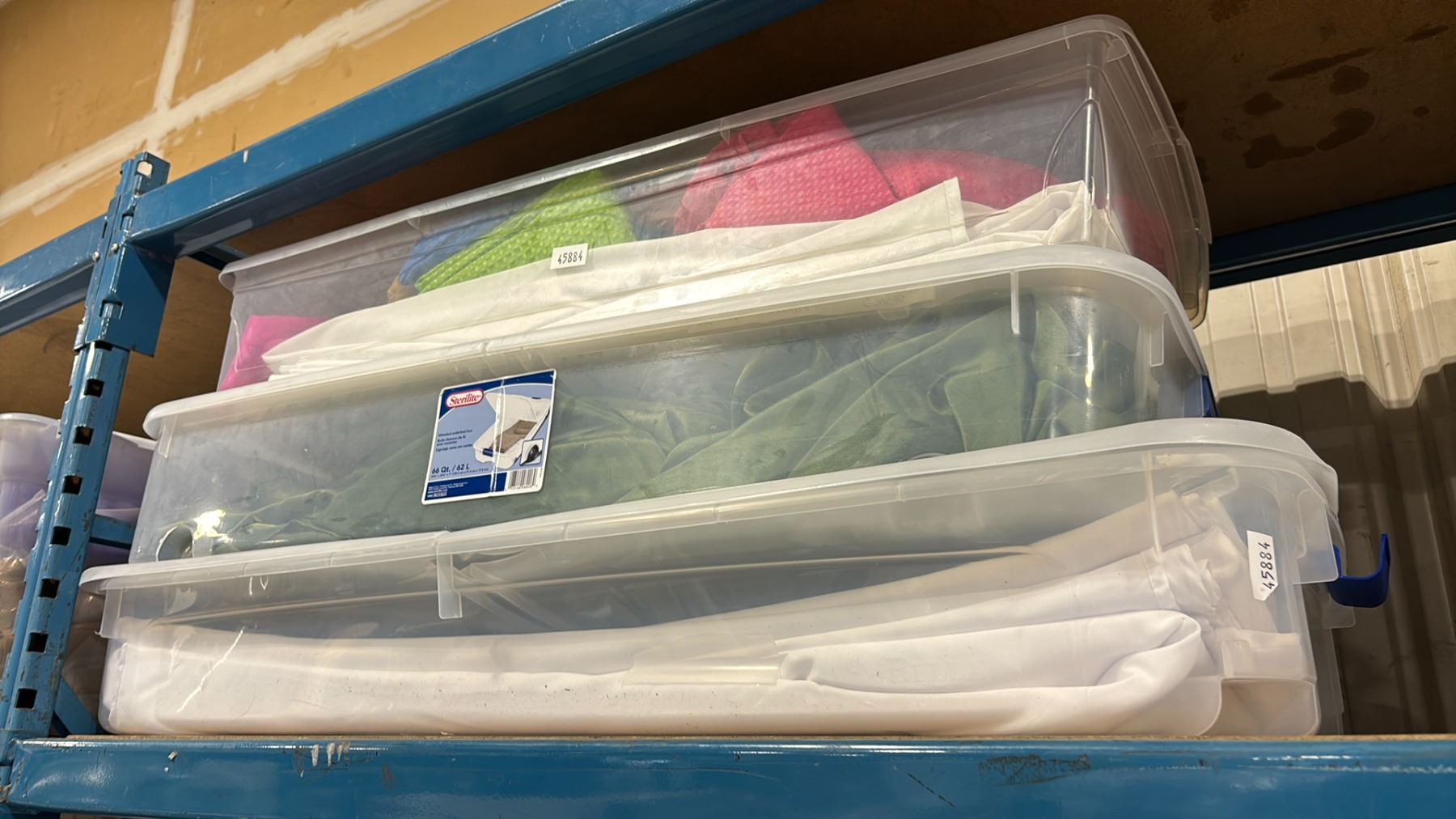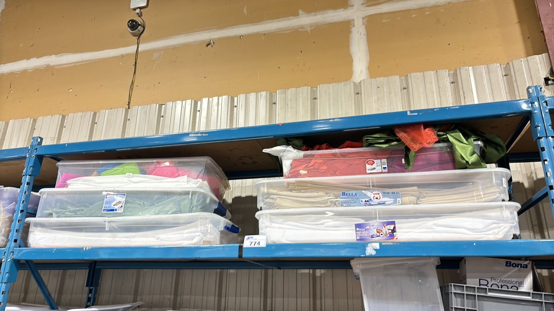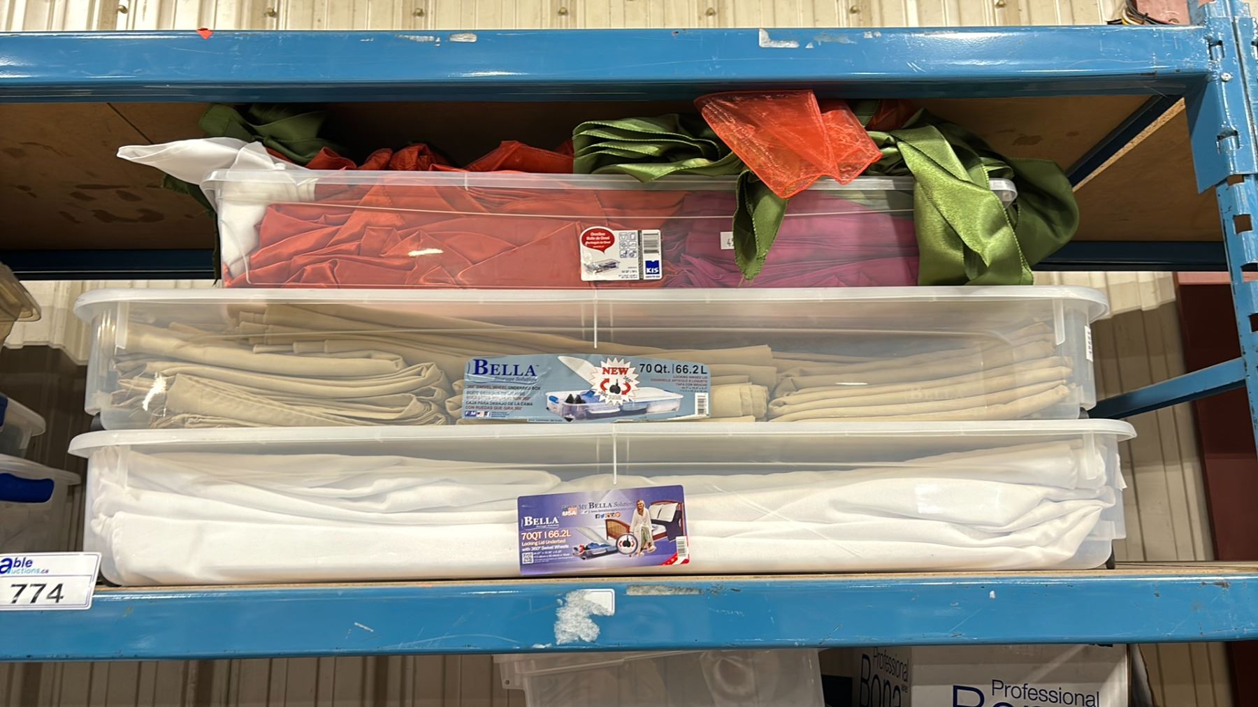 SHELF OF ASSORTED ORGANZA EVENT DECORATING FABRIC / TABLE RUNNERS / CHAIR BOWS / TABLE COVERS *BINS INCLUDED*