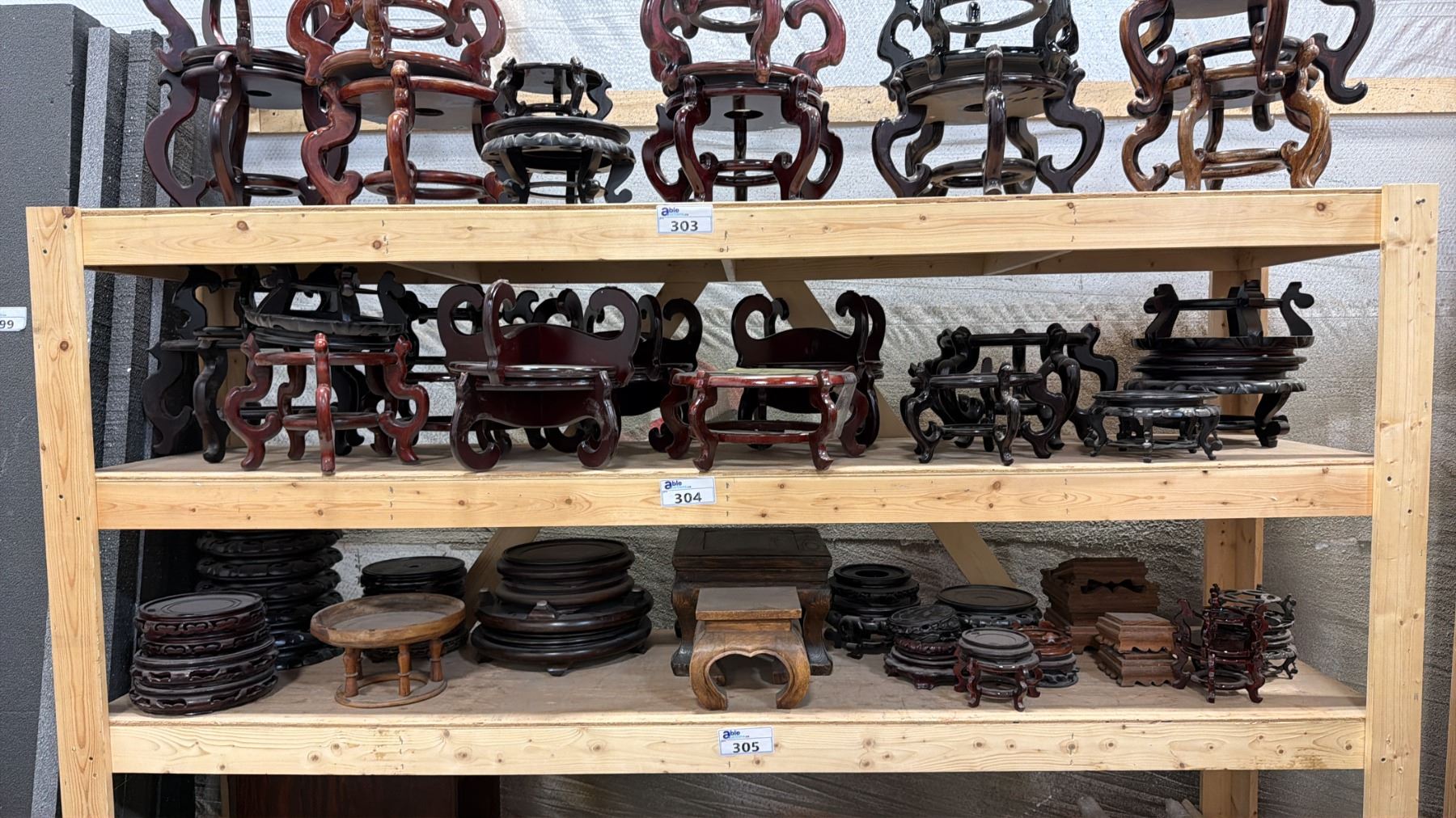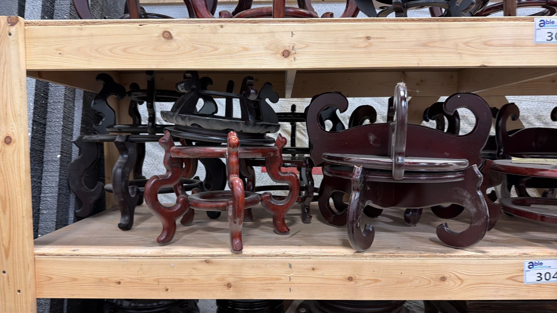 SHELF OF ASSORTED ORIENTAL WOODEN PLANTER STANDS APPROX 20