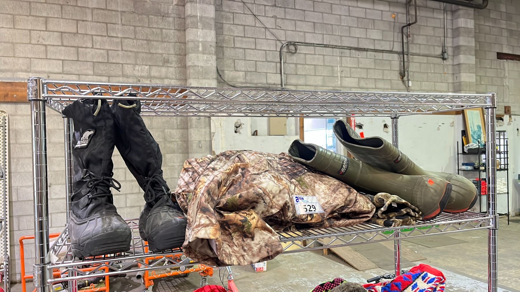 SHELF OF ASSORTED OUTDOOR GEAR INCLUDING; SOREL BOOTS SIZE 8, BAFFIN STEEL TOE BOOTS SIZE 10 & CAMOUFLAGE CLOTHING