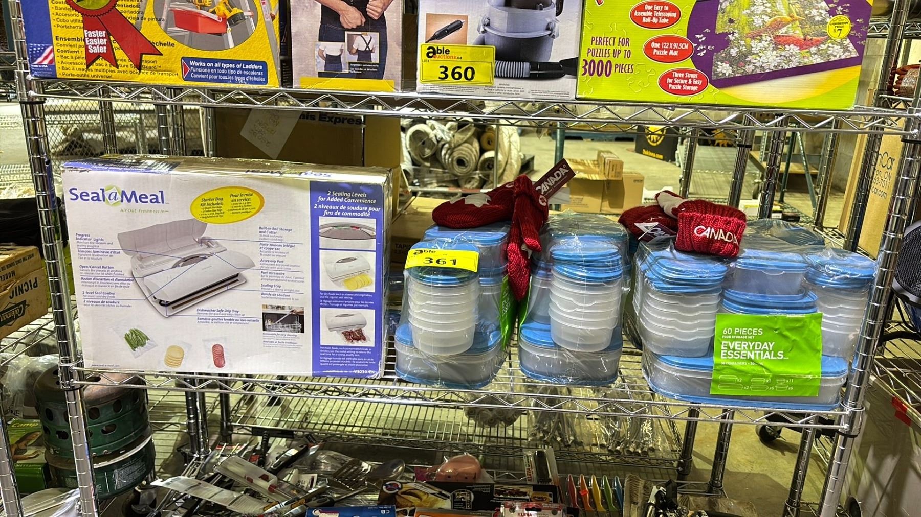 SHELF OF ASSORTED PLASTIC TO GO CONTAINERS & A SEAL A MEAL VACUUM FOOD SEALER