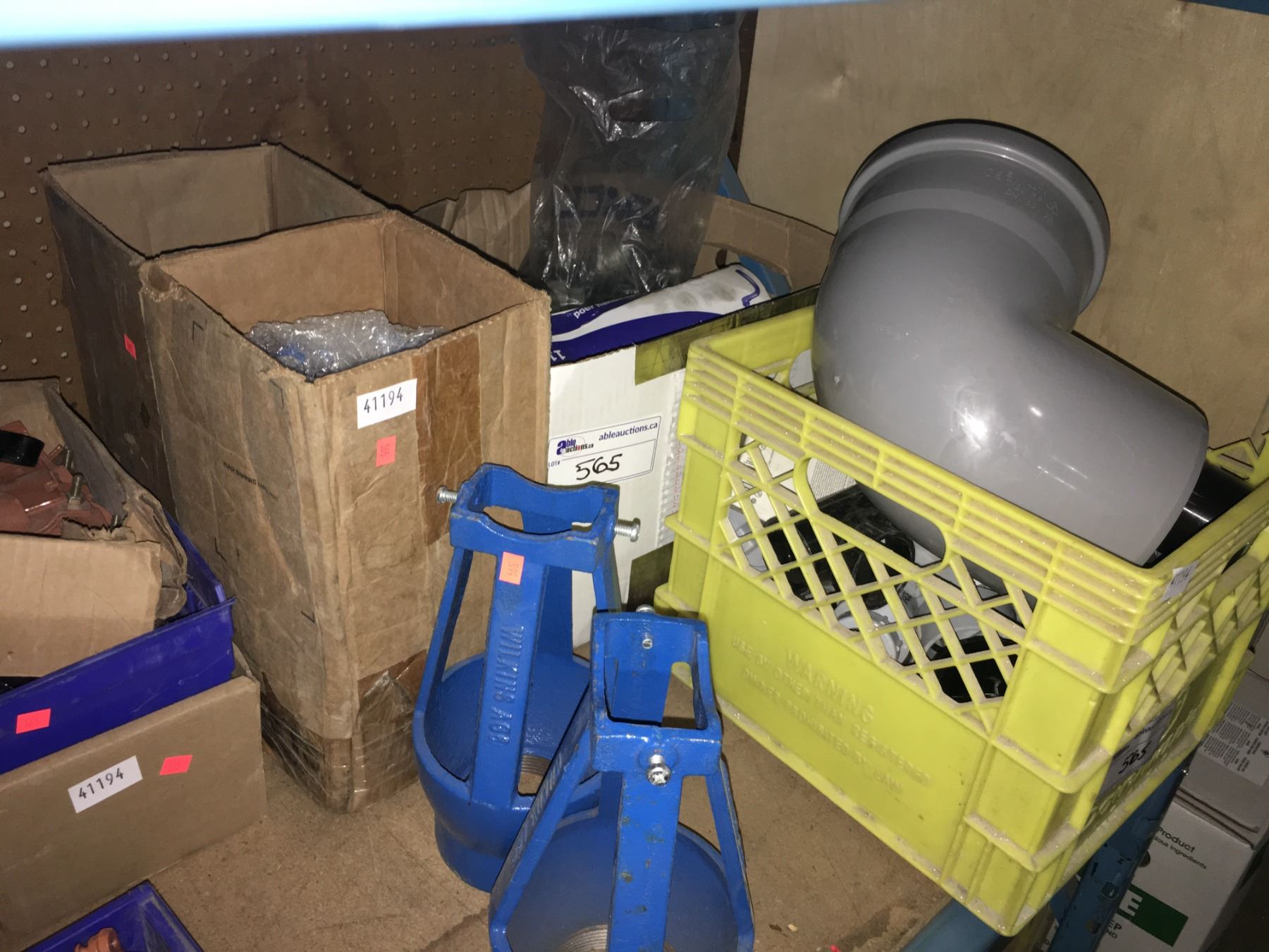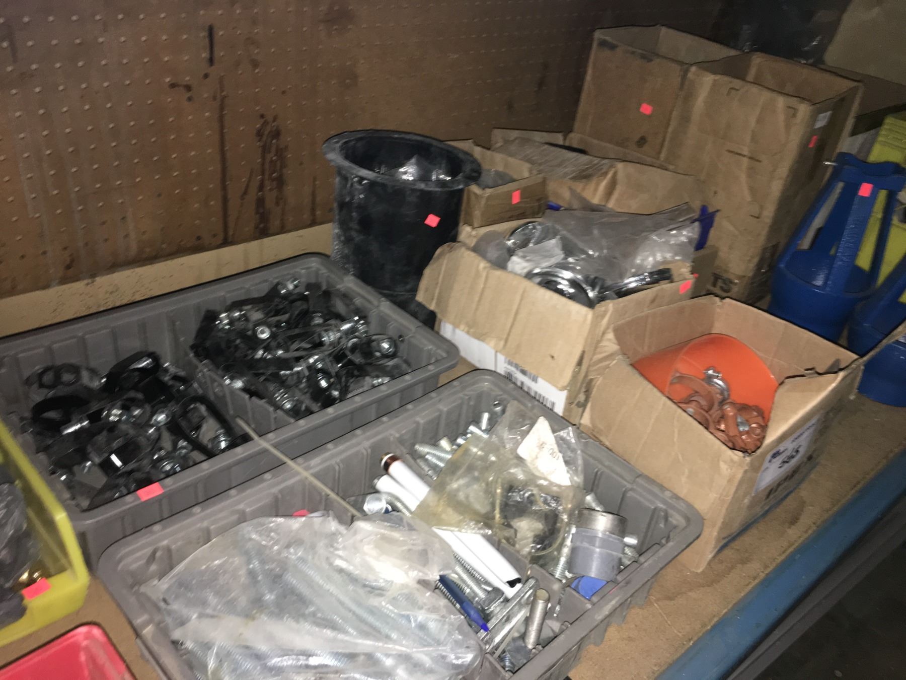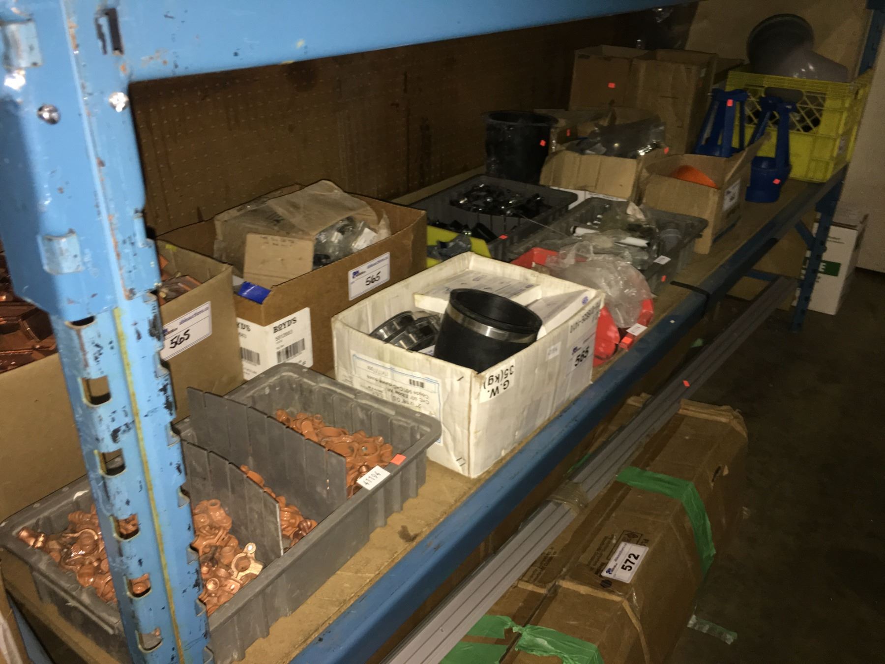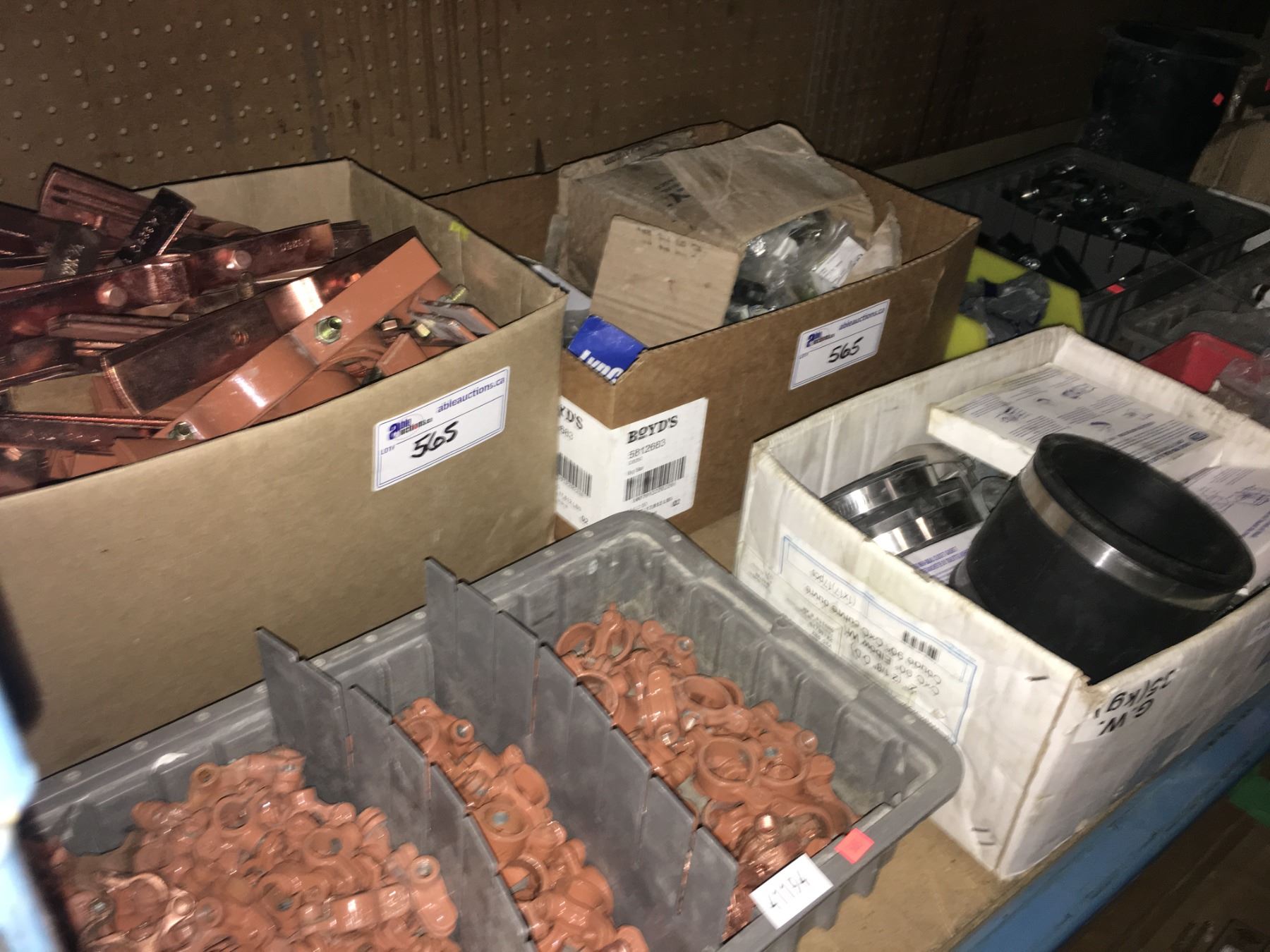 SHELF OF ASSORTED PLUMBING HARDWARE, FITTINGS, AND CLAMPS