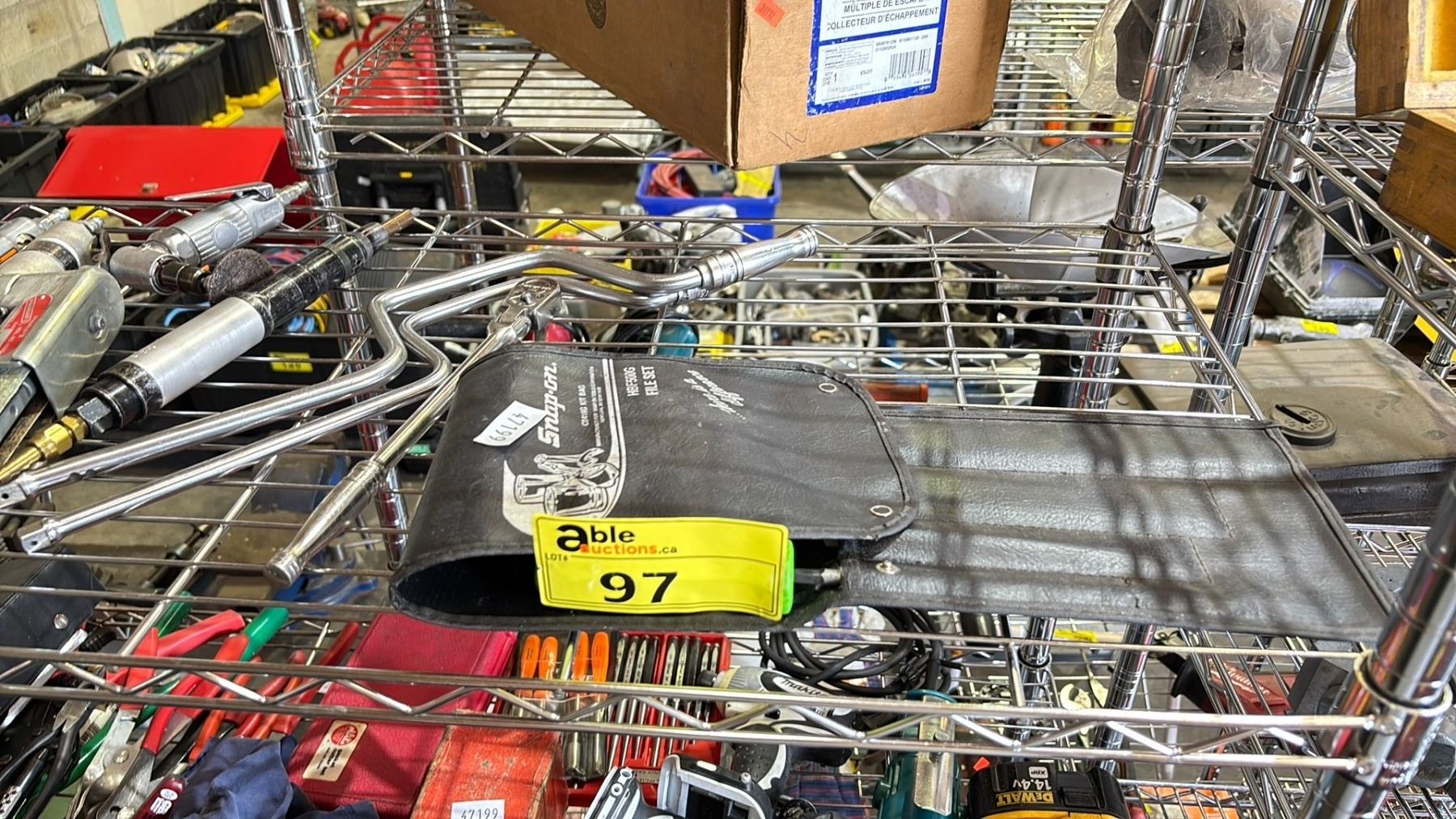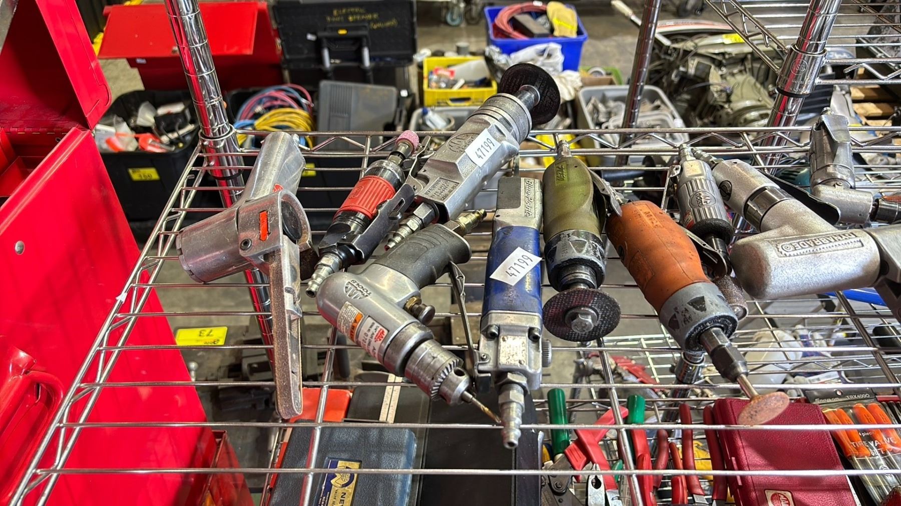SHELF OF ASSORTED PNEUMATIC DIE GRINDERS & A SNAP ON FILE SET IN A SOFT TRANSPORT CASE