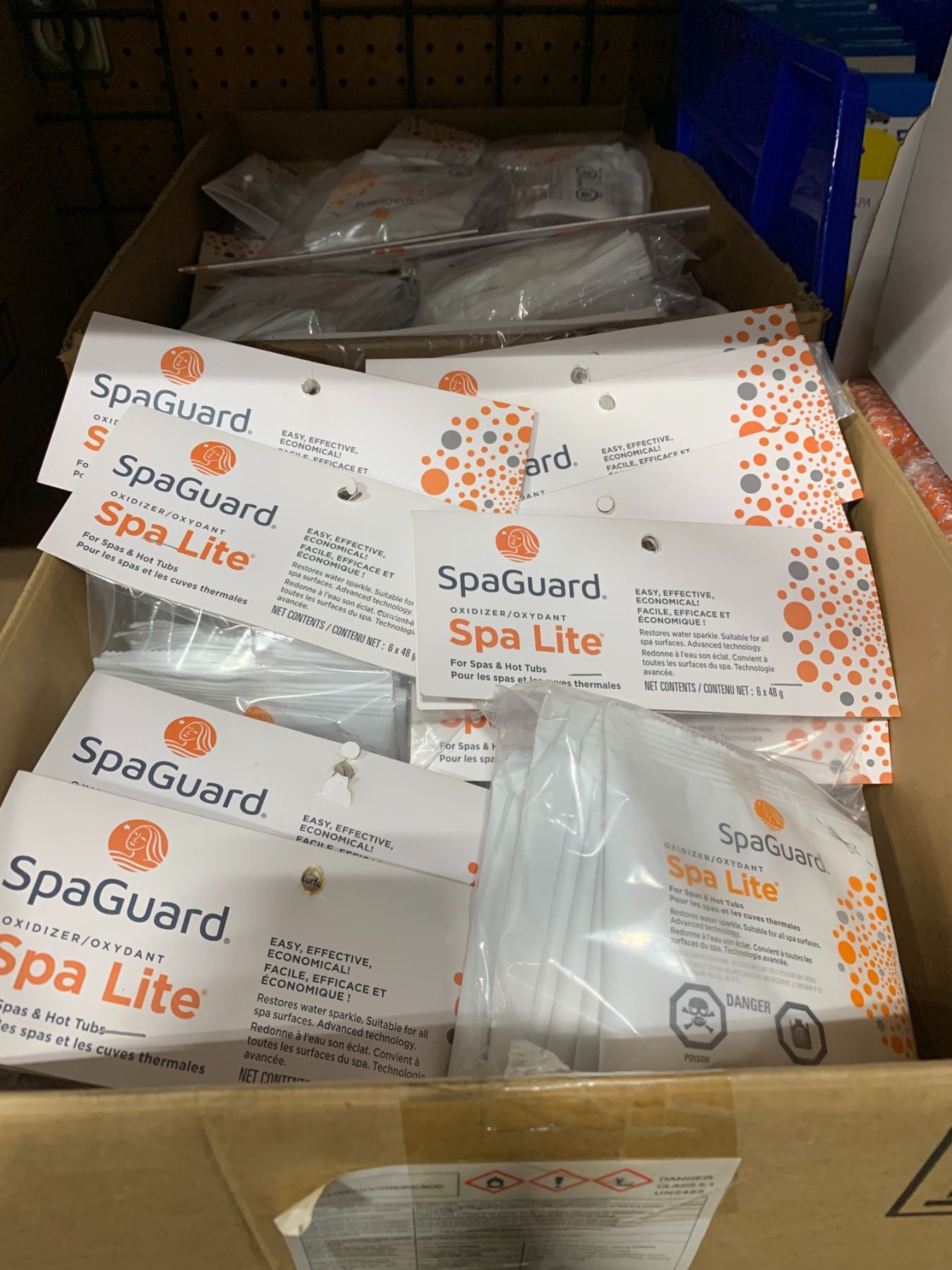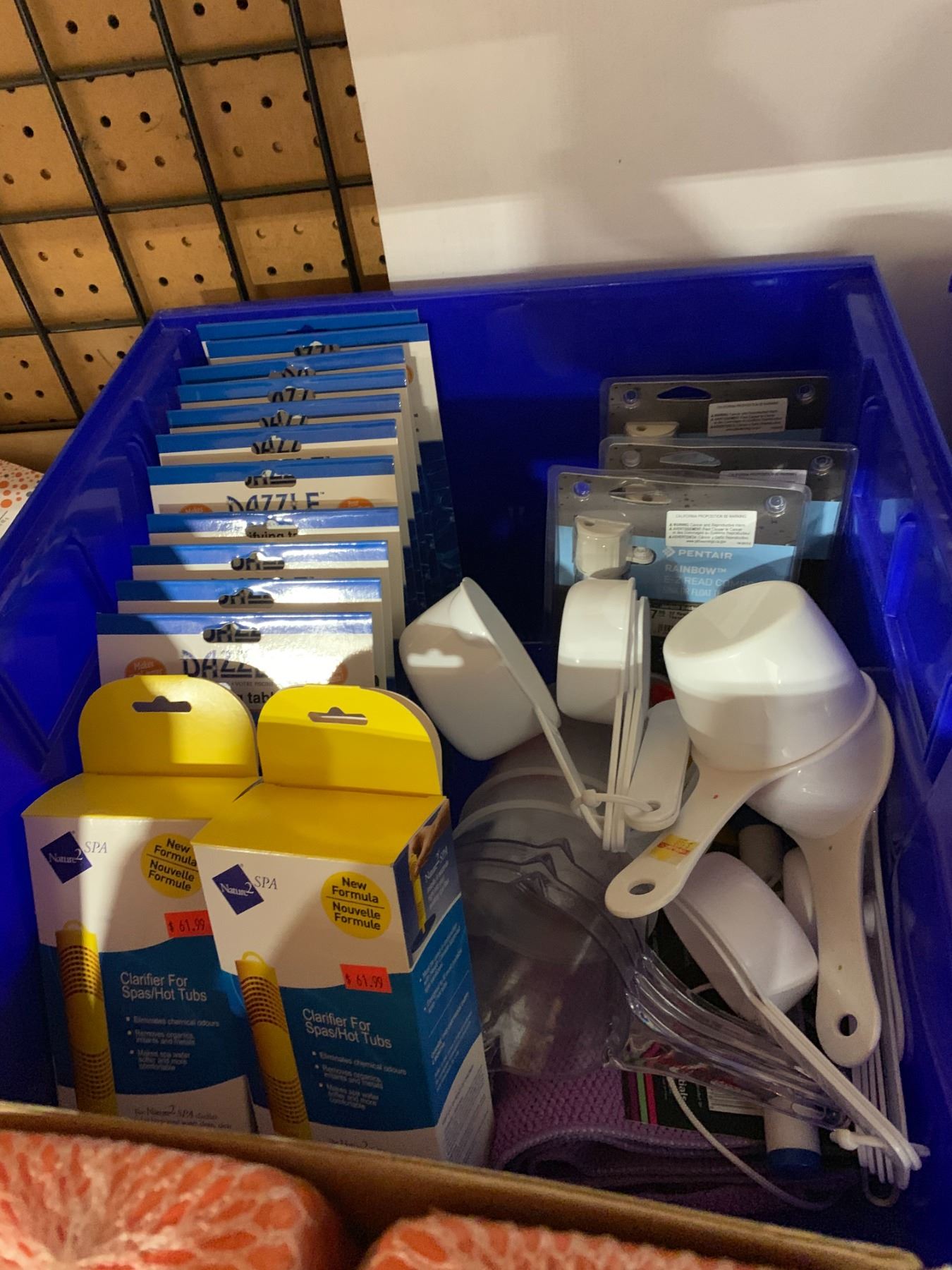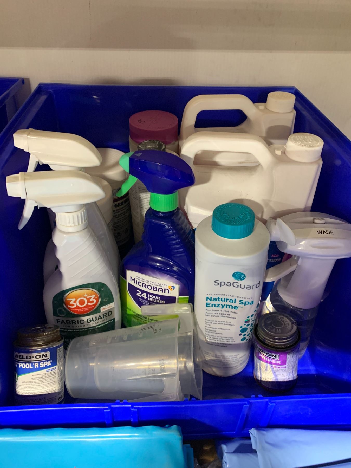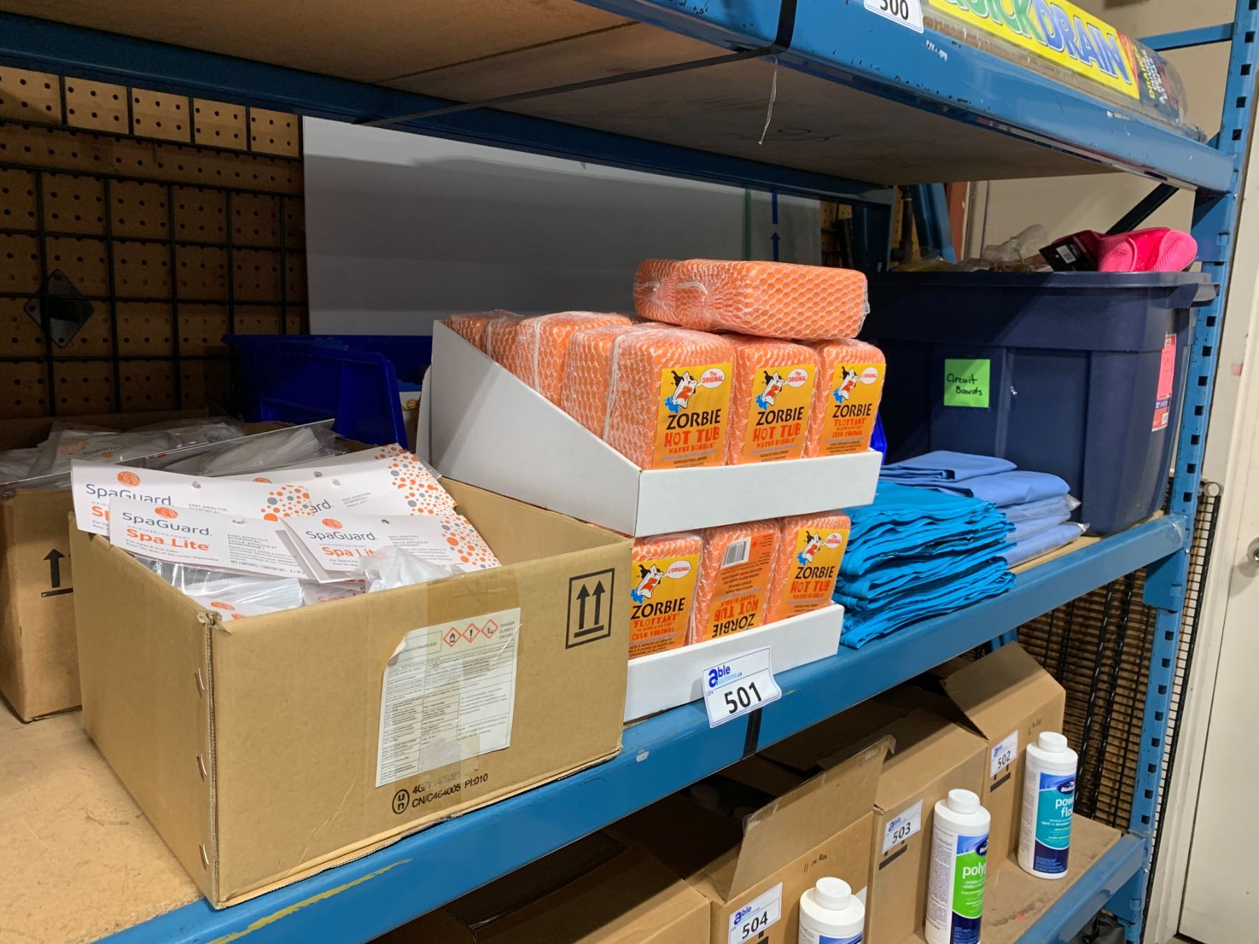 SHELF OF ASSORTED POOL / HOT TUB CLEANERS, CHEMICALS, & CLEANING PRODUCTS