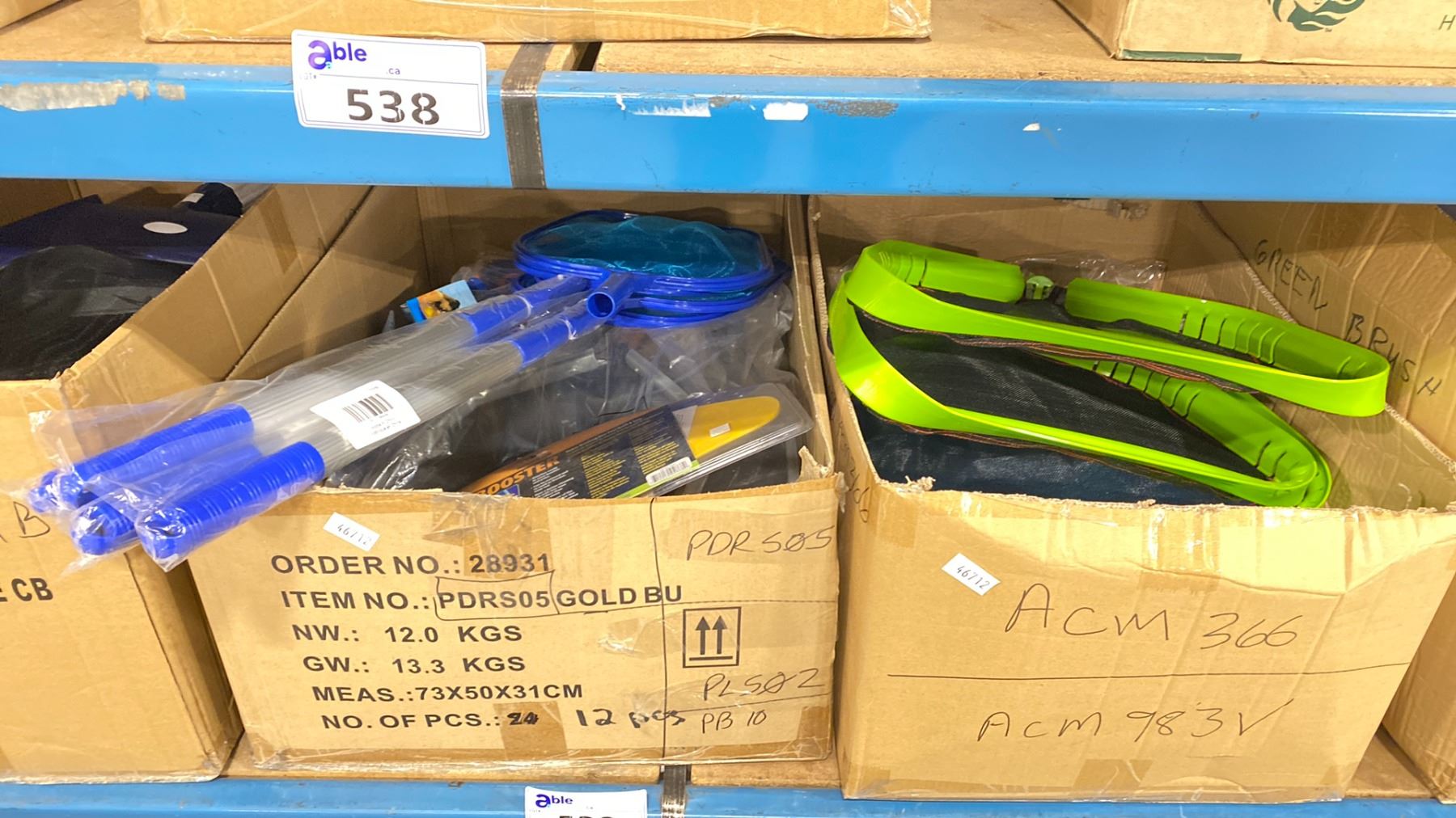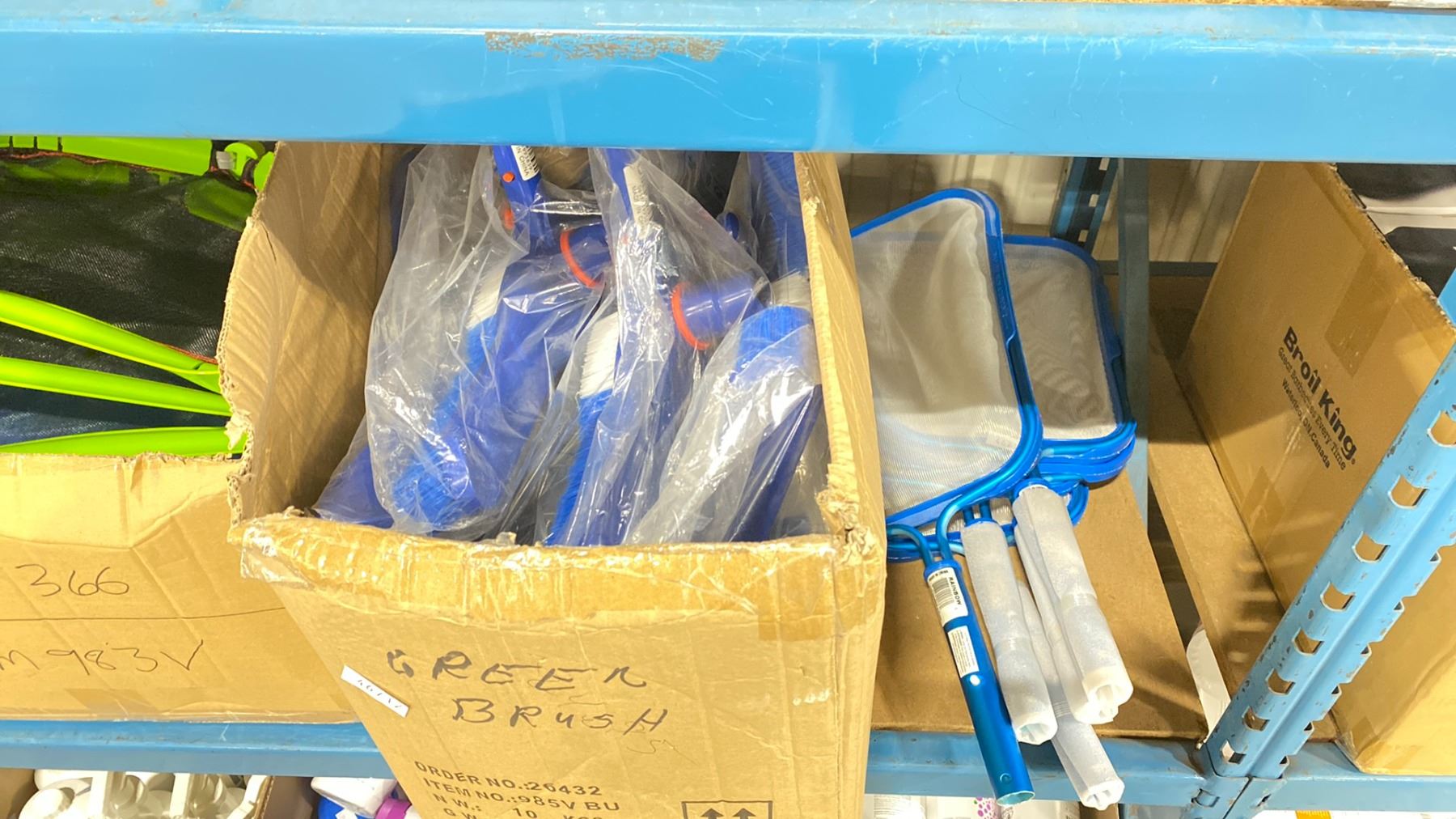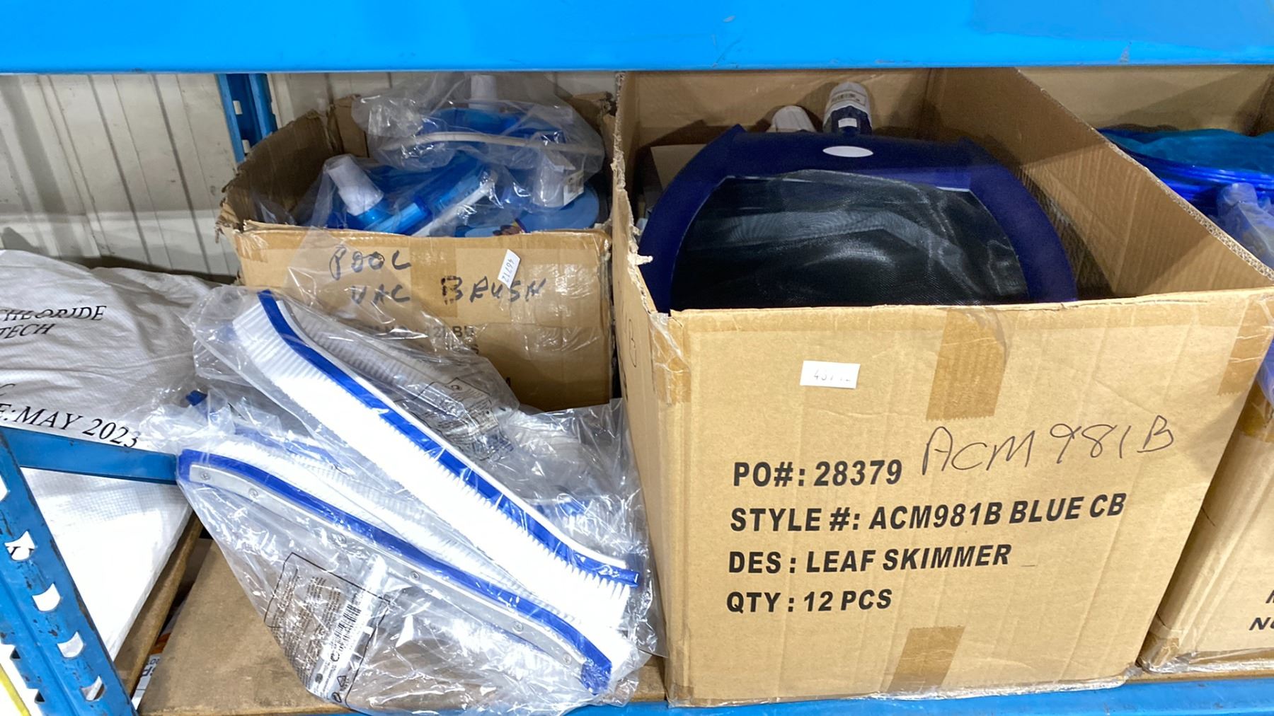 SHELF OF ASSORTED POOL SKIMMING NETS & BRUSHES