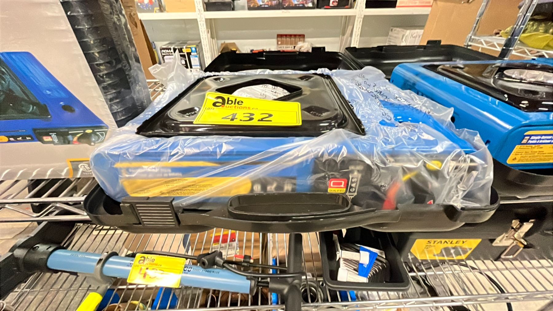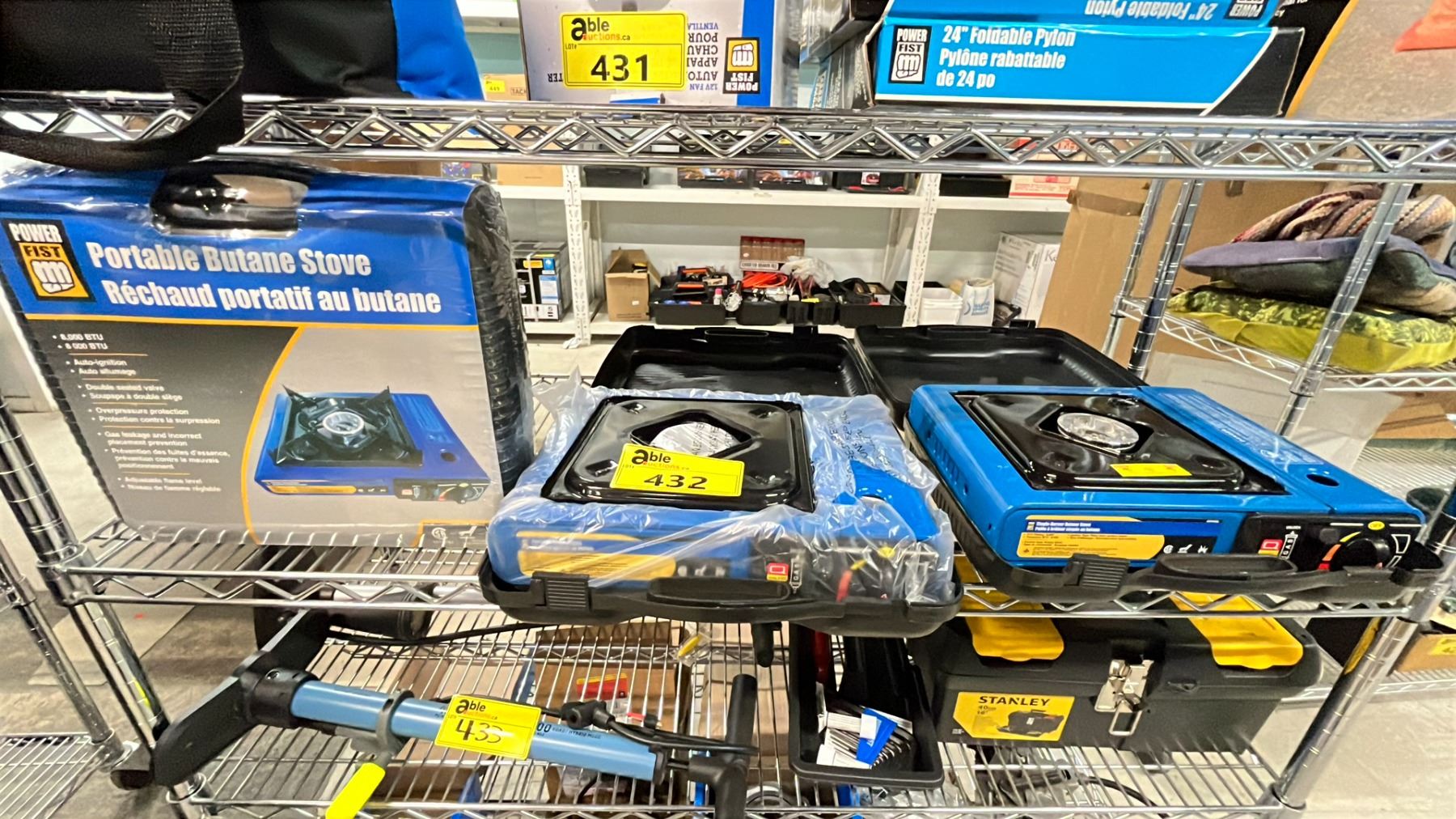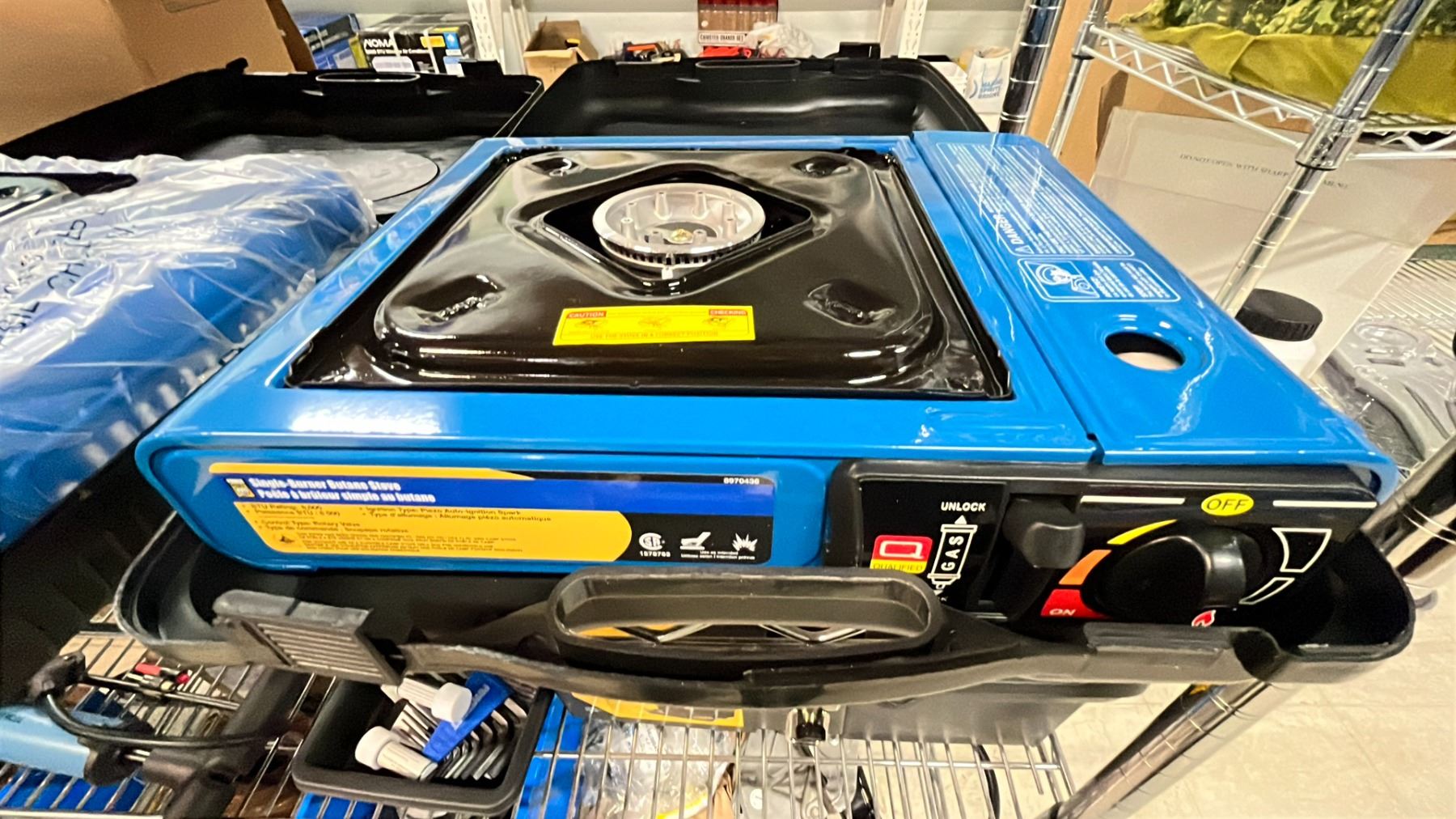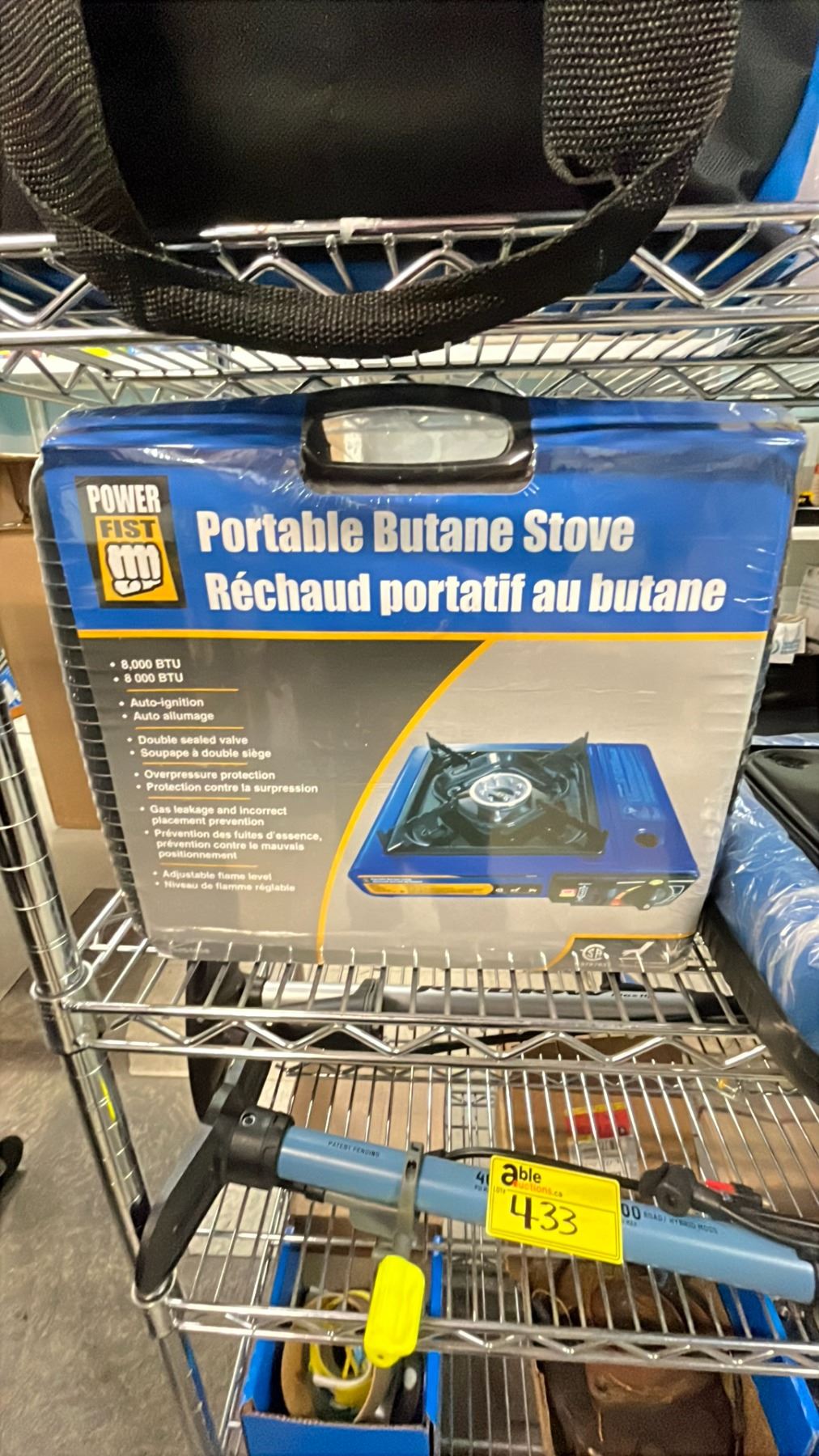 SHELF OF ASSORTED POWER FIST PORTABLE BUTANE STOVE