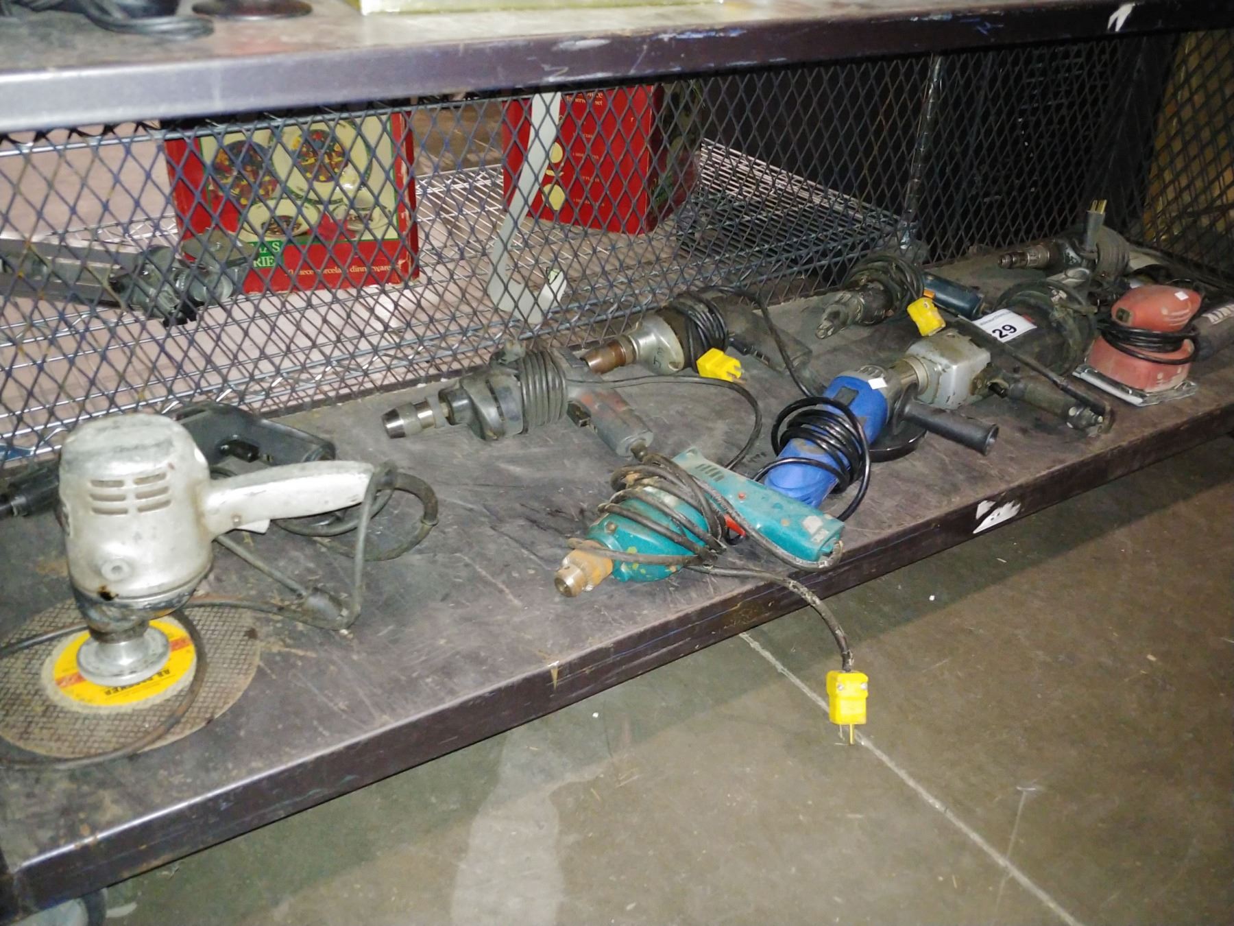 SHELF OF ASSORTED POWER TOOLS AND MORE