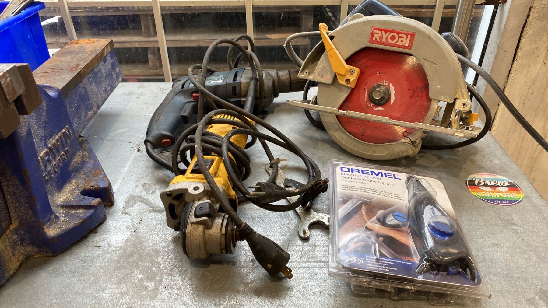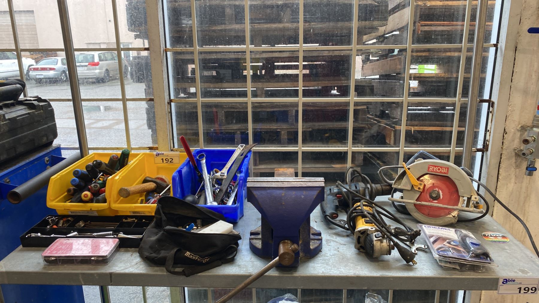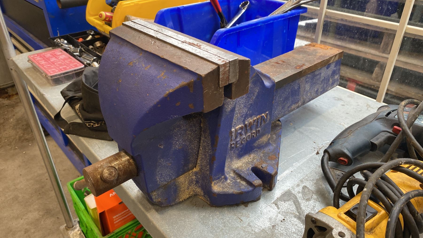 SHELF OF ASSORTED POWER TOOLS & HAND TOOLS, LARGE VISE AND PLASTIC ORGINIZERS