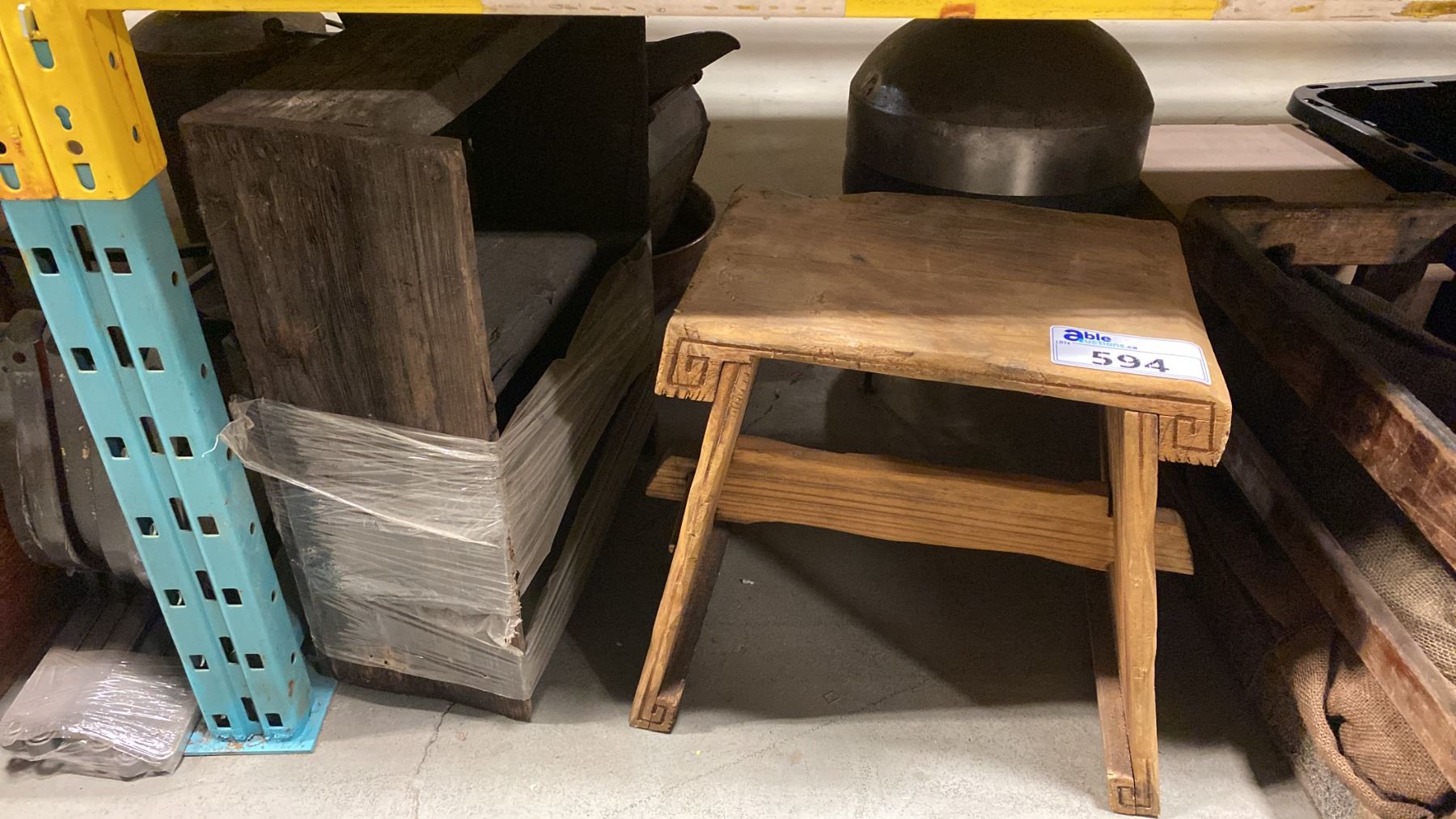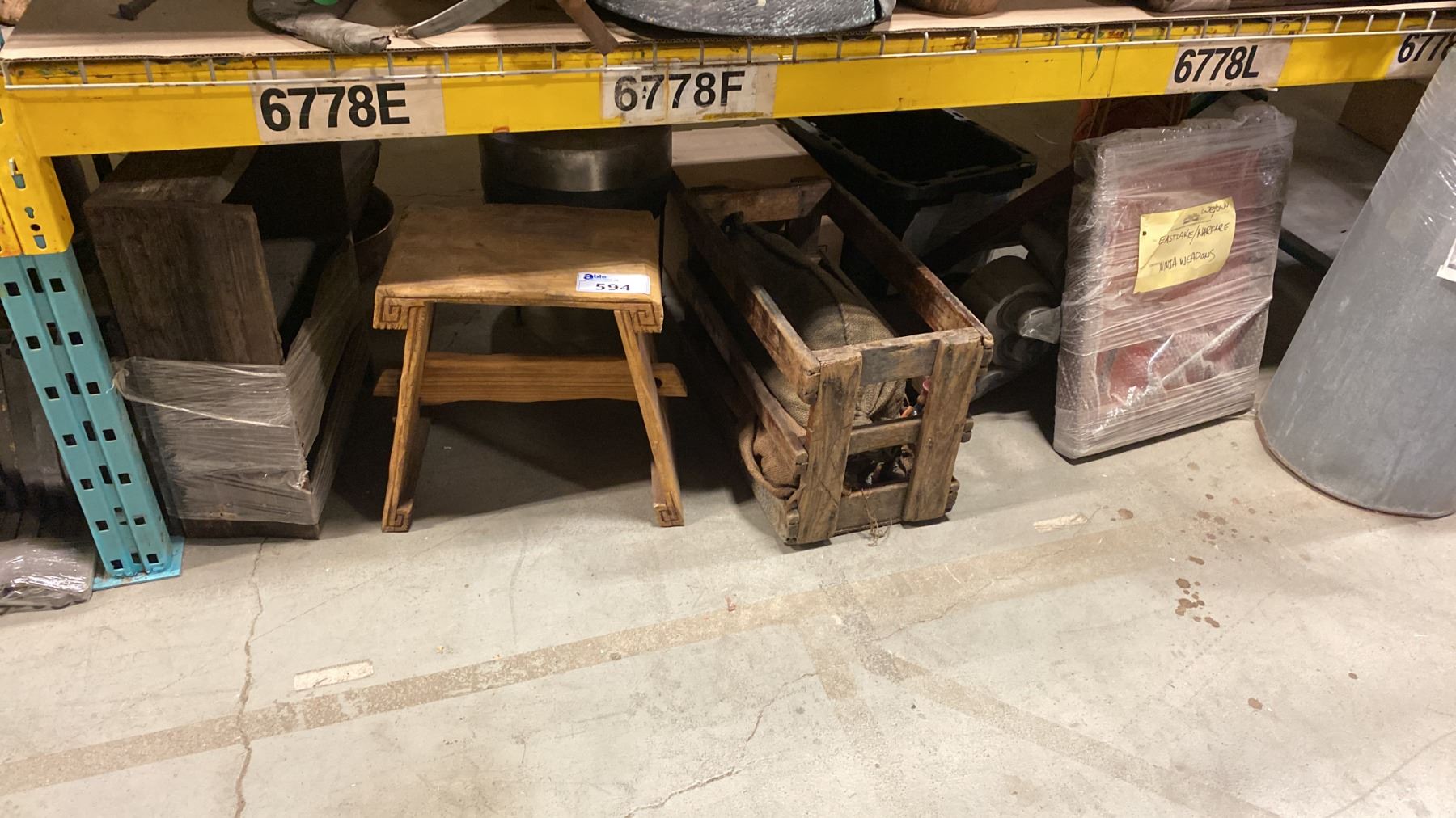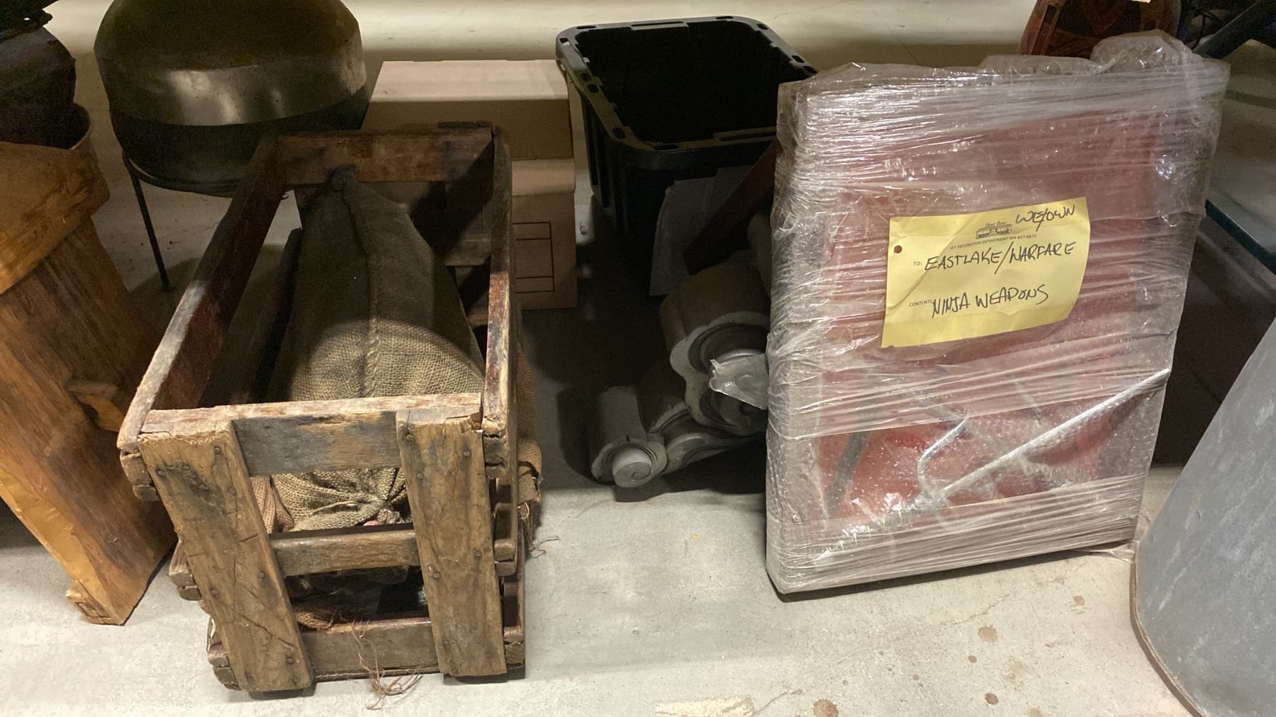 SHELF OF ASSORTED PROP WEAPONS, WOODEN STOOL, CRATE & MORE