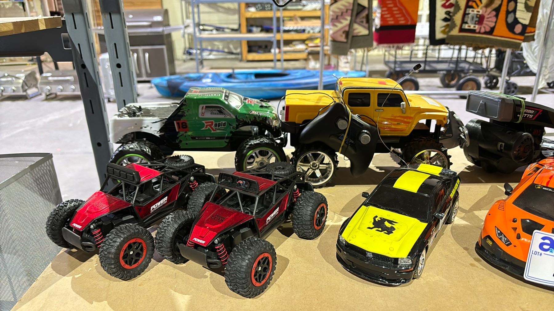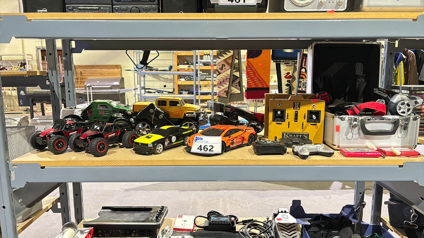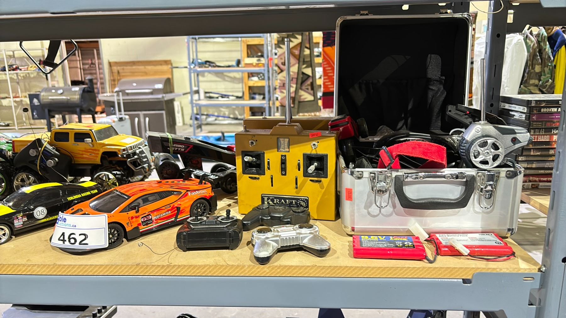 SHELF OF ASSORTED RC CARS, REMOTES & BATTERIES