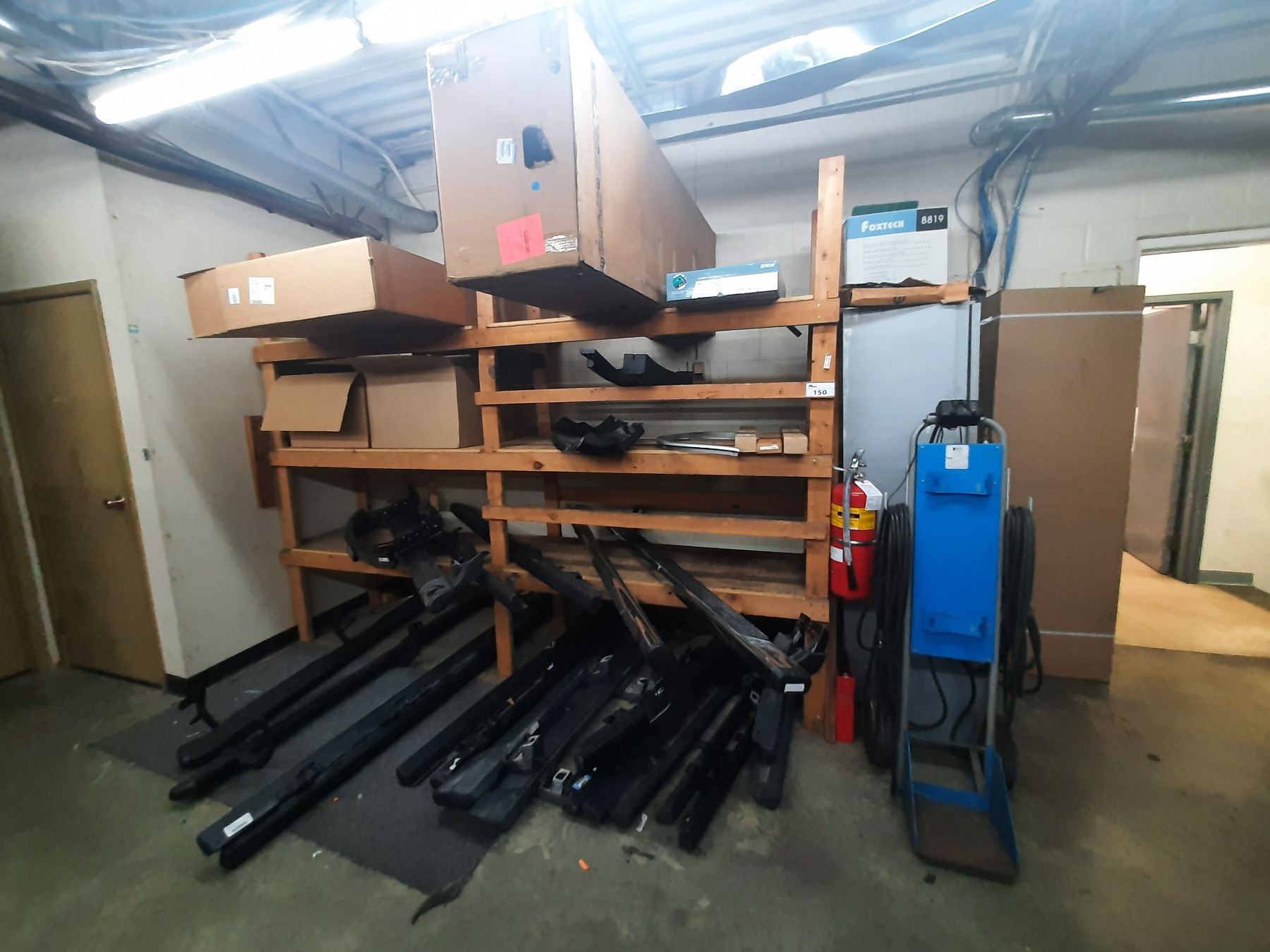 SHELF OF ASSORTED RUNNING BOARDS, AIR FILTERS, CHROME BUMPER, METAL 3 DOOR PERSONAL LOCKER SYSTEM AND HALTEC 89TRL-4B MOBILE NITROGEN BOTTLE CART