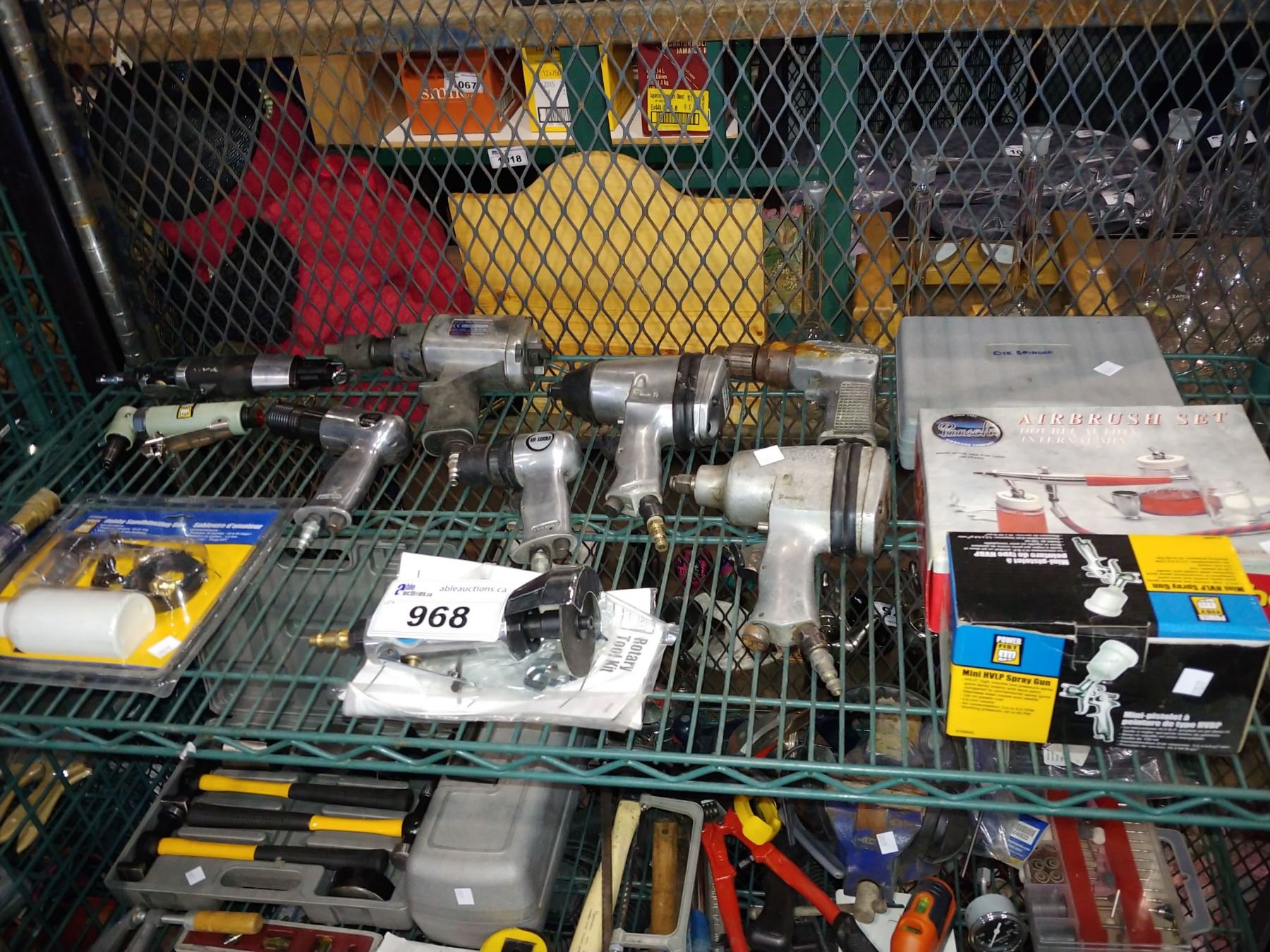 SHELF OF ASSORTED SAND BLASTERS, SPRAY GUNS AND MORE