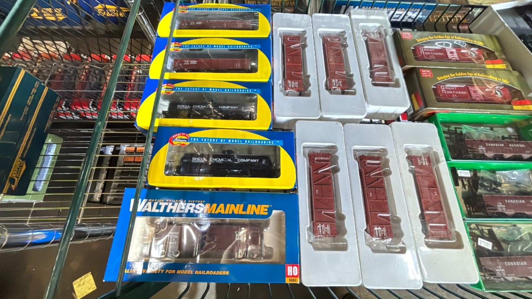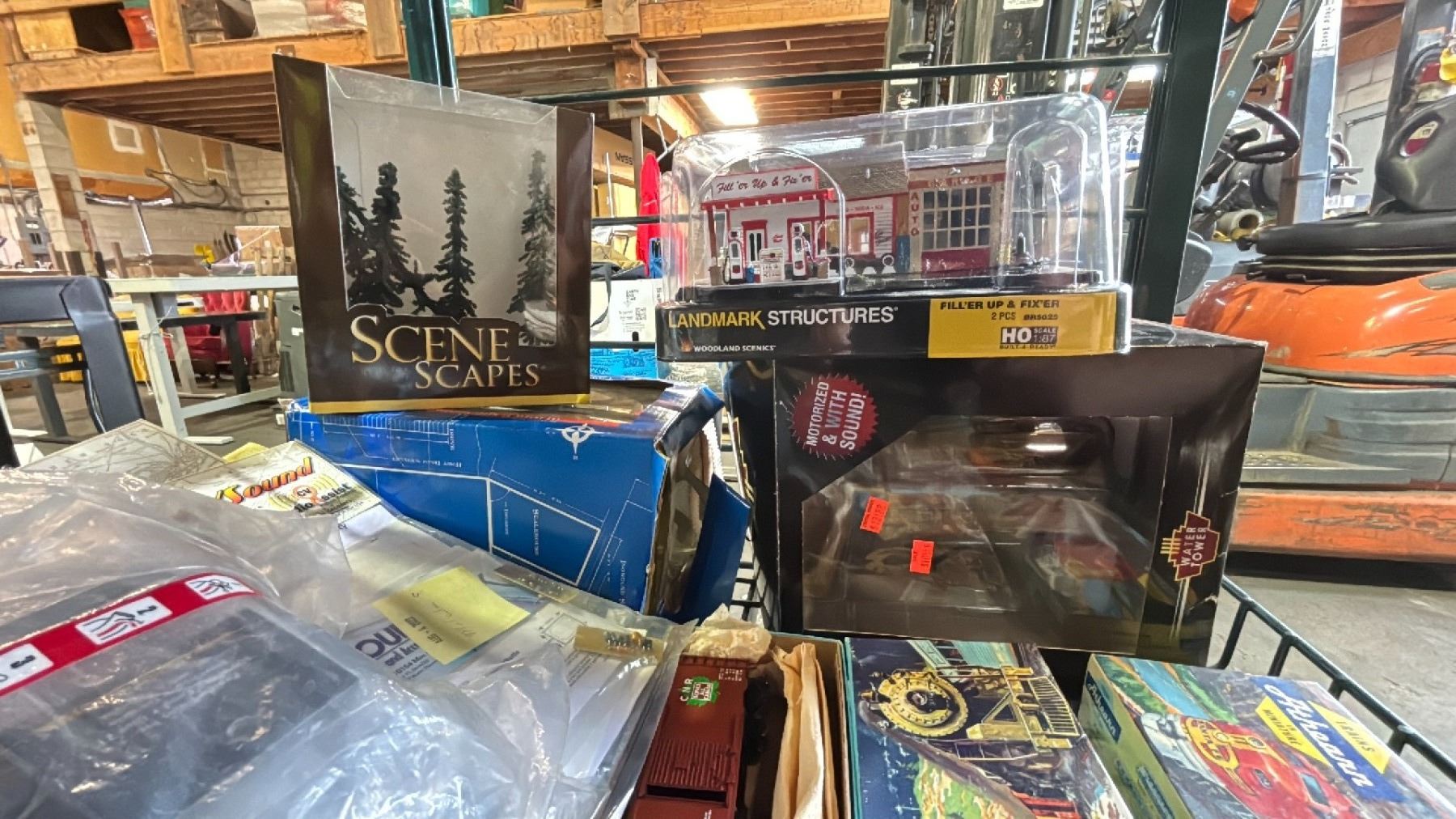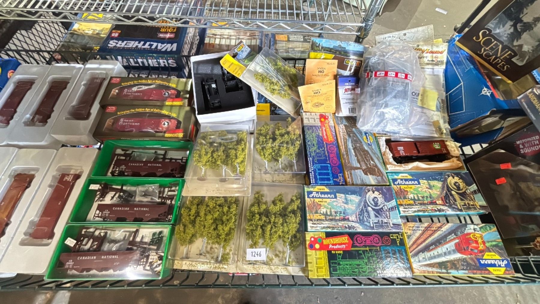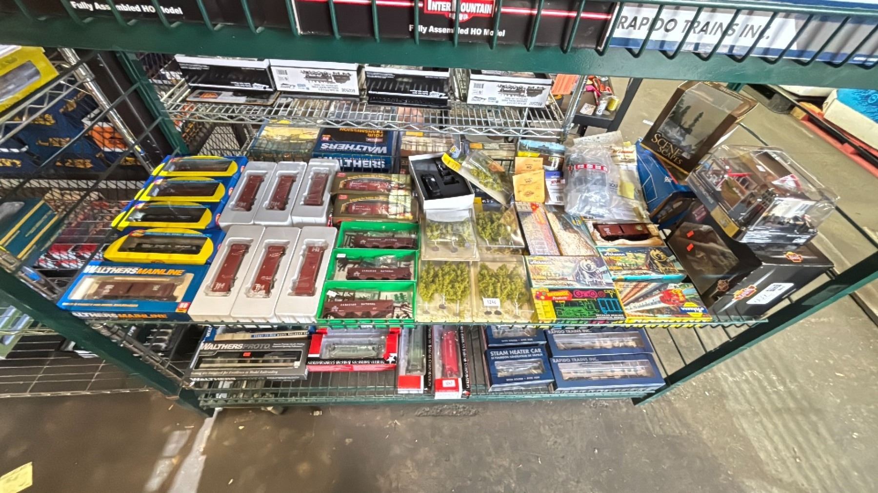 SHELF OF ASSORTED SCALE MODEL TRAINS & SCENERY