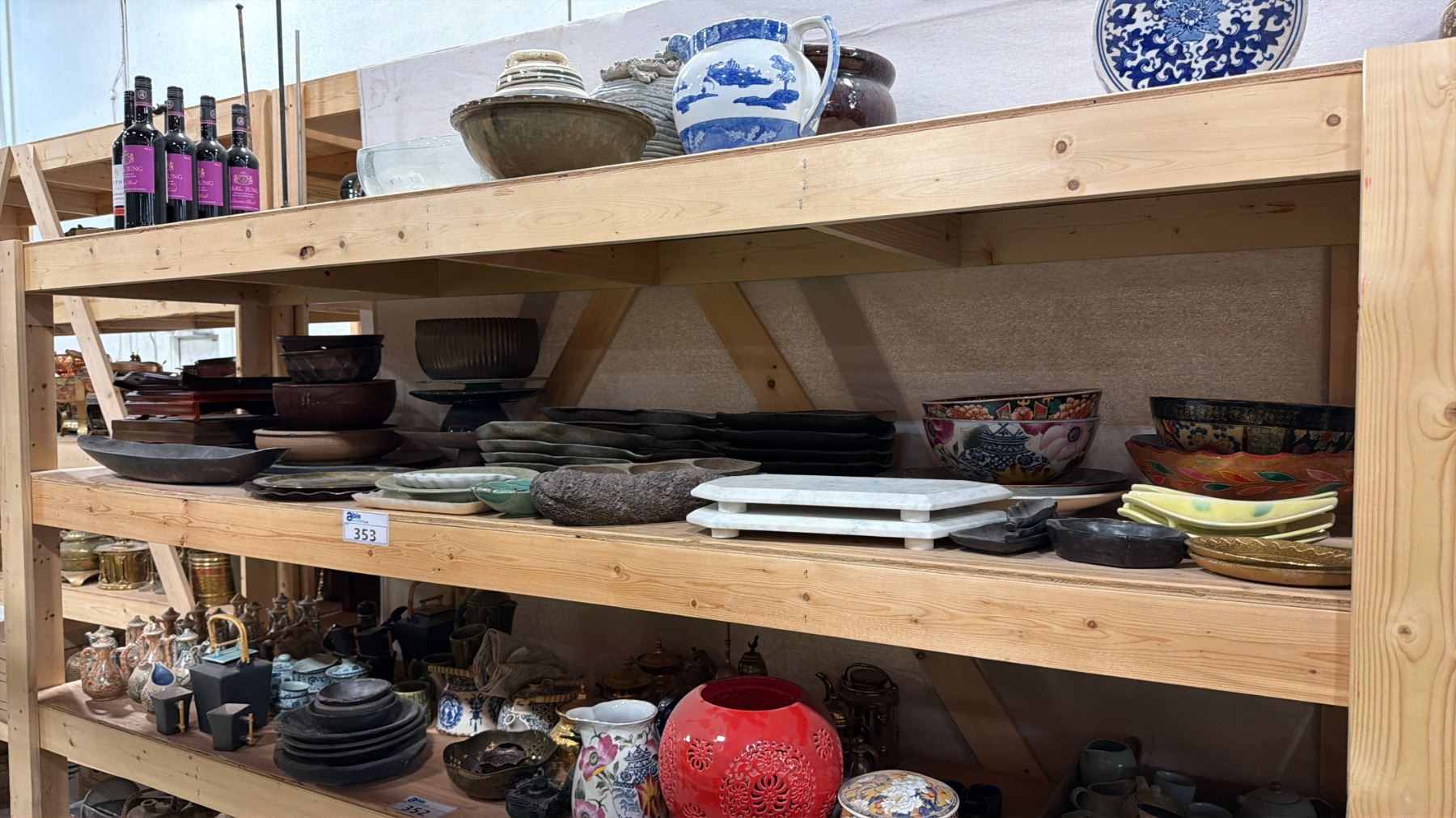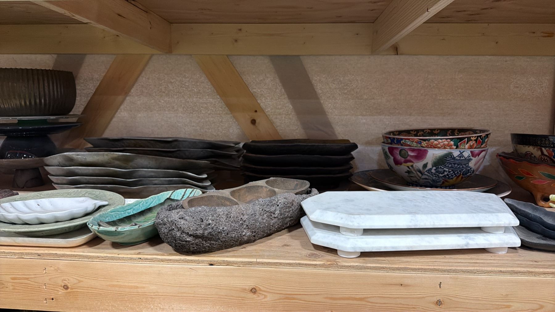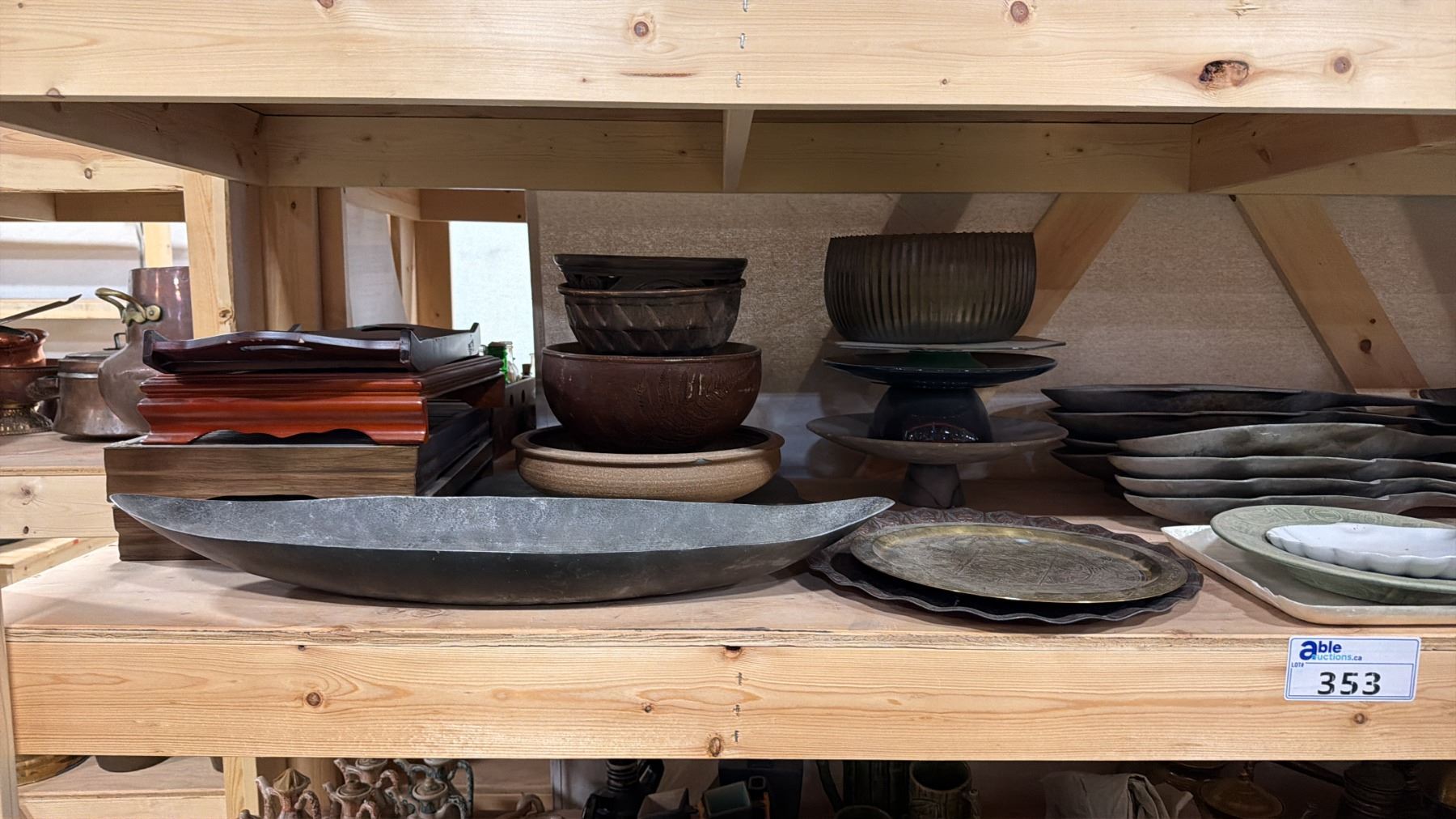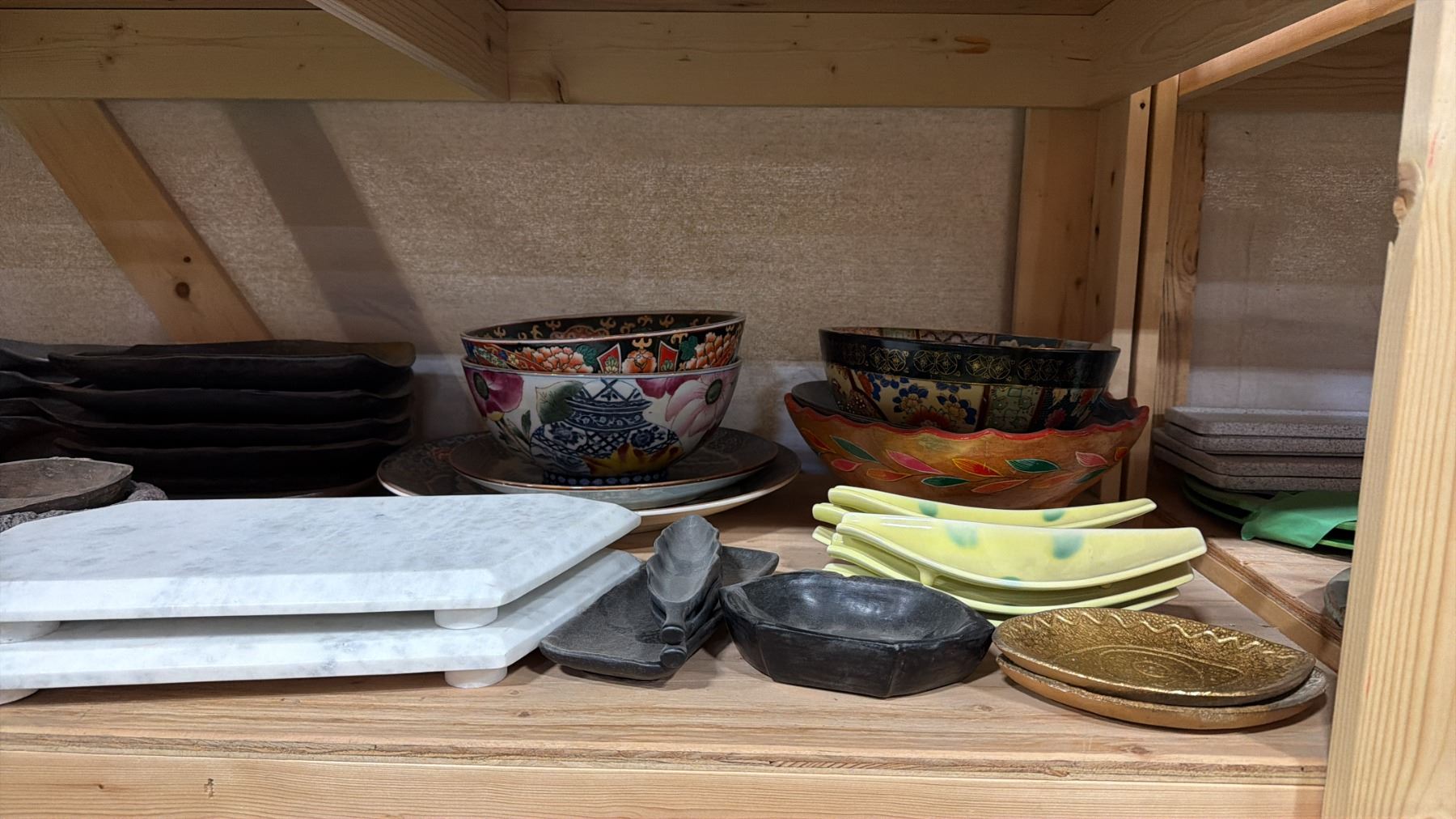 SHELF OF ASSORTED SERVING PLATES/BOWLS