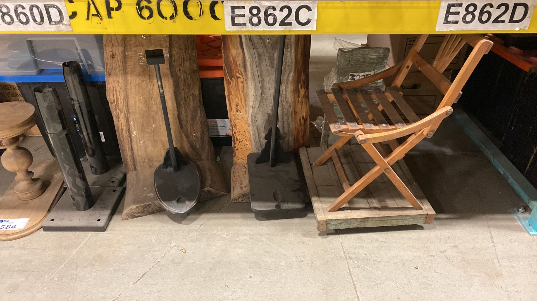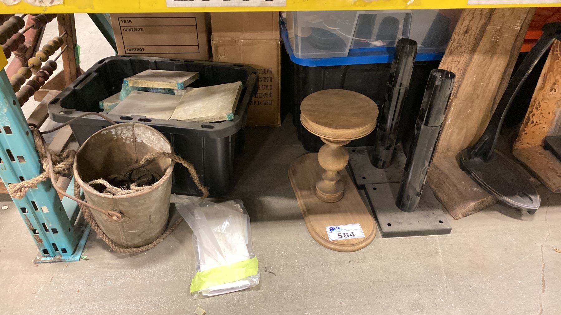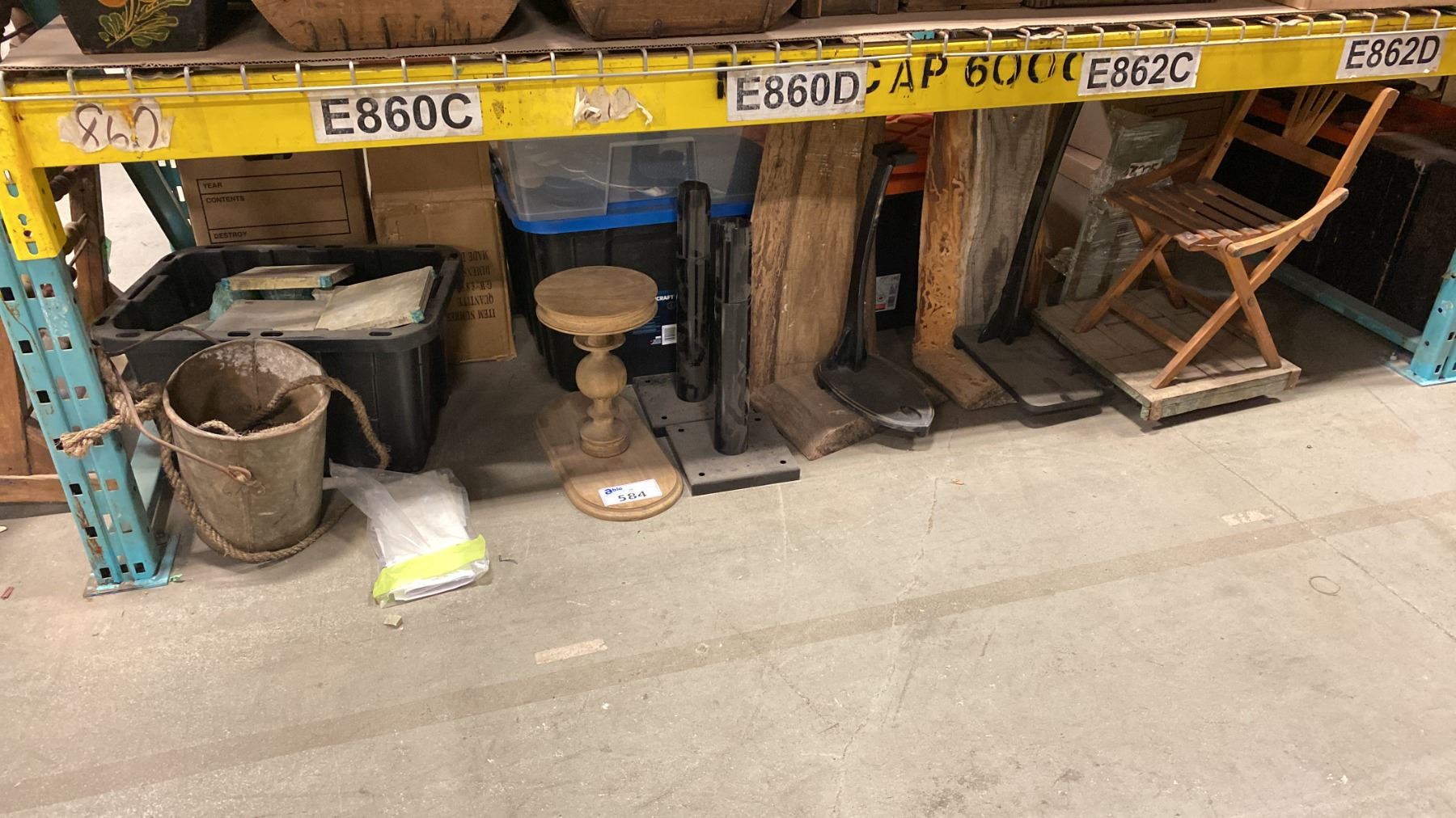 SHELF OF ASSORTED SET DEC ITEMS INCLUDING WINDCHIMES, WOODEN STANDS, ASSORTED SHOES, WICKER BAGS, CANDLE STANDS & MORE