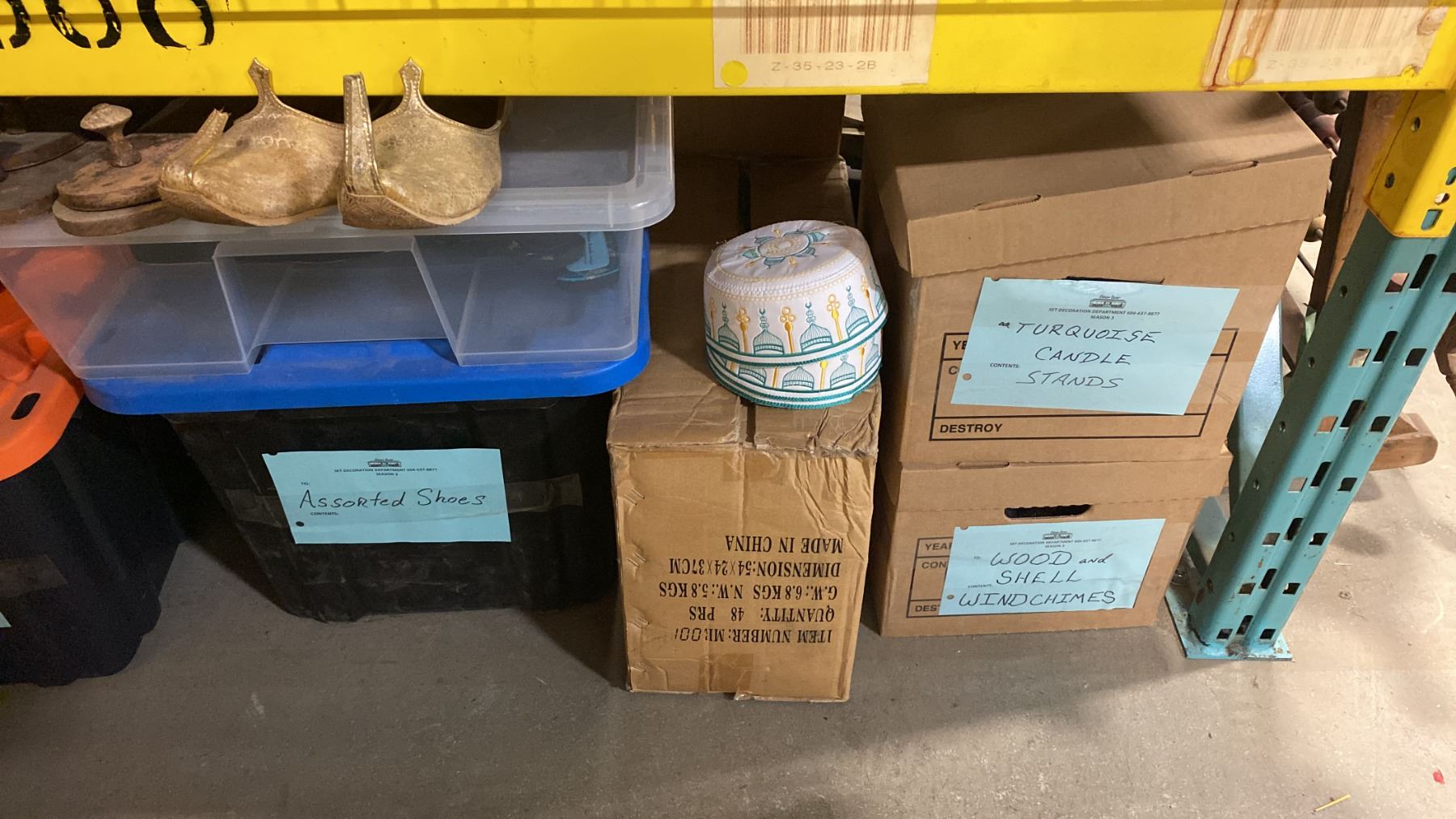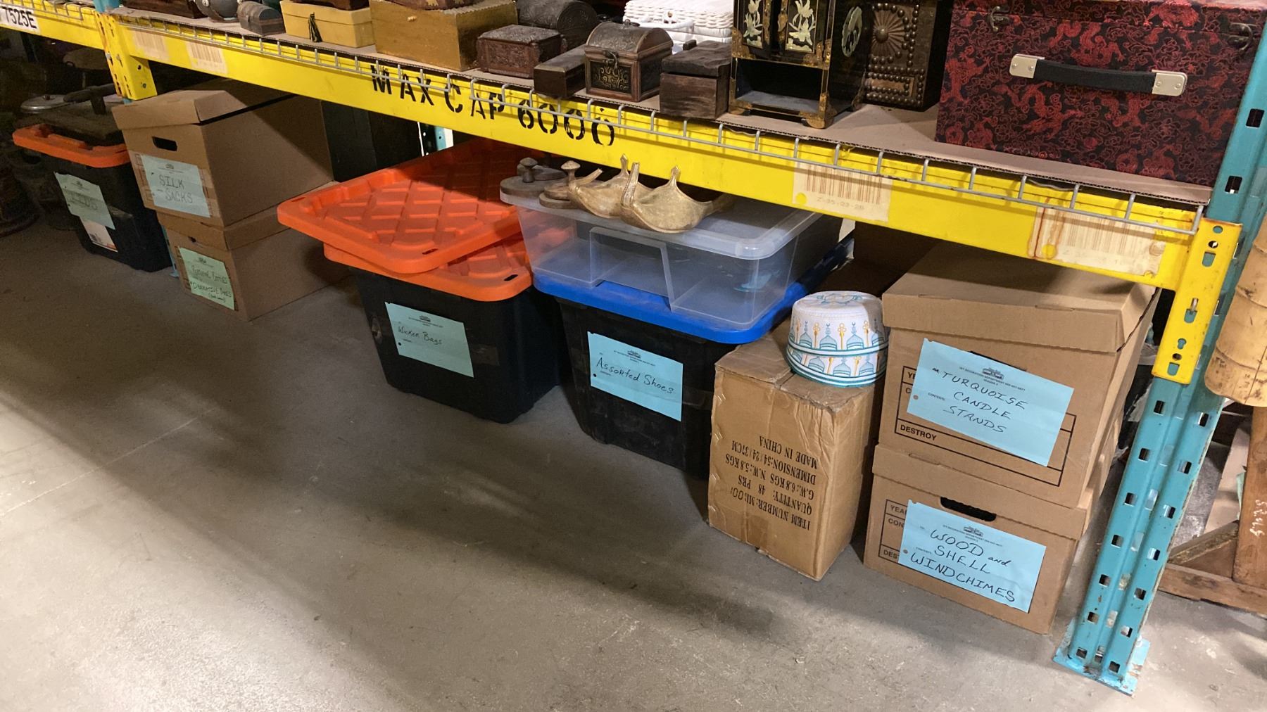 SHELF OF ASSORTED SET DEC ITEMS INCLUDING WINDCHIMES, WOODEN STANDS, ASSORTED SHOES, WICKER BAGS,