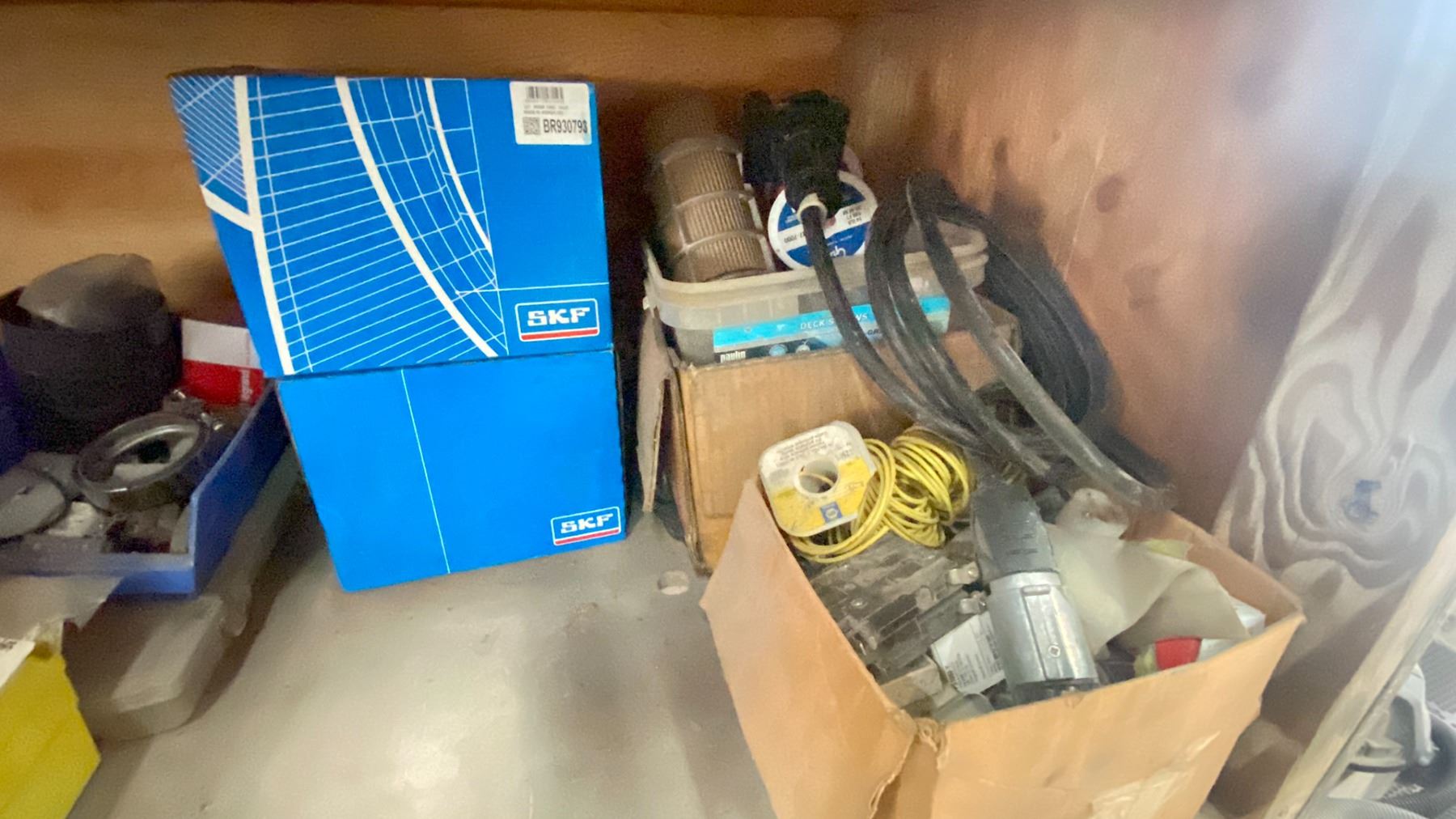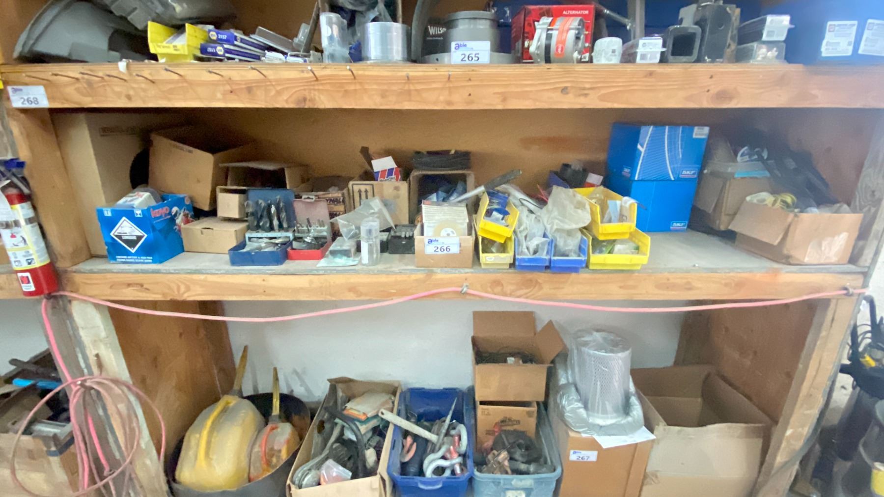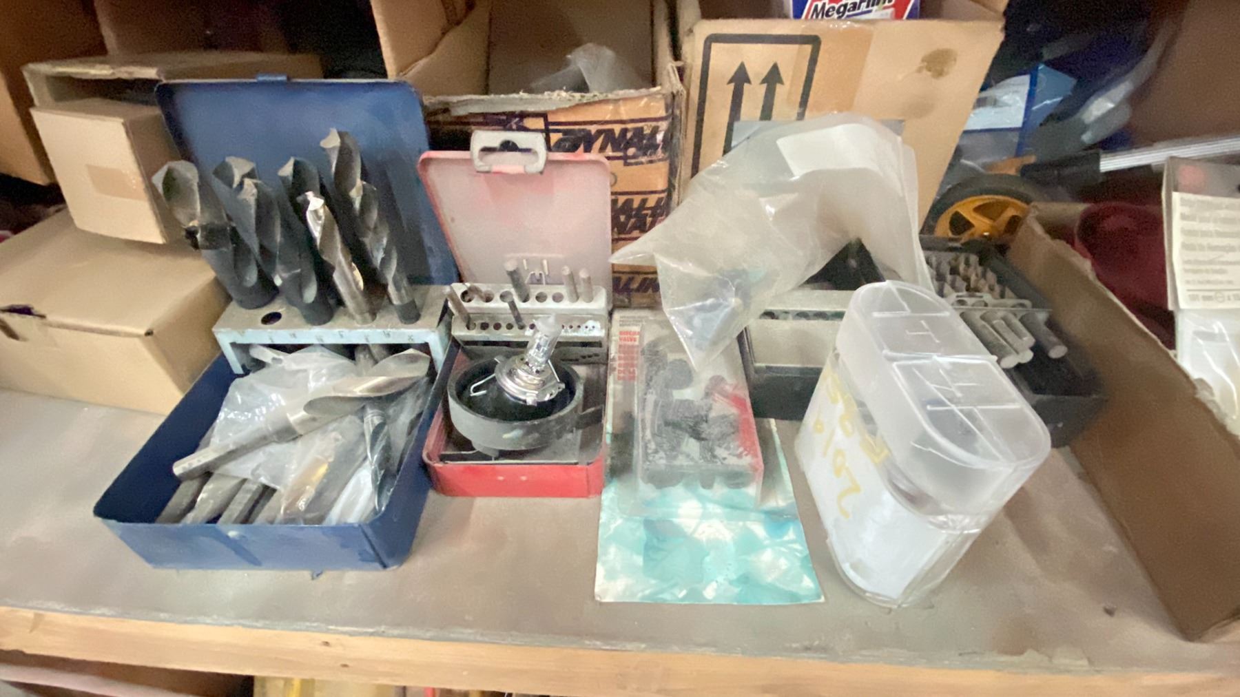 SHELF OF ASSORTED SHOP ITEMS INCLUDING INDUSTRIAL DRILL BITS AND ELECTRICAL PARTS/WIRES