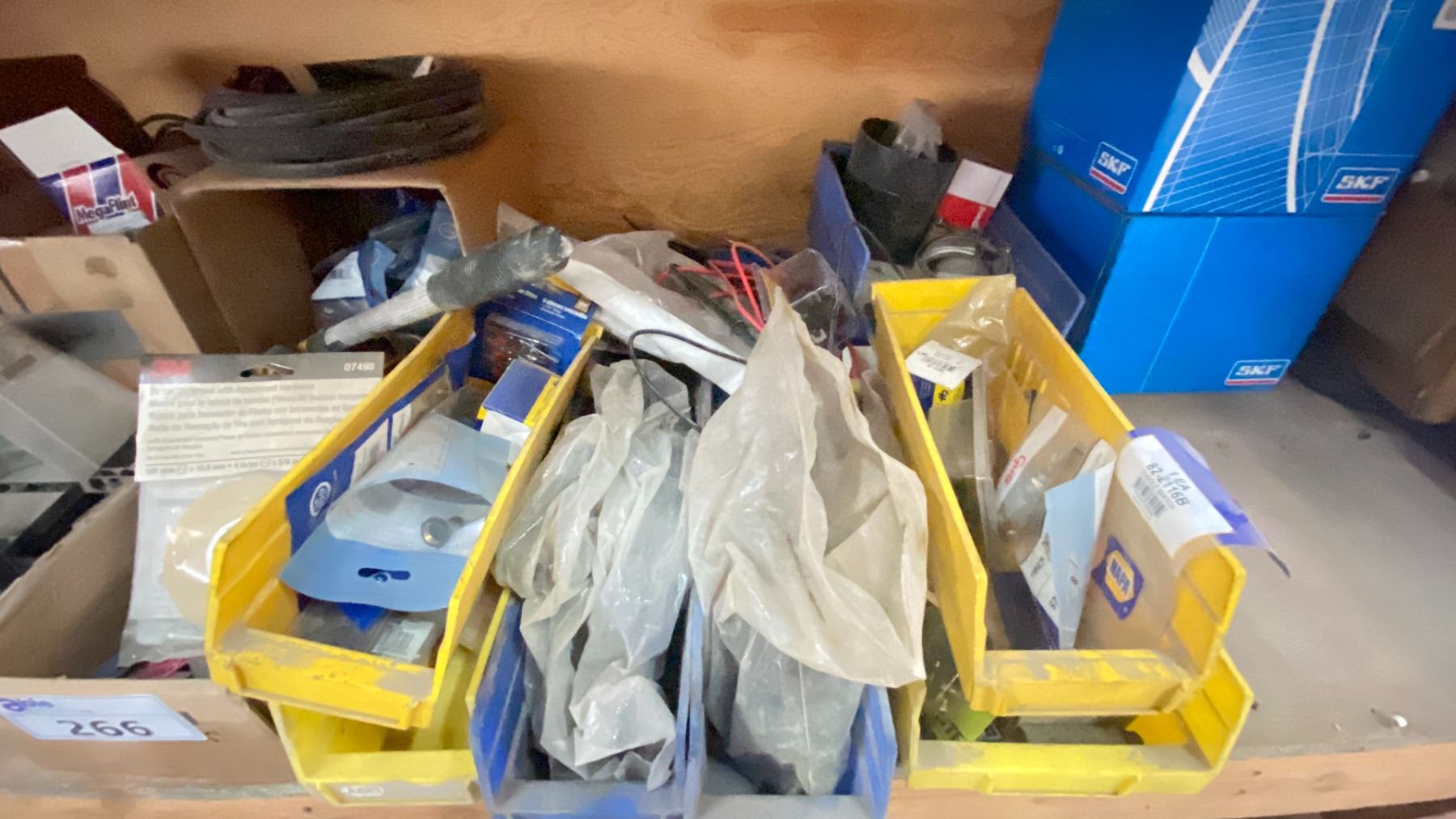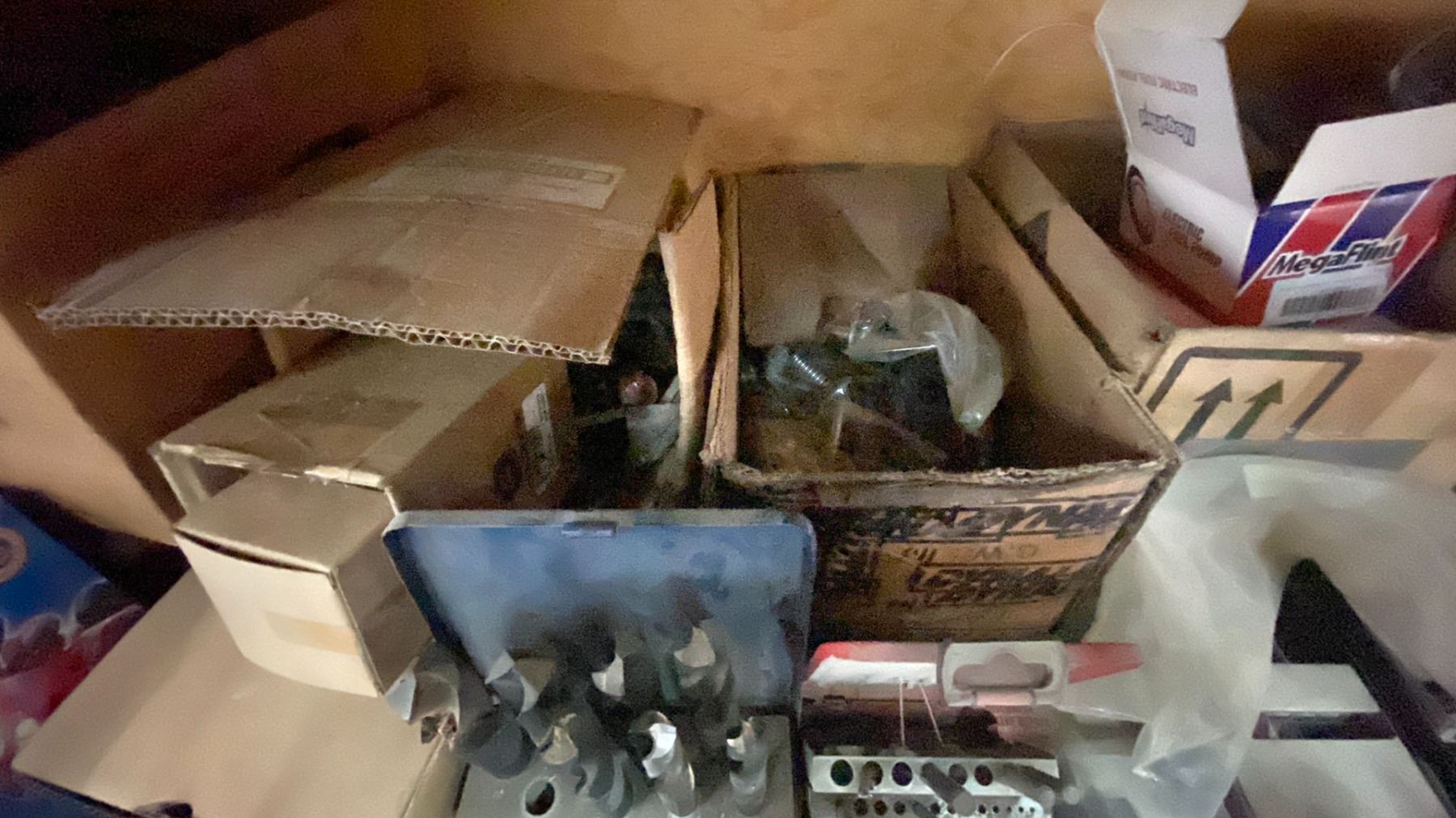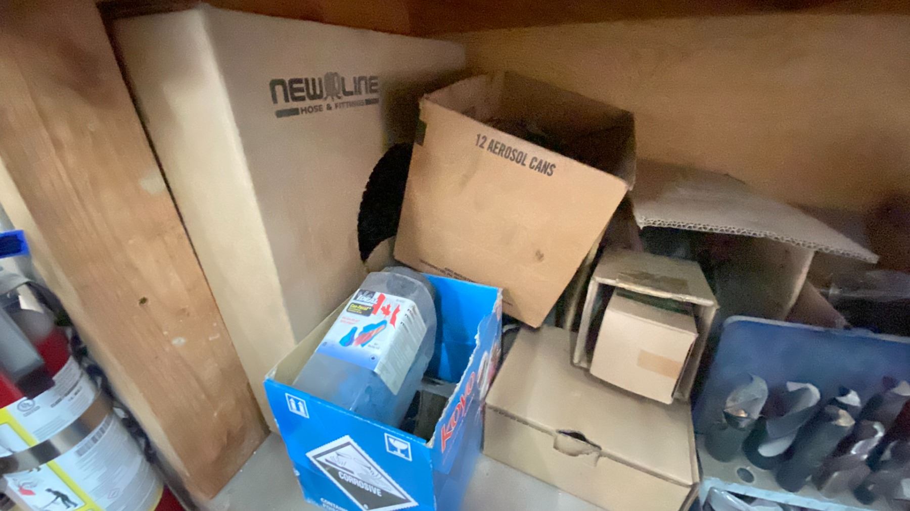 SHELF OF ASSORTED SHOP ITEMS INCLUDING INDUSTRIAL DRILL BITS AND ELECTRICAL PARTS/WIRES