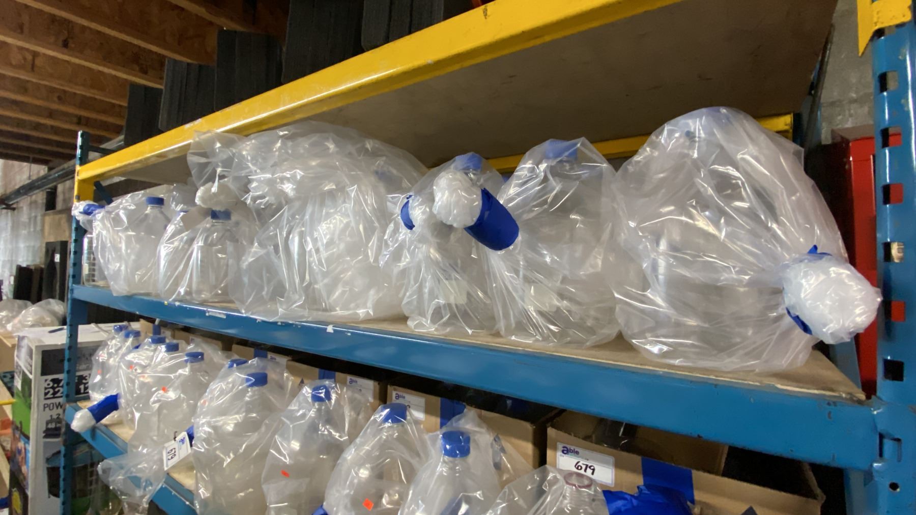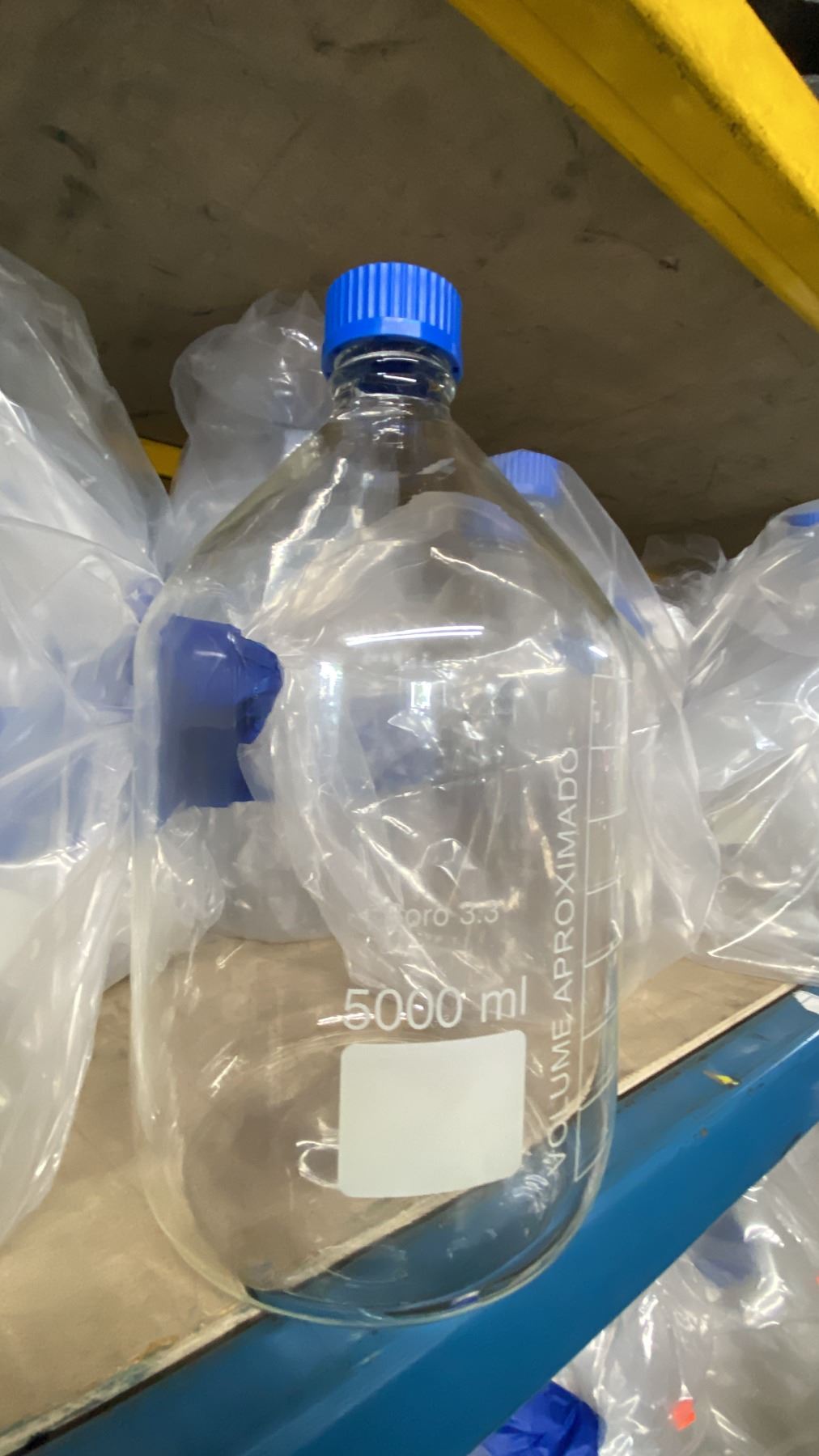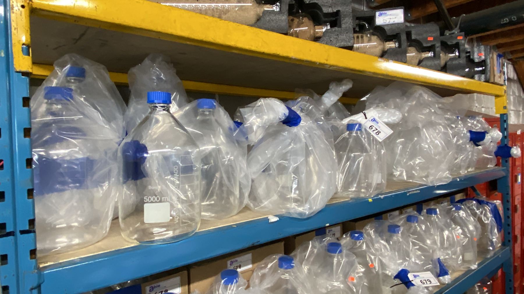 SHELF OF ASSORTED SIZE LABORATORY GRADE GLASS MEDIA STORAGE BOTTLES