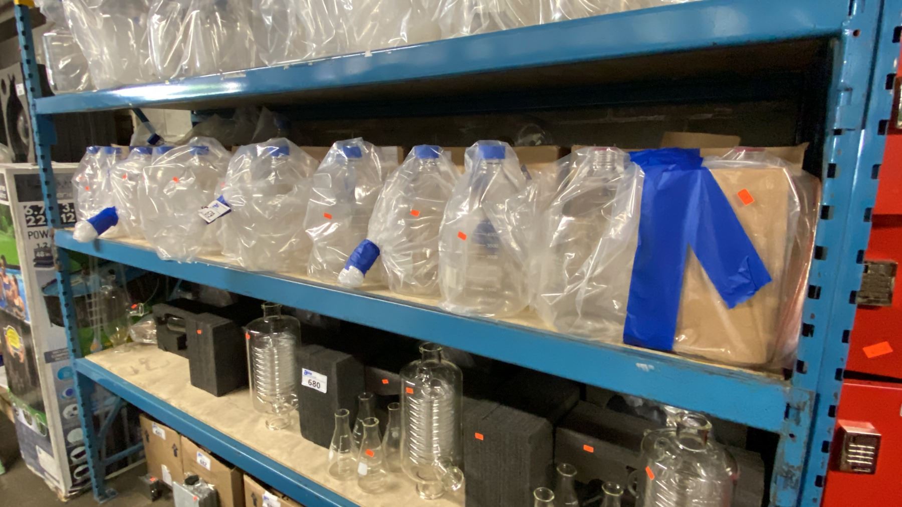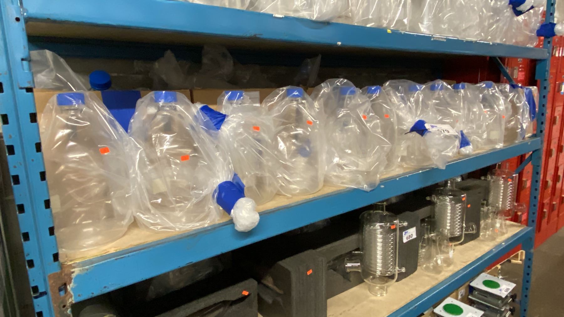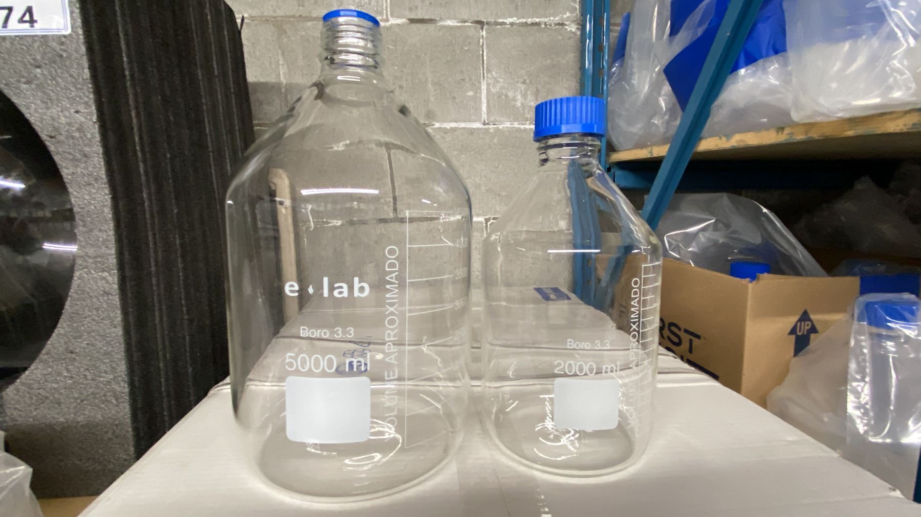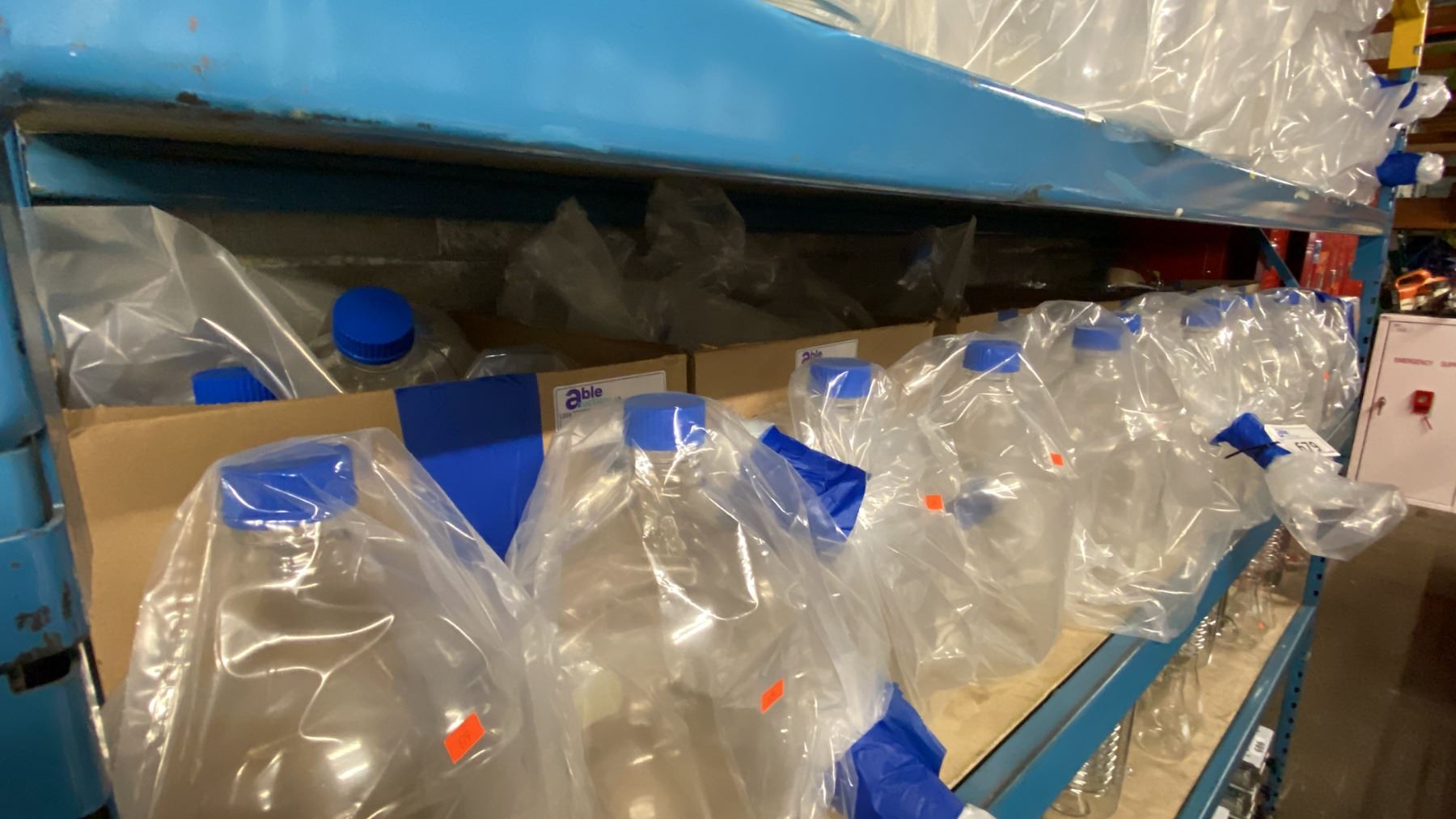 SHELF OF ASSORTED SIZE LABORATORY GRADE GLASS MEDIA STORAGE BOTTLES