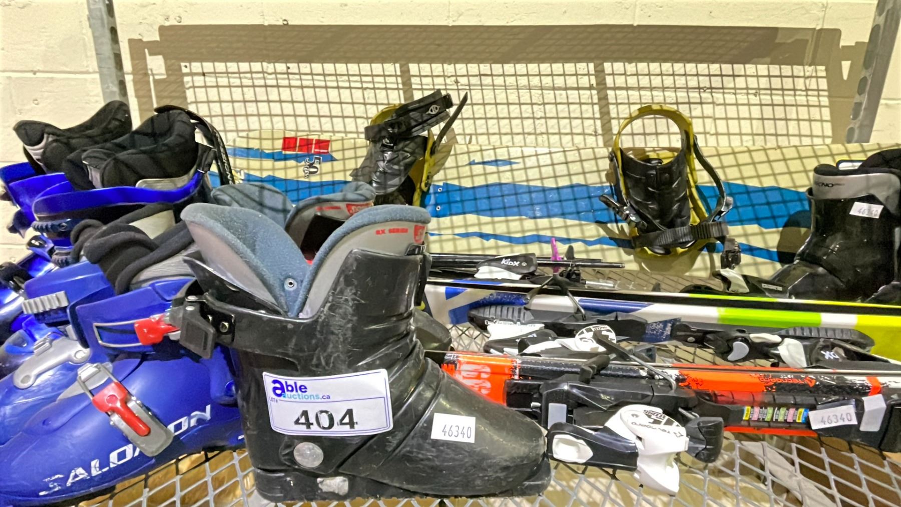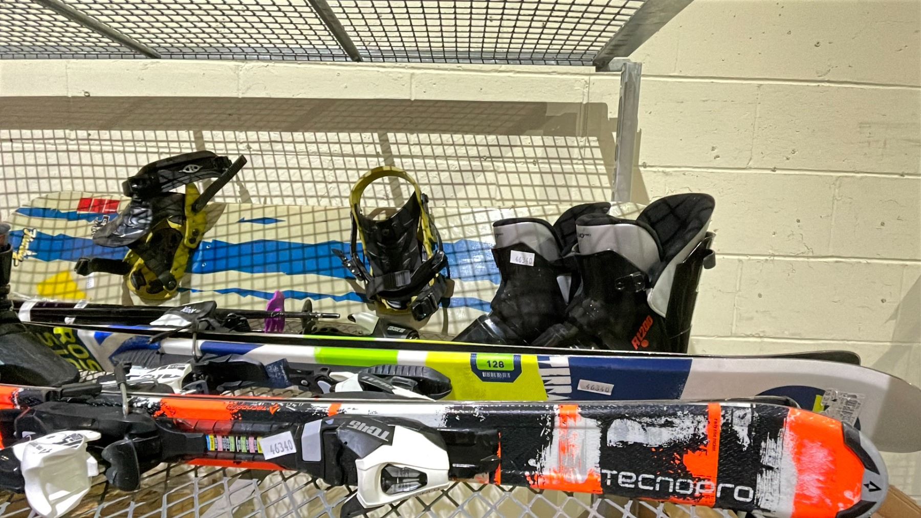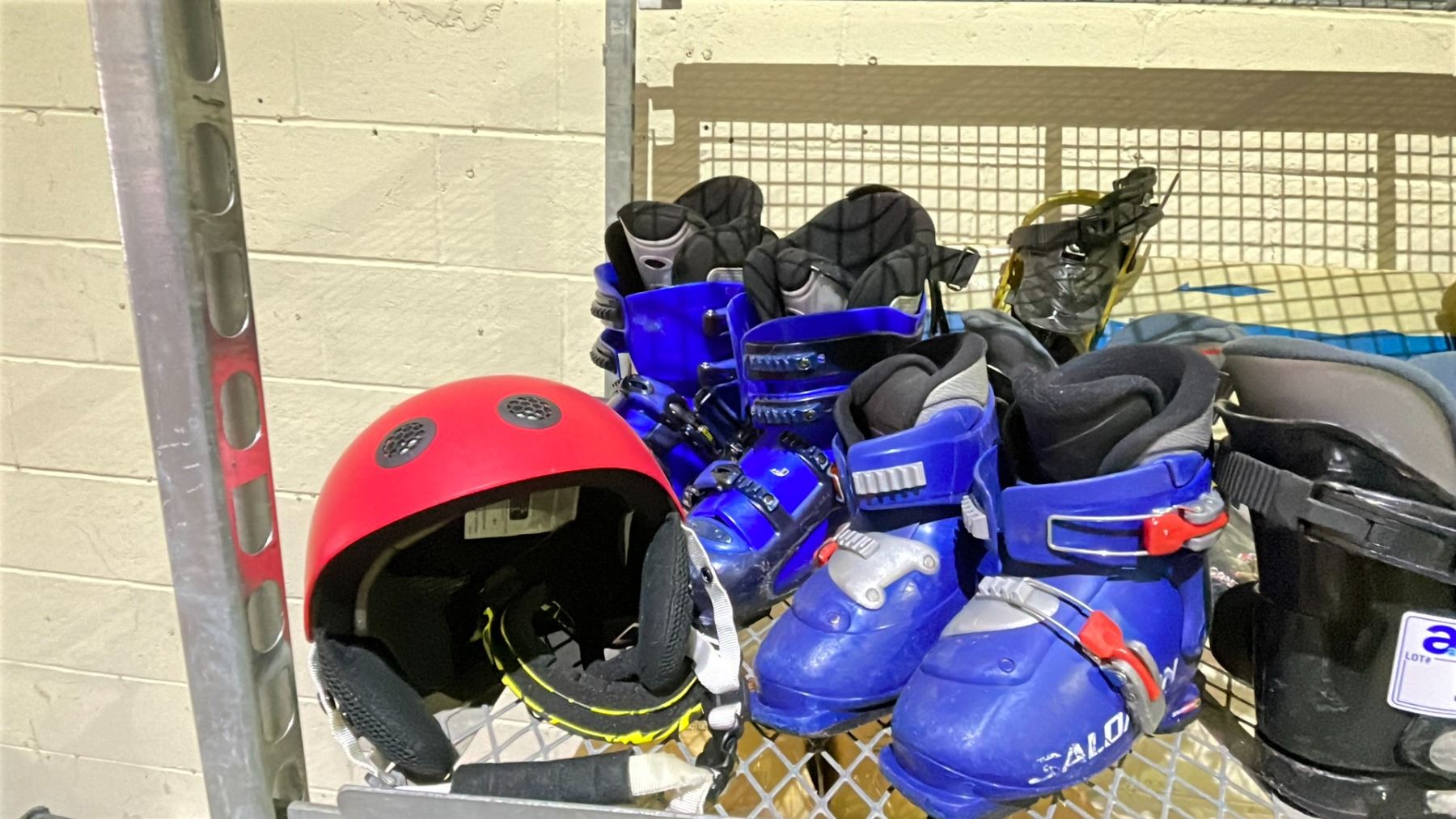 SHELF OF ASSORTED SKIS, SNOWBOARDS, HELMET & MORE