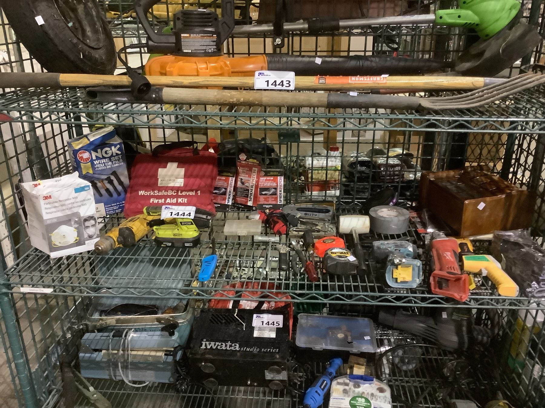 SHELF OF ASSORTED SMALL HAND TOOLS, MASKS, SEALER & MORE