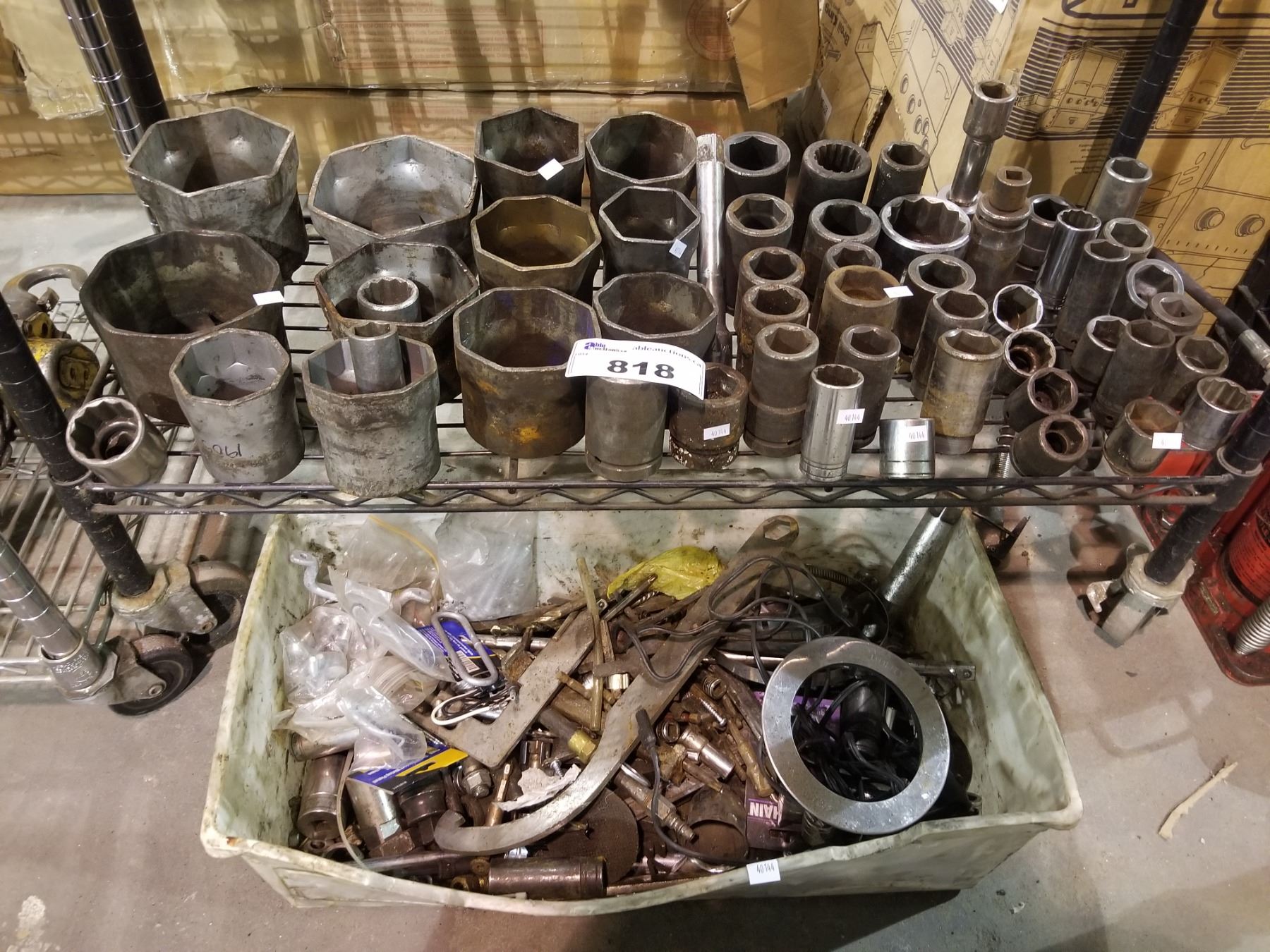 SHELF OF ASSORTED SOCKETS & BIN OF ASSORTED TOOLS