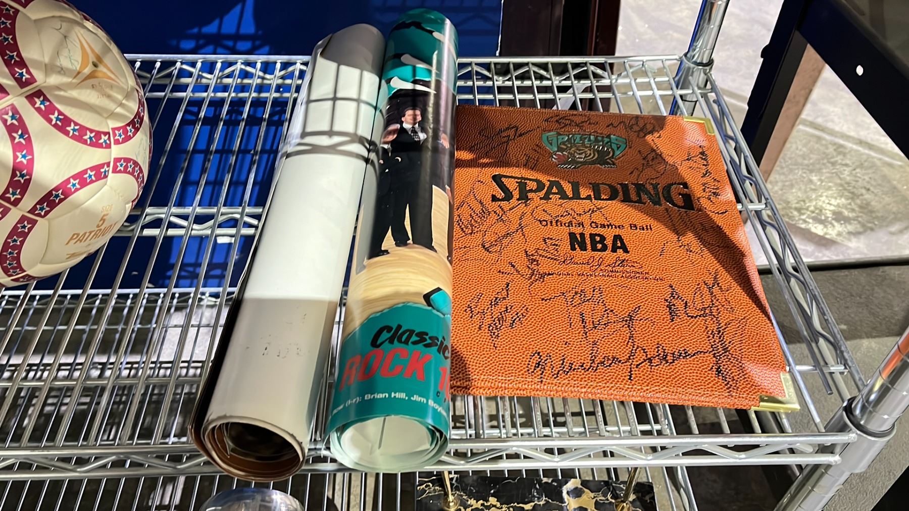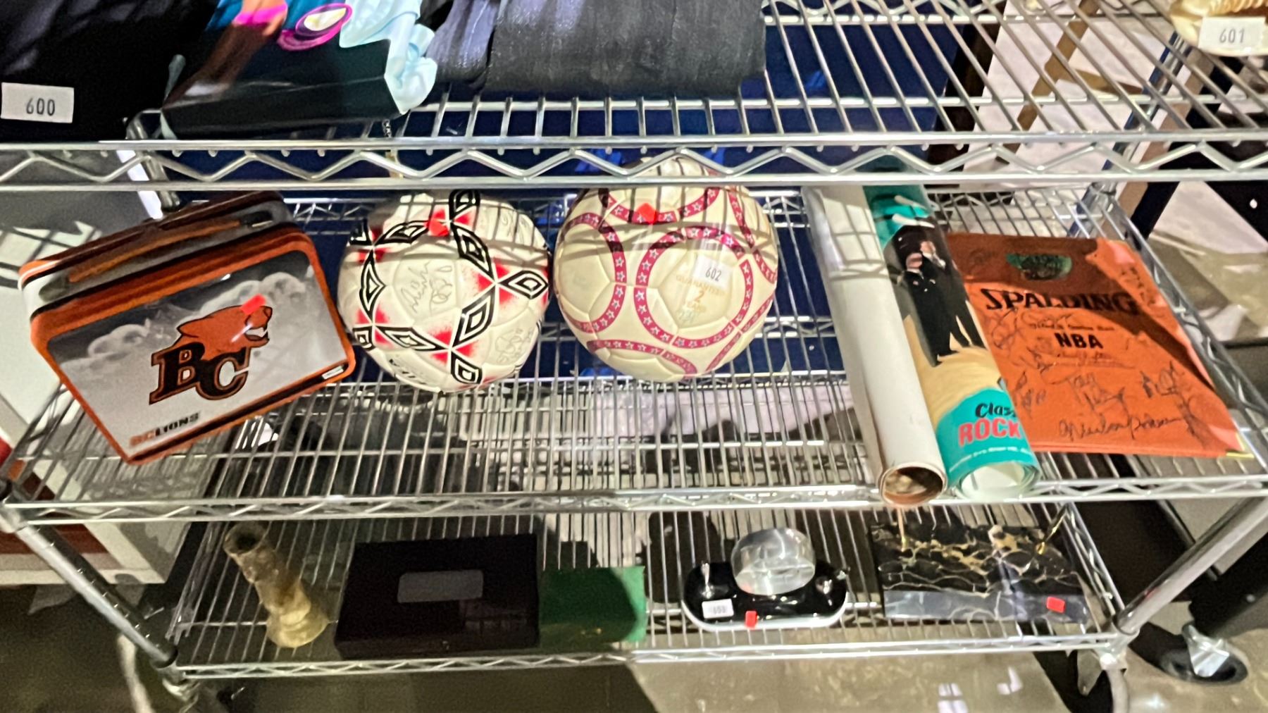 SHELF OF ASSORTED SPORTS COLLECTIBLES INCLUDING; BC LIONS LUNCHBOX, AUTOGRAPHED SOCCER BALL, AUTOGRAPHED VANCOUVER GRIZZLIES BOOK & MORE