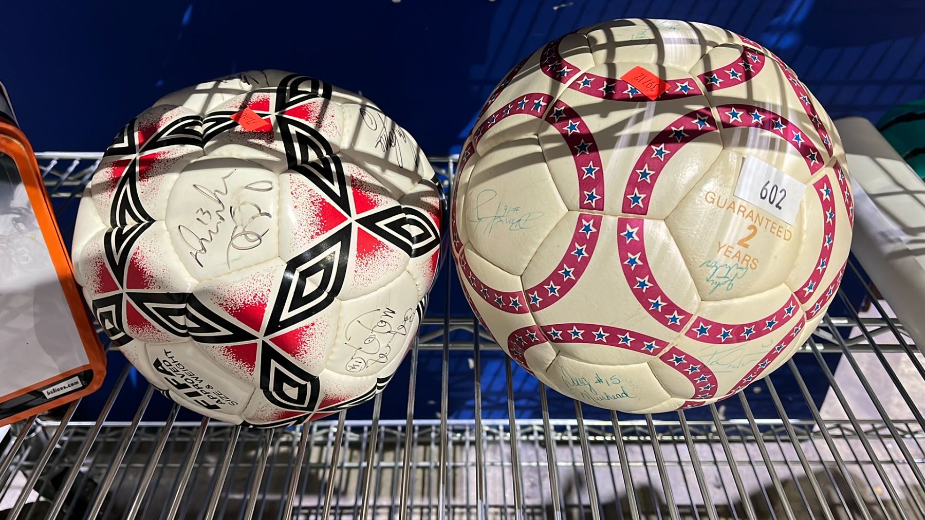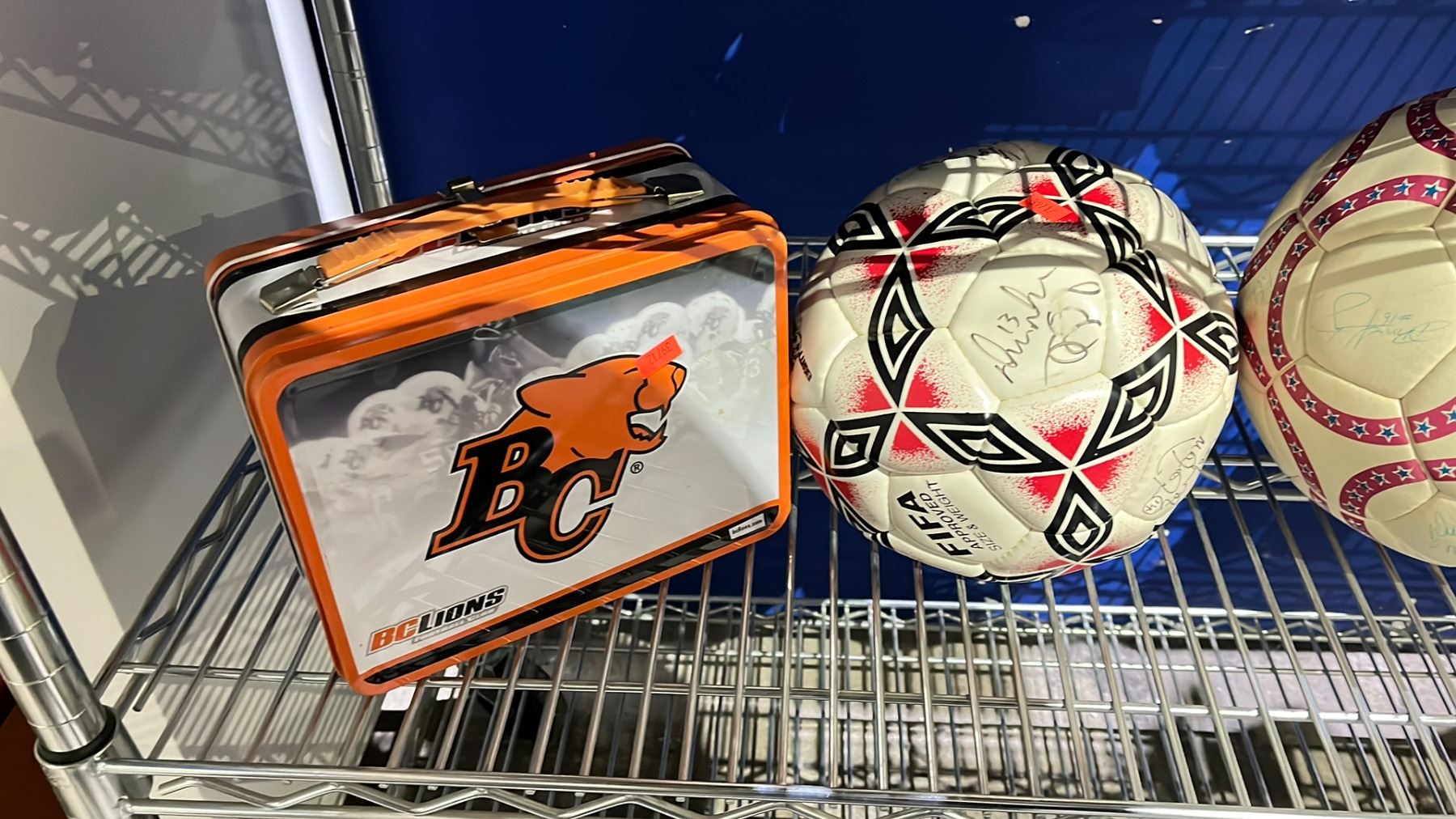 SHELF OF ASSORTED SPORTS COLLECTIBLES INCLUDING; BC LIONS LUNCHBOX, AUTOGRAPHED SOCCER BALL,