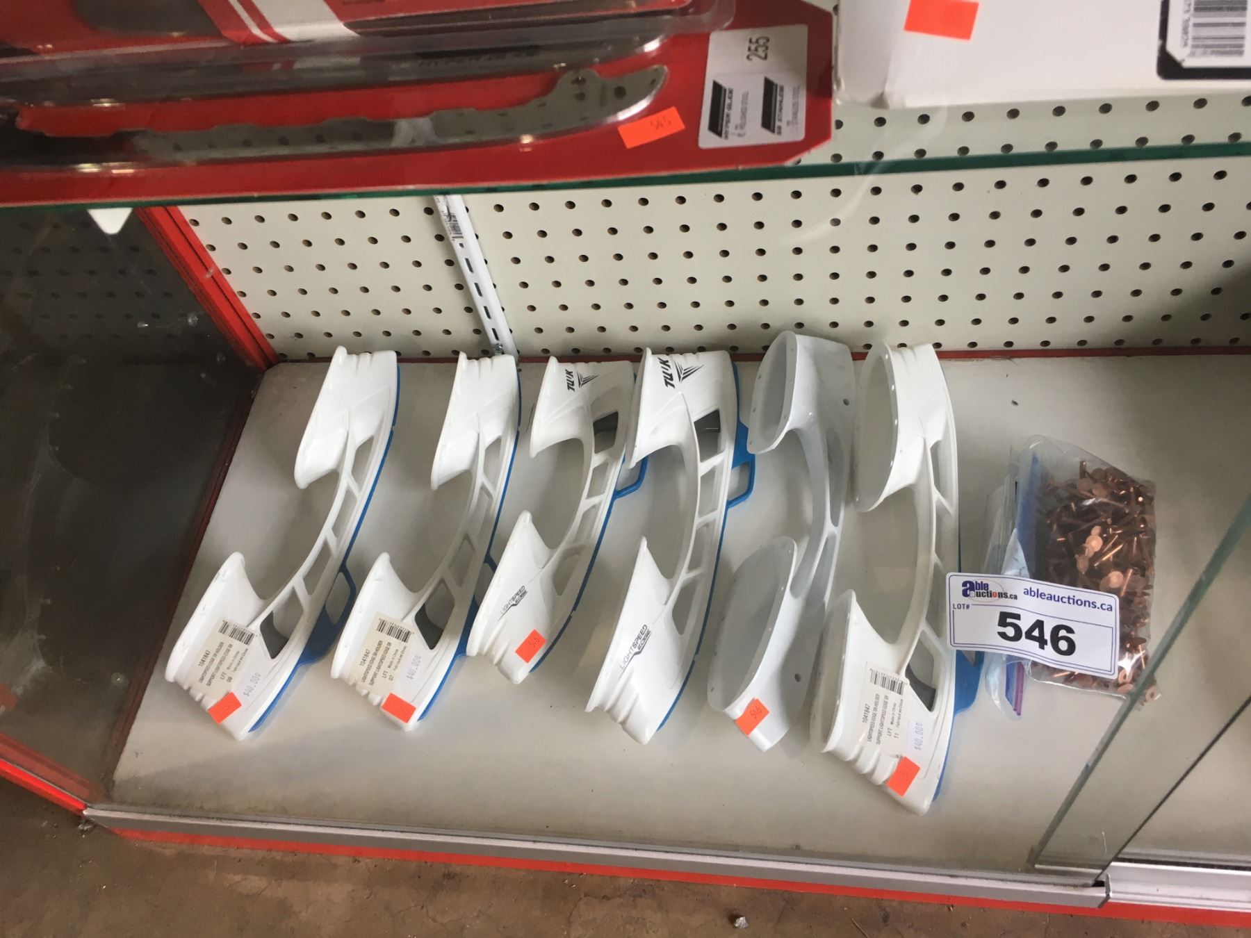 SHELF OF ASSORTED STEP PERFORMANCE SKATE BLADES AND SKATE BAG