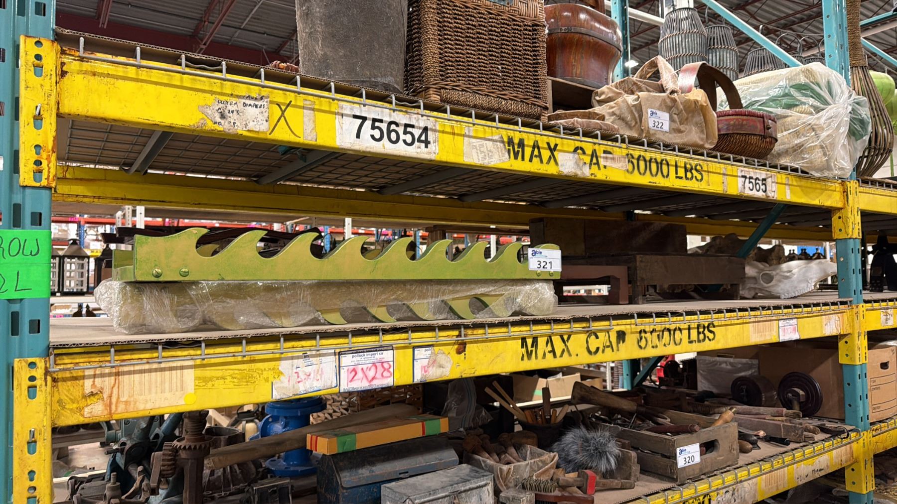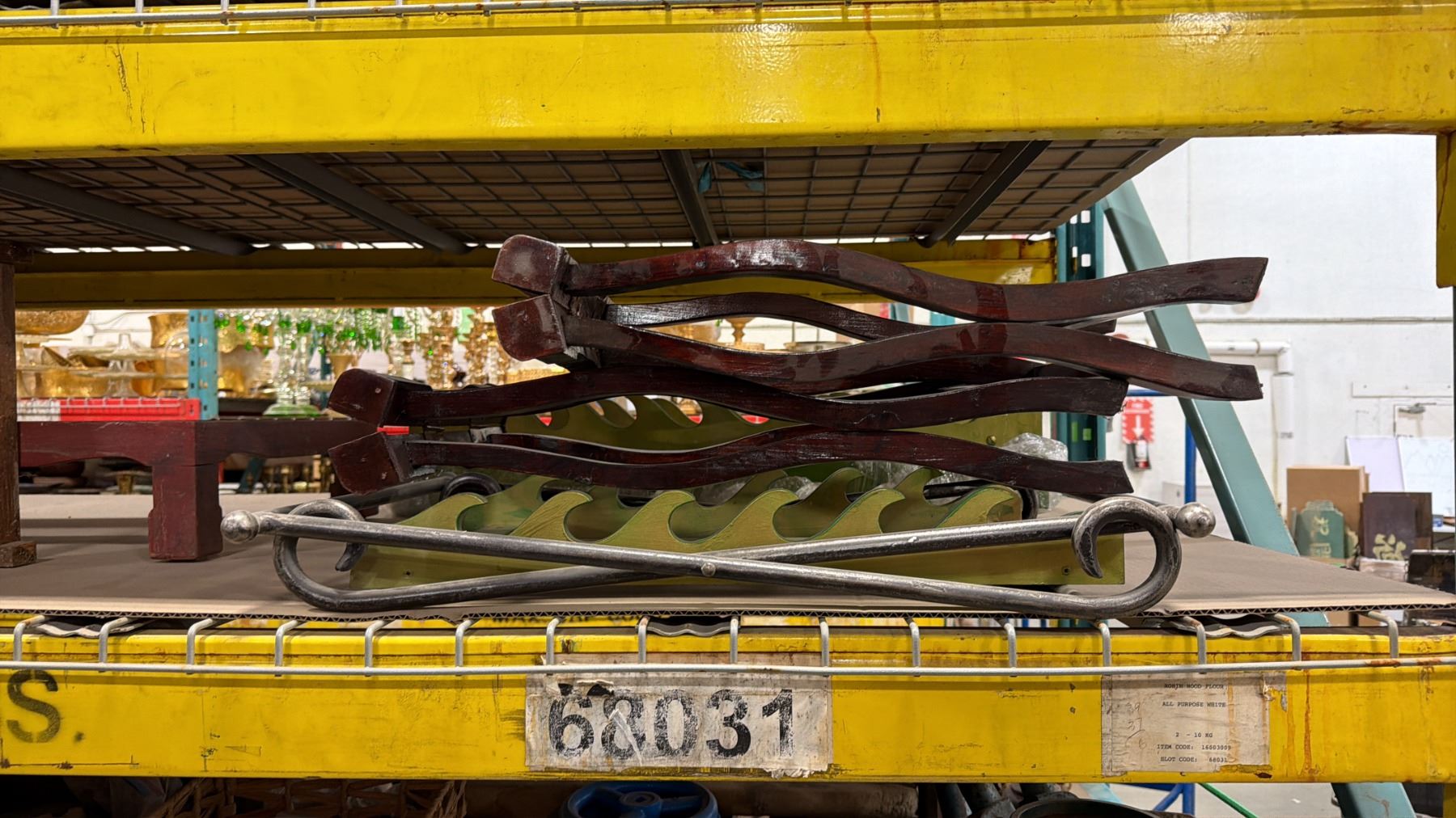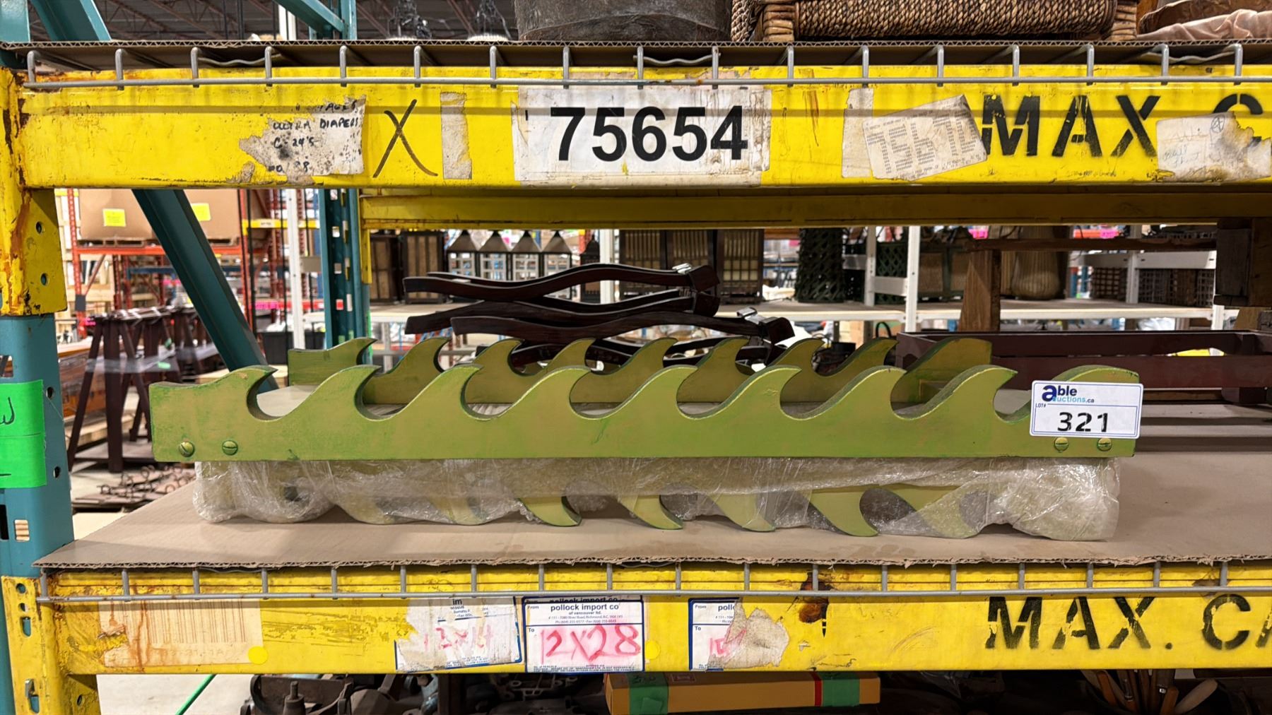 SHELF OF ASSORTED SWORD STANDS & PLANT STANDS