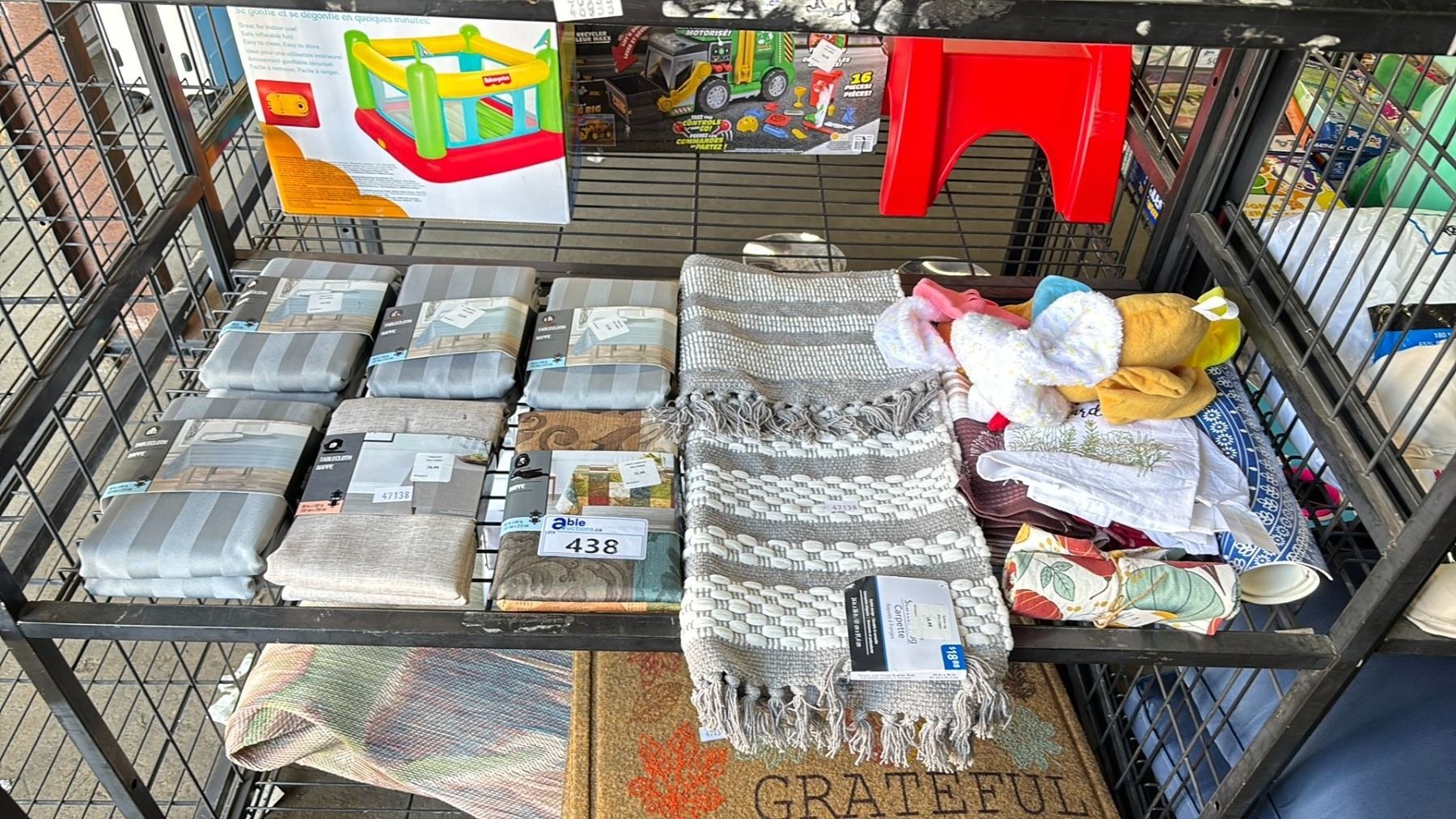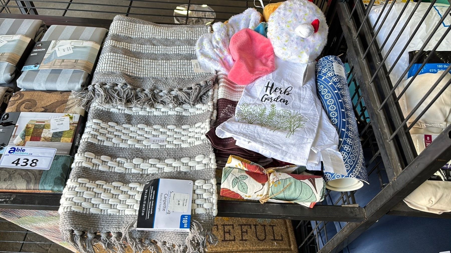 SHELF OF ASSORTED TABLE CLOTHS, TEA TOWELS, PLACE MATS 24" X 36" SCATTER RUG